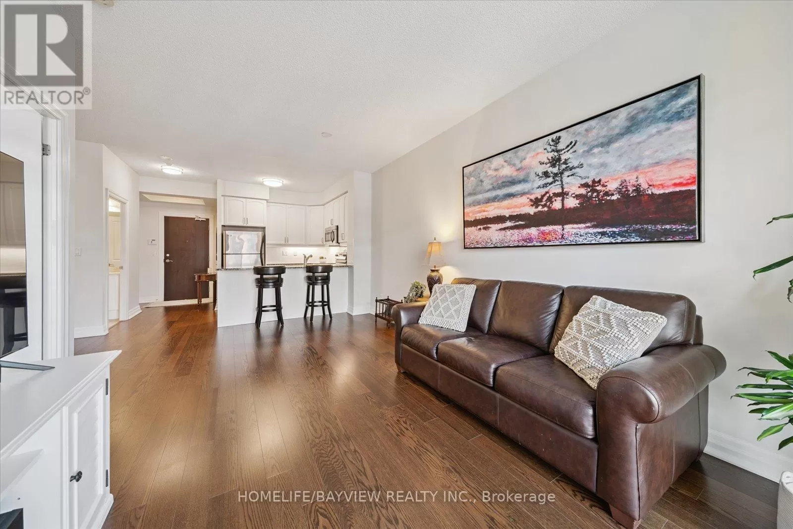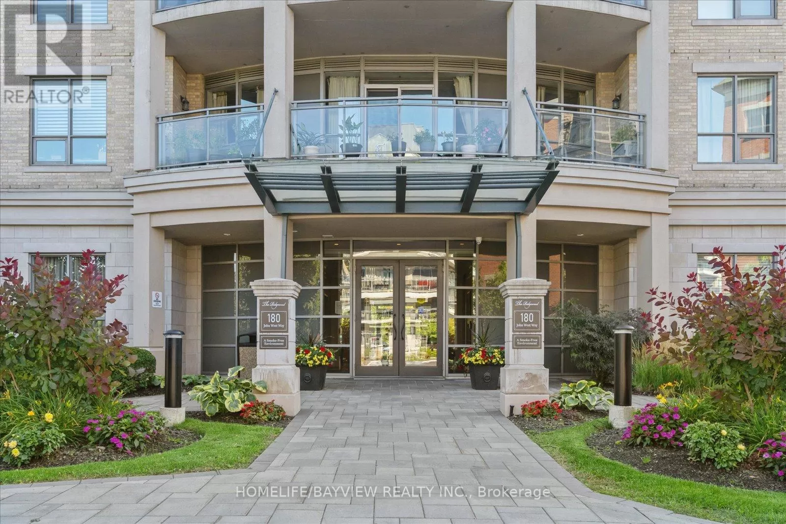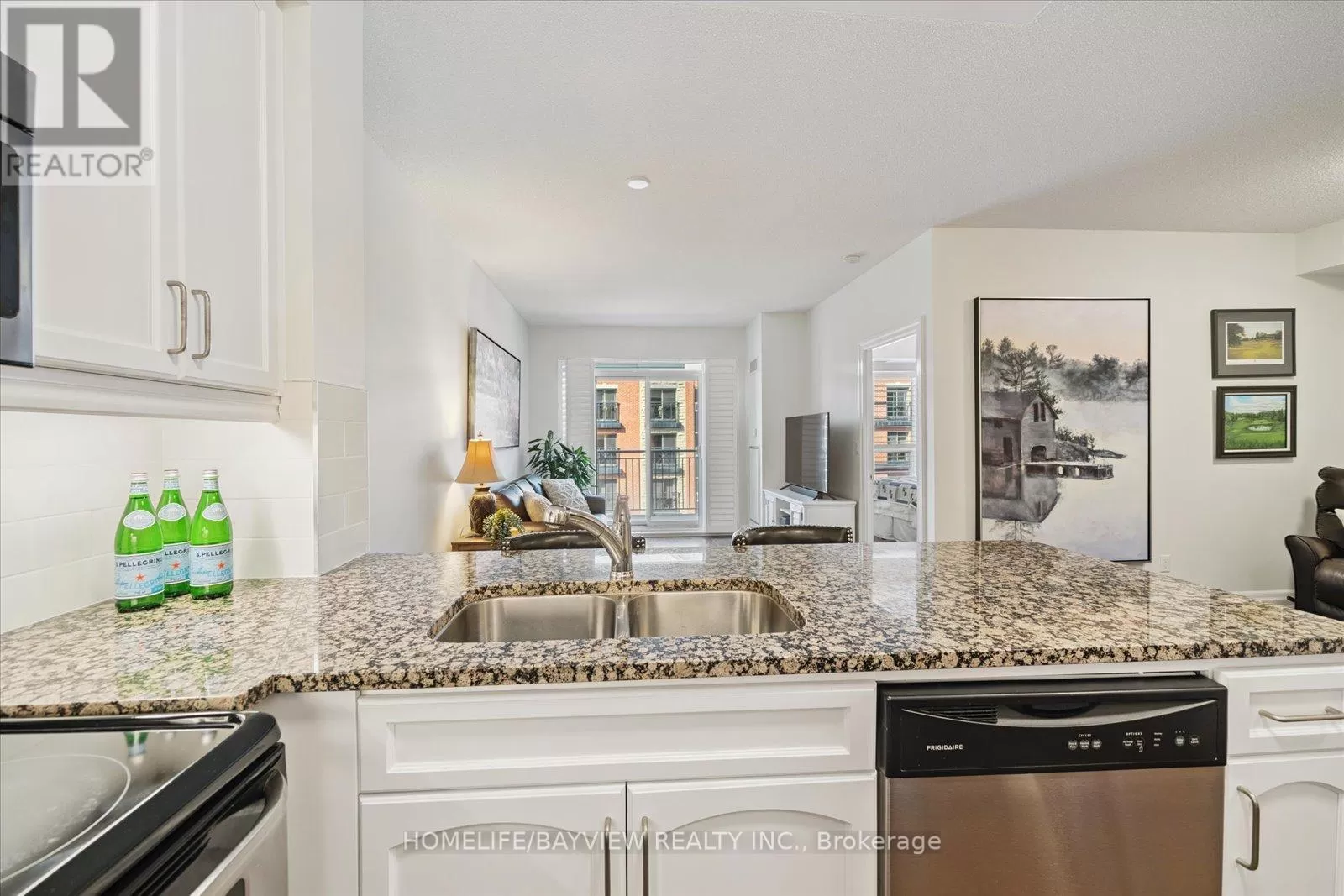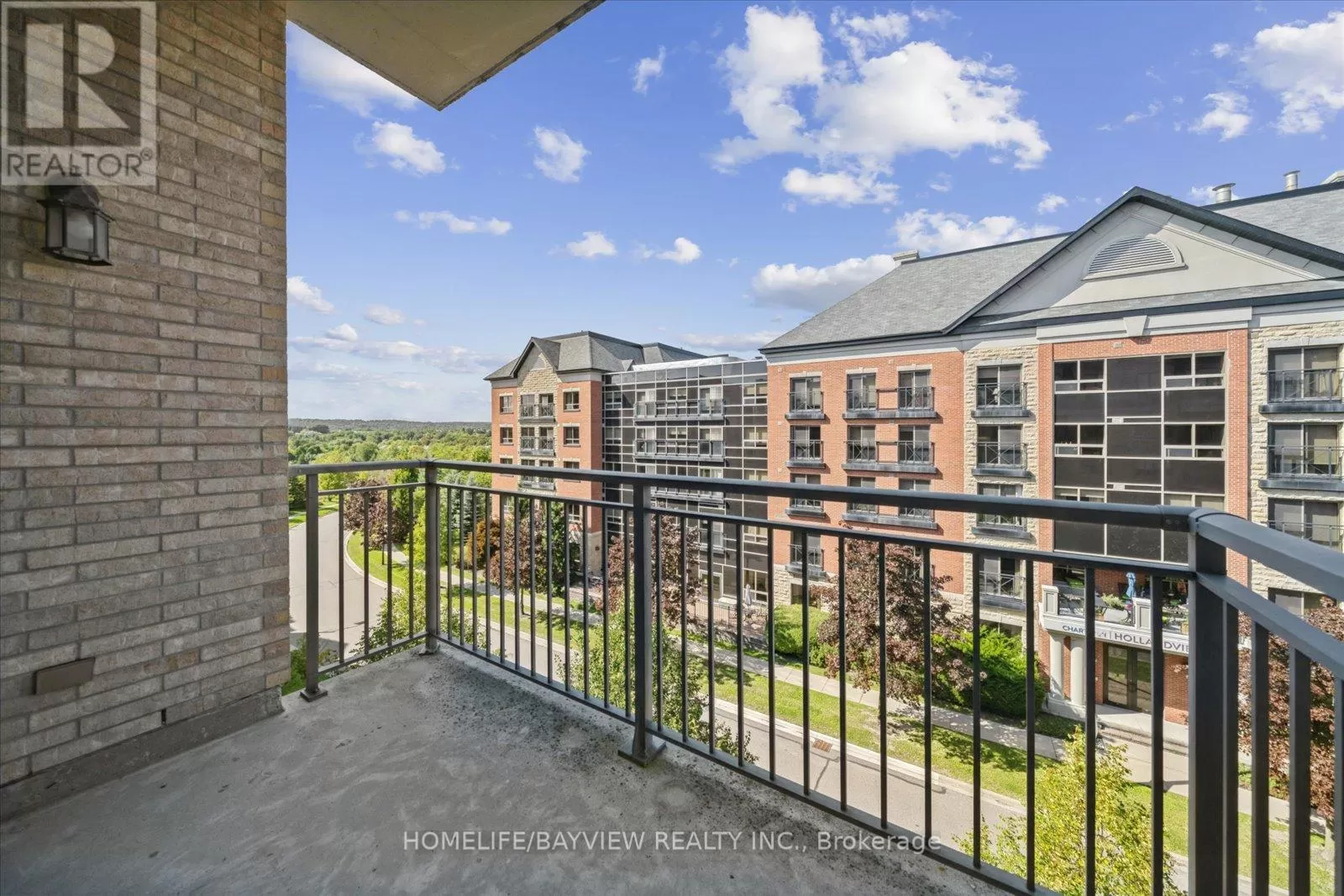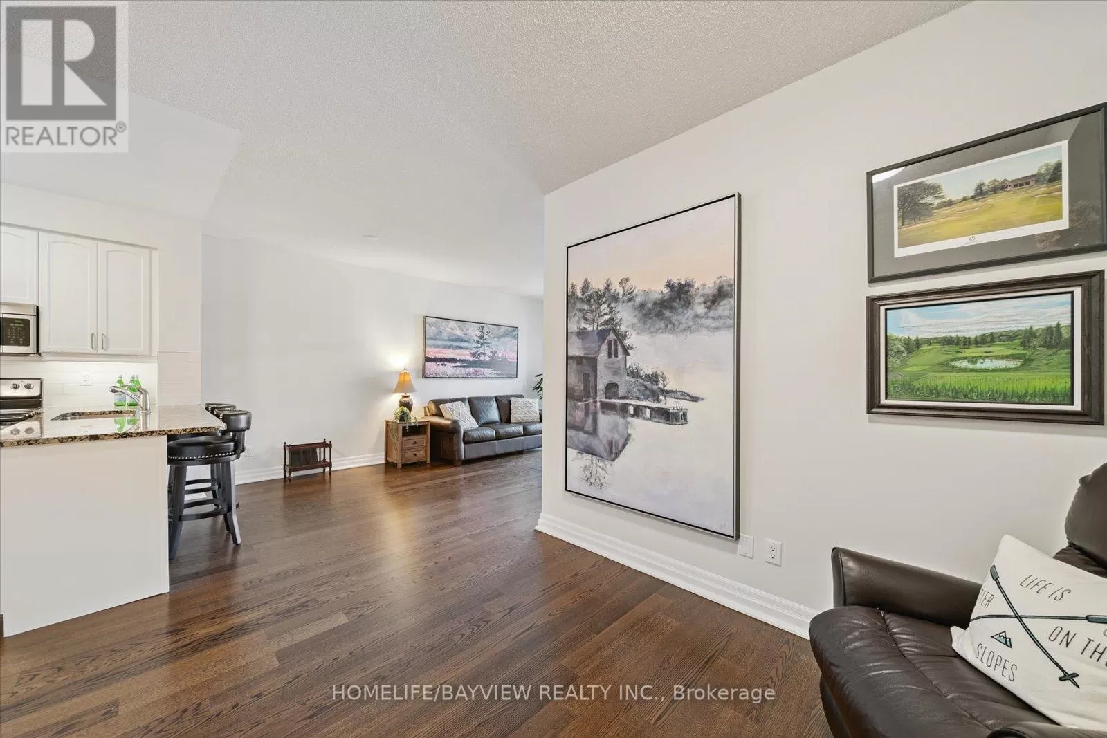 Cross Streets: Bayview/Wellington. ** Directions: Google Maps. Discover Resort-Style Living At "Ridgewood" In Aurora, With This Updated 1-Bedroom Plus Den Condo Offering 736 Sq Ft Of Open-Concept Space And A Private Balcony Showcasing Stunning Northern City Views. Inside, Enjoy Coffered Ceilings, 9 ft heights, And A Stylish Kitchen Featuring White Cabinetry, Granite Countertops, A Breakfast Bar, New Backsplash With Under-Valence Lighting, & Engineered Hardwood Floors. This Home Has Been Freshly Painted Throughout, Enhancing Its Bright And Welcoming Atmosphere. The Primary Bedroom Fits A King-Sized Bed And Offers Ample Closet Space, While The Den Serves As an Ideal Office Or Dining Area. The Luxurious Bathroom Includes A Soaker Tub And A Glass Shower Door. Exceptional Community Amenities Include A Saltwater Pool, BBQ Area, Gym, Steam Room, Theater Room, Bike Racks, And Party Room, With Concierge Services For Added Security and Convenience. There are Plenty of Visitor Spots & Guest Suite Available For Friends. Pets Allowed with Restrictions. You're Just Minutes From Walking Trails, The Stronach Rec Complex, Aurora Leisure Complex, The Aurora Seniors Centre, Sheppard's Bush, Top Schools, GO Train Station, Dining & Shopping, as well as Quick Access To Highway 404. This Design is Unique & Spacious & You will Not Want To Miss This One!! (id:27476)