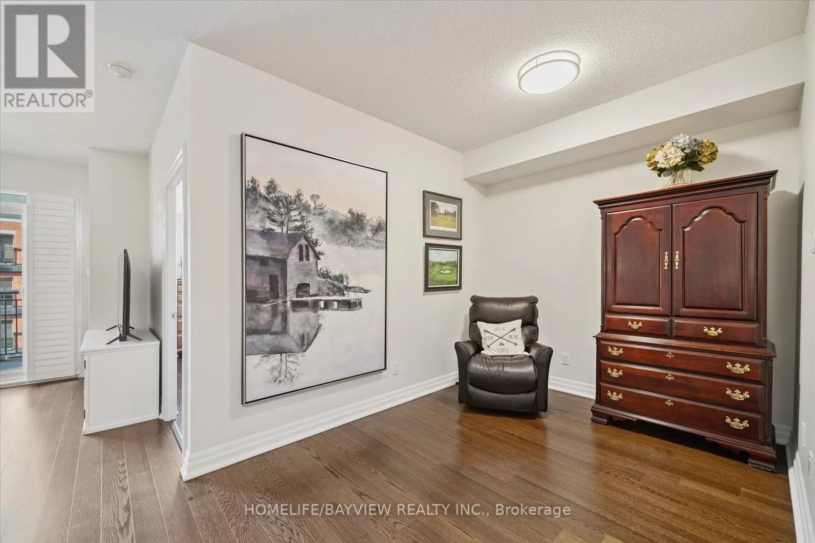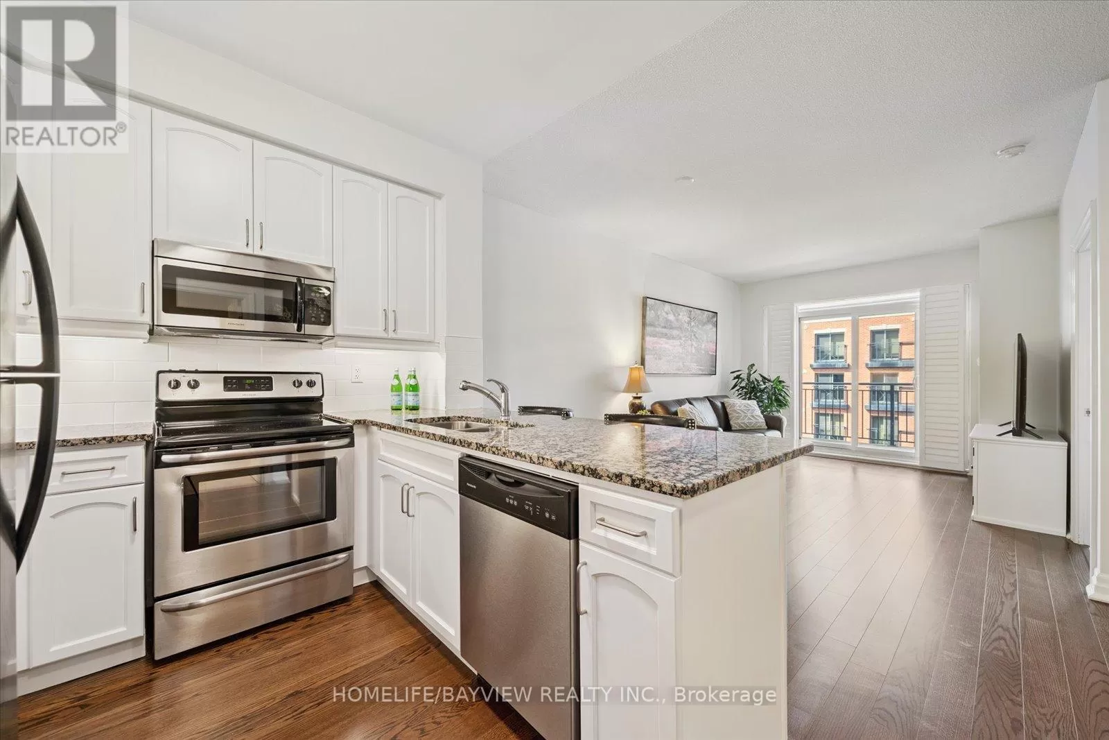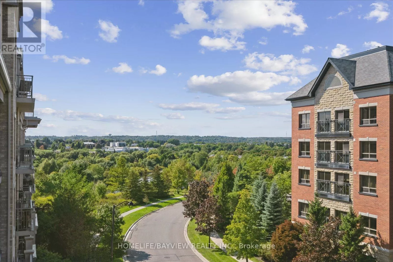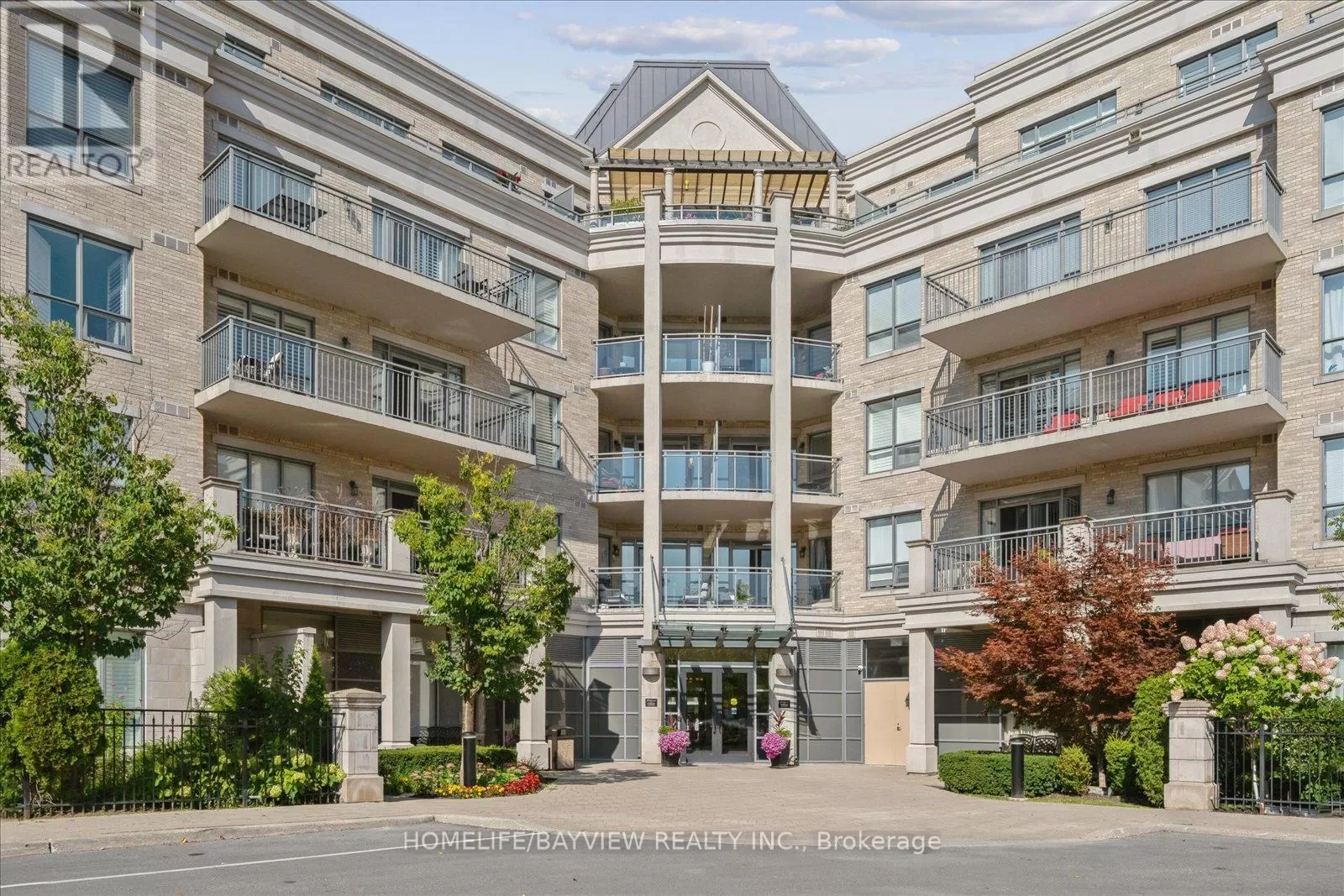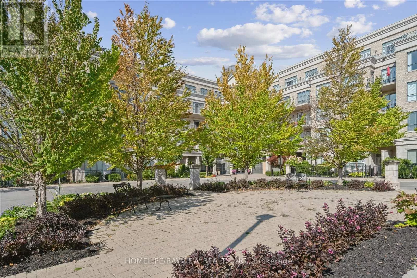 Cross Streets: Bayview/Wellington. ** Directions: Google Maps. Discover Resort-Style Living At "Ridgewood" In Aurora, With This Updated 1-Bedroom Plus Den Condo Offering 736 Sq Ft Of Open-Concept Space And A Private Balcony Showcasing Stunning Northern City Views. Inside, Enjoy Coffered Ceilings, 9 ft heights, And A Stylish Kitchen Featuring White Cabinetry, Granite Countertops, A Breakfast Bar, New Backsplash With Under-Valence Lighting, & Engineered Hardwood Floors. This Home Has Been Freshly Painted Throughout, Enhancing Its Bright And Welcoming Atmosphere. The Primary Bedroom Fits A King-Sized Bed And Offers Ample Closet Space, While The Den Serves As an Ideal Office Or Dining Area. The Luxurious Bathroom Includes A Soaker Tub And A Glass Shower Door. Exceptional Community Amenities Include A Saltwater Pool, BBQ Area, Gym, Steam Room, Theater Room, Bike Racks, And Party Room, With Concierge Services For Added Security and Convenience. There are Plenty of Visitor Spots & Guest Suite Available For Friends. Pets Allowed with Restrictions. You're Just Minutes From Walking Trails, The Stronach Rec Complex, Aurora Leisure Complex, The Aurora Seniors Centre, Sheppard's Bush, Top Schools, GO Train Station, Dining & Shopping, as well as Quick Access To Highway 404. This Design is Unique & Spacious & You will Not Want To Miss This One!! (id:27476)