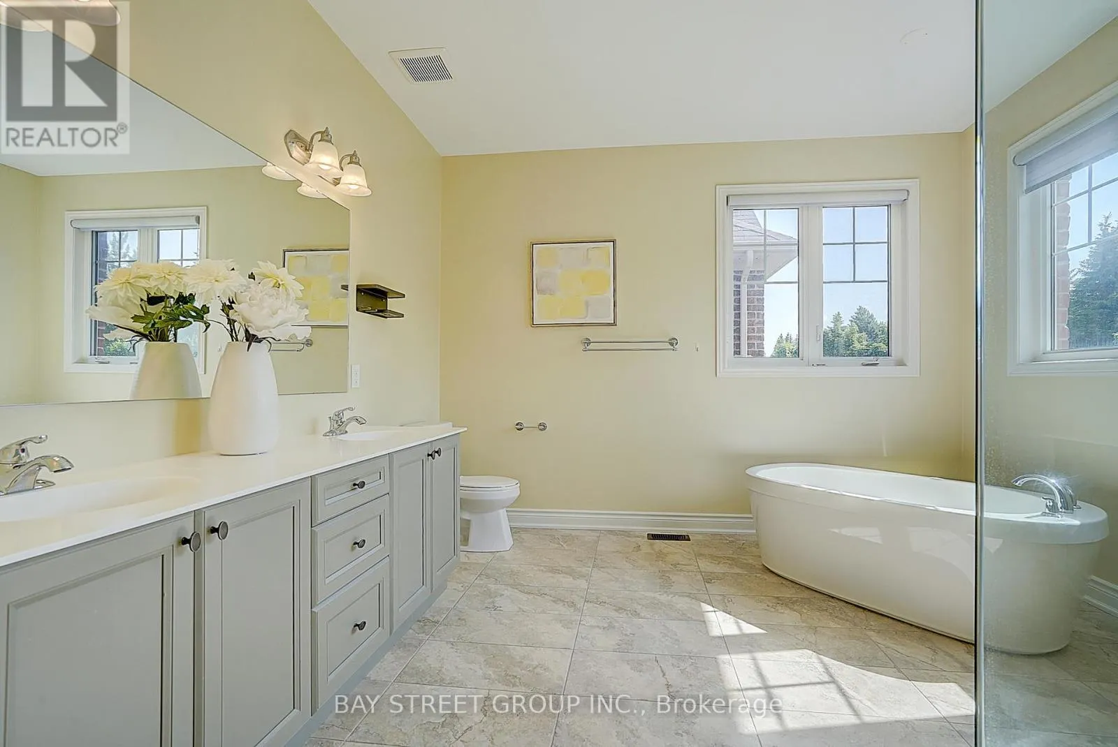 Bayview Ave / Vandorf Sideroad Rarely Offered! Elegant 50 Ft Detached Home with Double Garage in Prestigious Gated Community of Aurora. Nestled in a quiet and safe cul-de-sac, this exquisite home offers exceptional privacy and peace of mind. Featuring 10 ft ceilings on the main floor, and 9 ft ceilings on both the second floor and basement. Gleaming hardwood floors throughout the main and second levels, with oak staircase and stylish iron pickets. Smooth ceilings on both main and upper levels. The spacious primary bedroom includes a cozy sitting area, a luxurious 5-piece ensuite with heated floors, and a large walk-in closet. Enjoy cooking in the open-concept modern kitchen with quartz countertops and designer backsplash. Step into a beautifully landscaped backyard with a raised stone patio, surrounded by frameless glass panels for an elegant, unobstructed view. Interlocked paving enhances both the front and backyard. Conveniently located near a golf club. (id:27476)