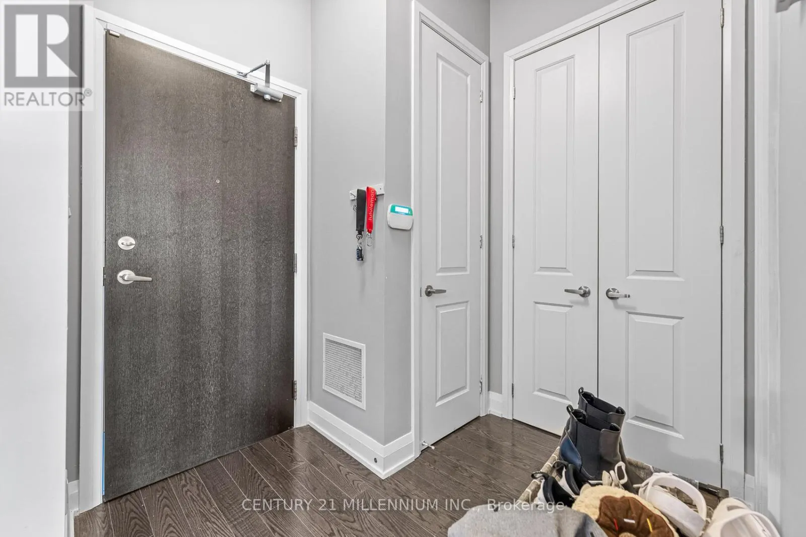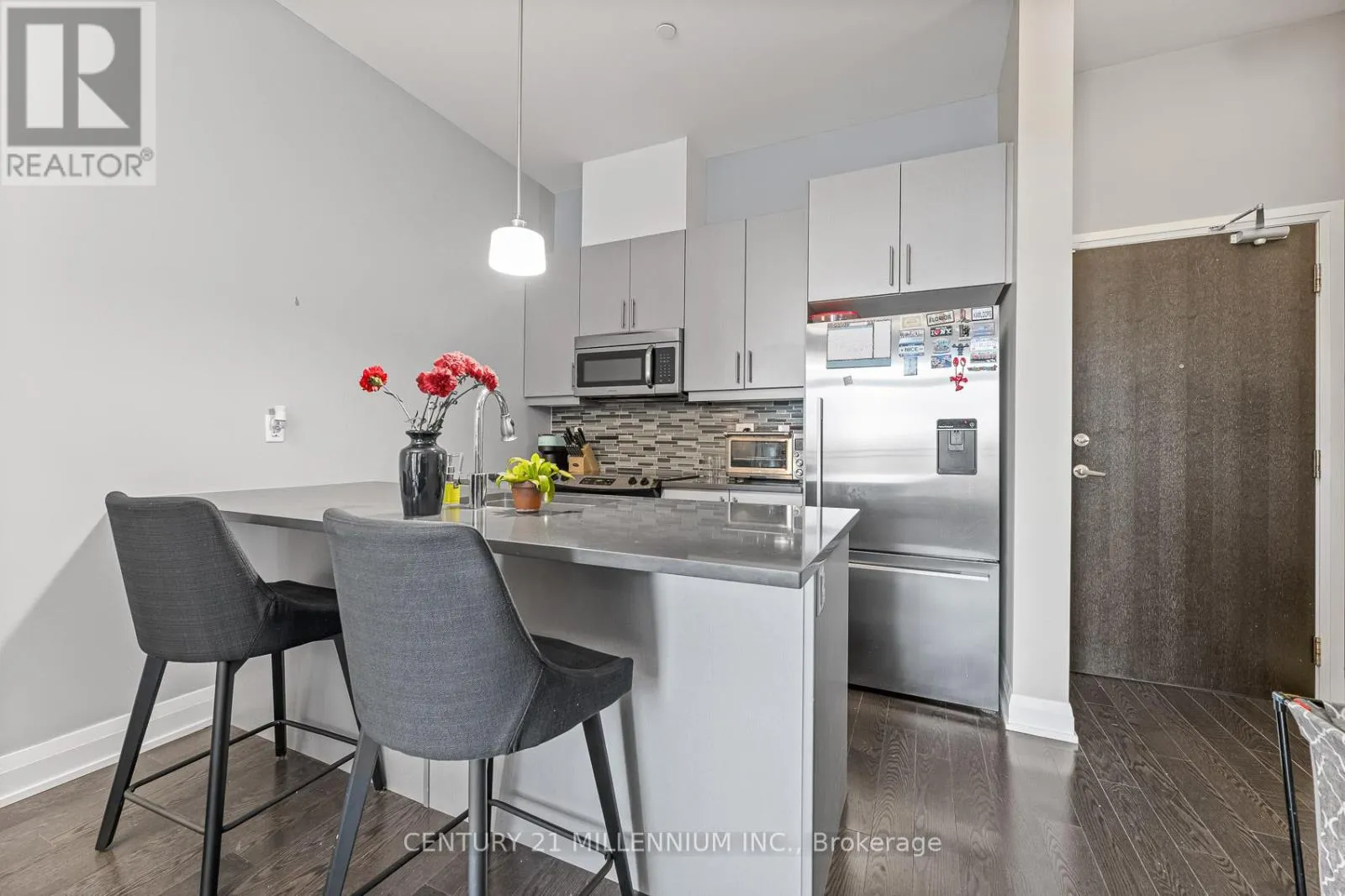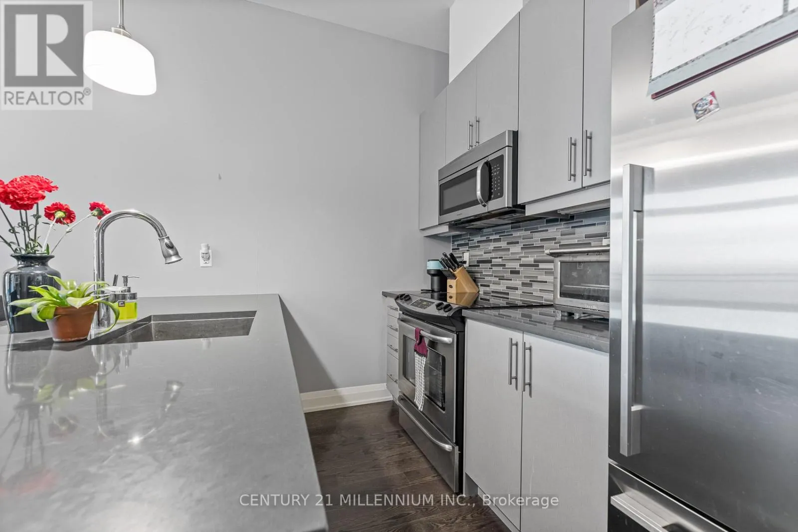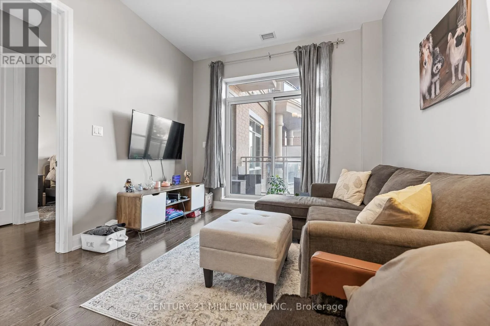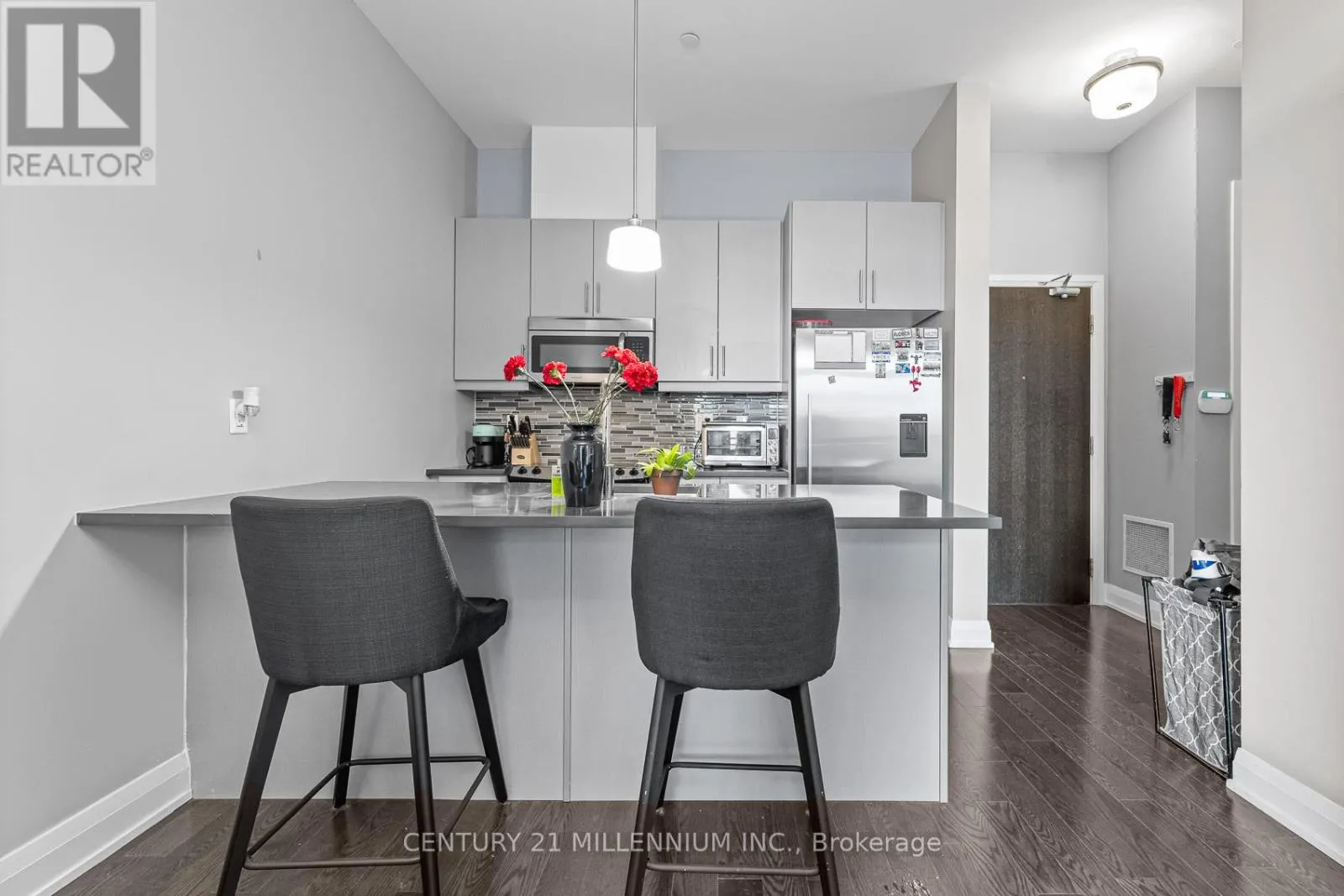 Yonge & Wellington Welcome to unit 419-15277 Yonge St, Aurora! A beautiful and spacious one-bedroom condo available in the heart of Aurora. This welcoming unit is flooded with natural light and features 10-foot high ceilings, hardwood floors, ensuite laundry, and a private balcony. The kitchen is equipped with granite countertops, a breakfast bar, stainless steel appliances, and a tile backsplash. The bedroom includes a walk-in closet and a semi-ensuite bathroom. The condo has been freshly painted throughout and is move-in ready. It includes one exclusive-use underground parking spot, no need to worry about clearing the snow off your car. Residents enjoy fantastic building amenities, including a concierge, party room, gym, dog wash station, bicycle storage, and ample visitor parking. This prime location is just steps away from public transit, shopping, dining, and schools. (id:27476)