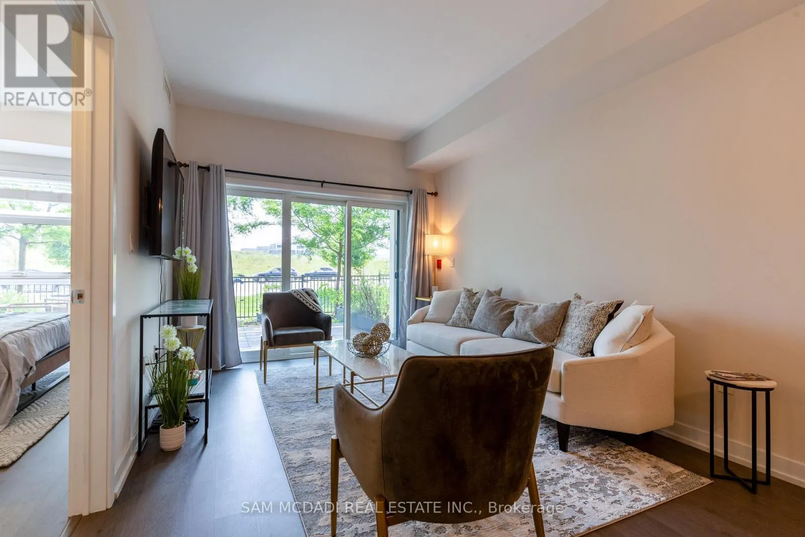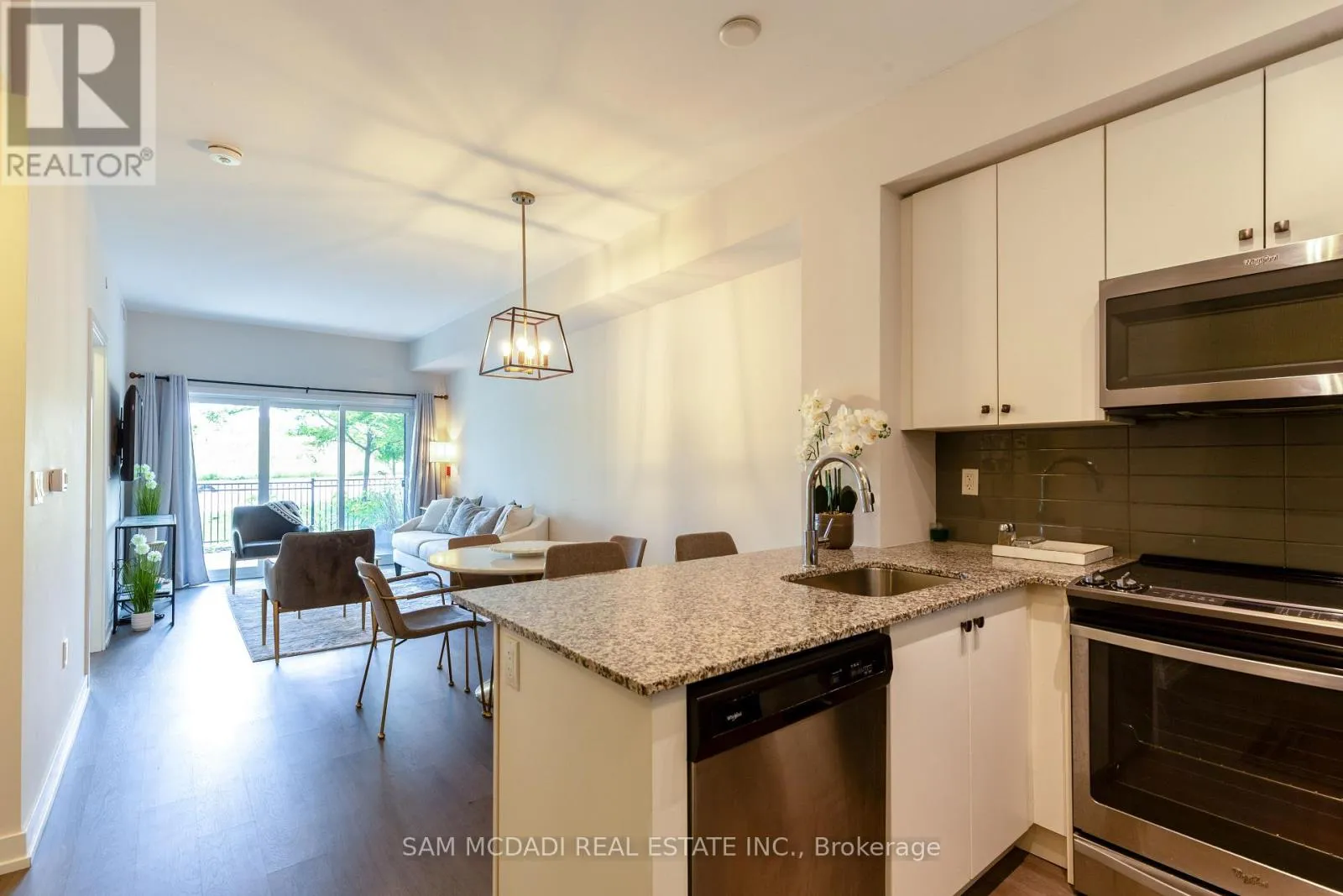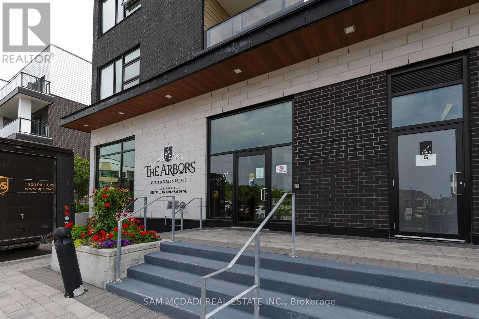 Leslie St & Wellington Rd The Arbors Auroras modern condominium community welcomes you. This modern design 1-bedroom + den suite offers a luxurious and quite lifestyle with breathtaking, unobstructed sunset views. Featuring a chef-inspired kitchen with quartz countertops, breakfast bar, and four stainless steel appliances, this open-concept unit is perfect for both entertaining and everyday living. Laminate flooring throughout and 10 ft. ceilings create a bright, airy atmosphere throughout. The spacious den can easily function as a second bedroom or home office, while the primary bedroom comfortably fits a king-size bed and includes a 4-piece ensuite and large closet space. Rarely offered, the oversized terrace allows for BBQs and outdoor dining. Freshly painted and move-in ready, this unit comes with underground parking and a locker. A perfect blend of luxury finishes and modern convenience. Access to amenities: concierge, gym, party room, pet spa, terrace/BBQ area, guest suite, billiard room, and a pharmacy/walk-in clinic. The location is ideal, with easy access to Hwy 404, GO Bus and GO Train, shopping, schools, and parks. (id:27476)