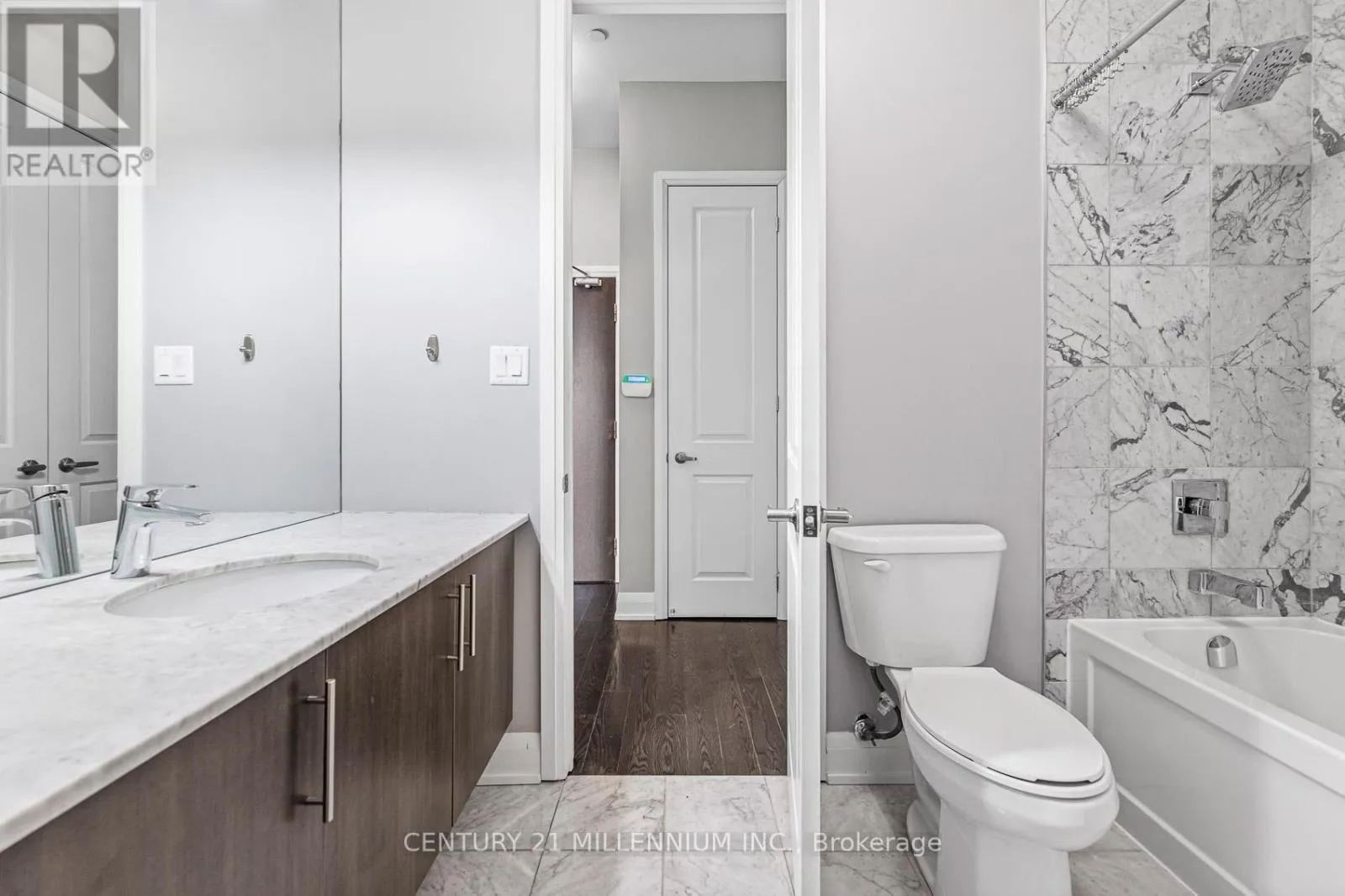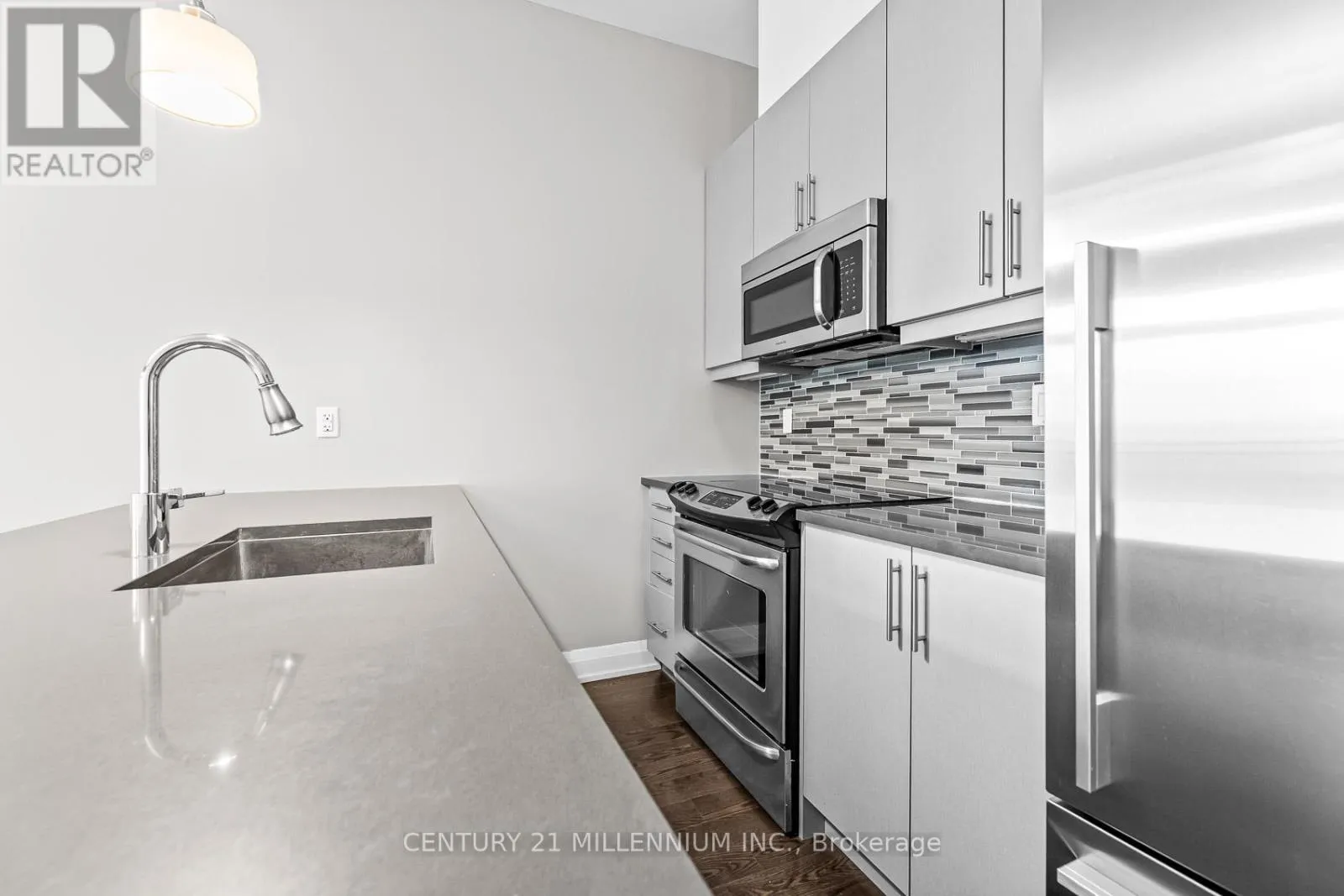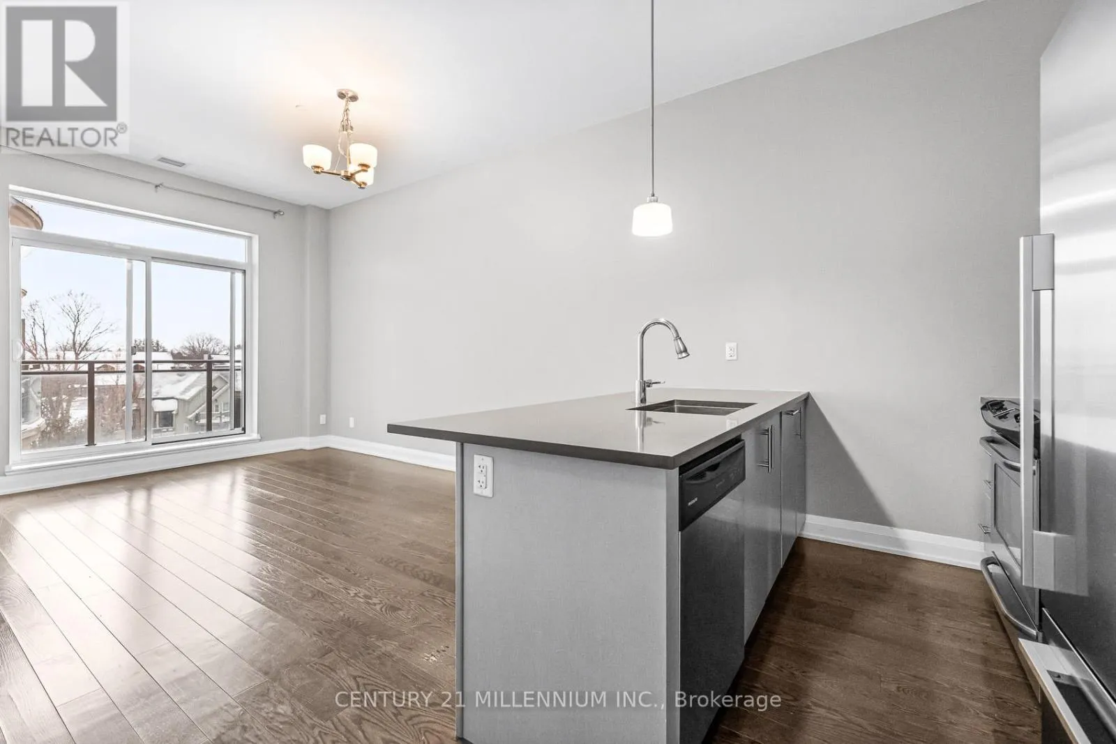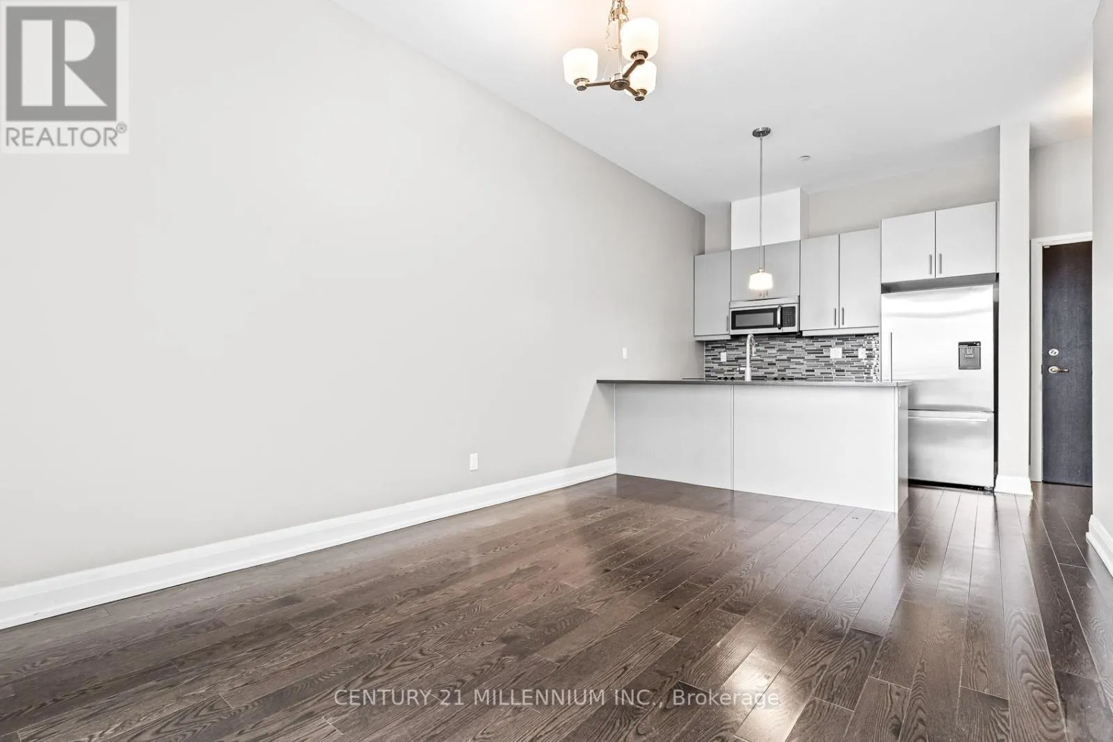 Yonge & Wellington Welcome to unit 419-15277 Yonge St, Aurora! A beautiful and spacious one-bedroom condo available in the heart of Aurora. This welcoming unit is flooded with natural light and features 10-foot high ceilings, hardwood floors, ensuite laundry, and a private balcony. The kitchen is equipped with granite countertops, a breakfast bar, stainless steel appliances, and a tile backsplash. The bedroom includes a walk-in closet and a semi-ensuite bathroom. The condo has been freshly painted throughout and is move-in ready. It includes one exclusive-use underground parking spot, no need to worry about clearing the snow off your car. Residents enjoy fantastic building amenities, including a concierge, party room, gym, dog wash station, bicycle storage, and ample visitor parking. (id:27476)