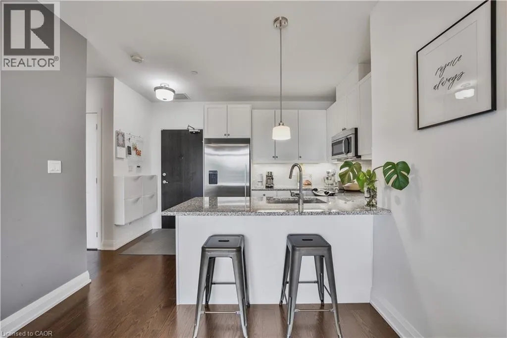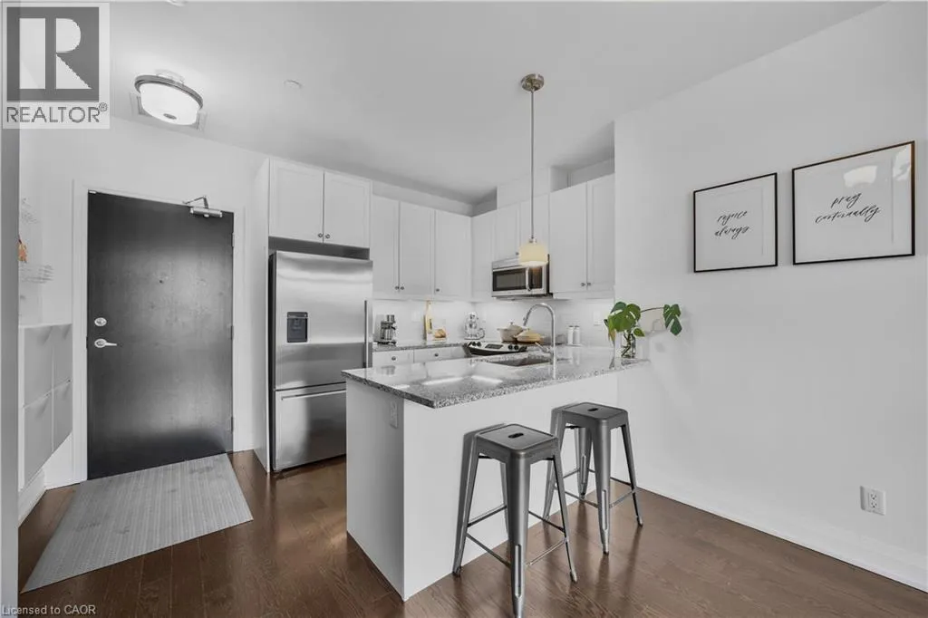 North on Yonge from Wellington St E Welcome to this stunning one-bedroom suite, where modern elegance meets everyday comfort in one of Aurora's most sought-after locations. Featuring bright, open-concept living spaces with hardwood floors throughout, designed for both style and functionality. The gourmet kitchen is a true highlight, showcasing quartz countertops, high-end stainless steel appliances, a spacious breakfast bar, and ample cabinetry - perfect for cooking, entertaining, or enjoying a quiet night in. Step outside to your private East-facing balcony with the option to BBQ, the ideal spot for dining al fresco, or unwinding with evening views. Enjoy the convenience of in-suite laundry, a thoughtfully designed layout that maximizes every square foot, and the peace of mind of a well-managed, boutique-style, pet-friendly building. Water softener and smart thermostat included! Premium amenities include a concierge, fitness center, party room, pet wash, bike storage, visitor parking, and more. Perfectly located in Aurora Village, you're just steps to shops, dining, parks,and the Aurora GO Station - everything you need at your doorstep. Move-in ready, beautifully maintained, and rare to find, this is luxury condo living at its finest. (id:27476)