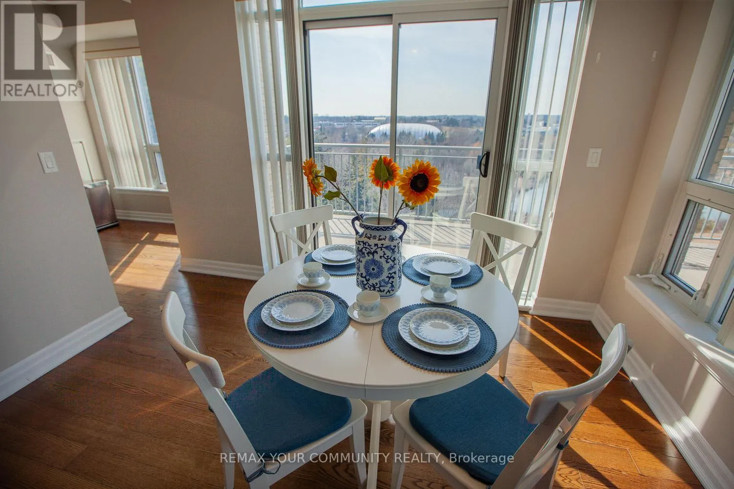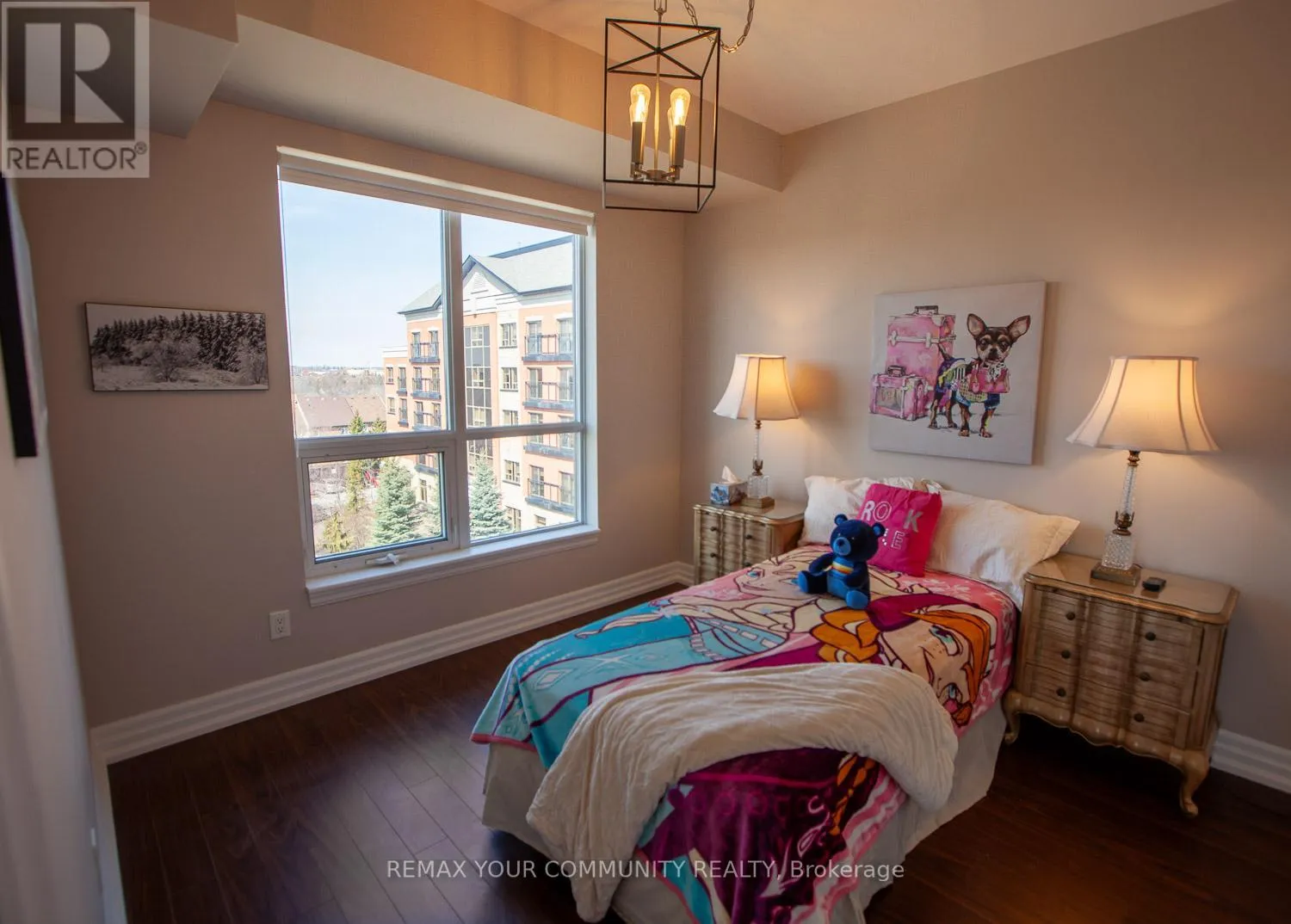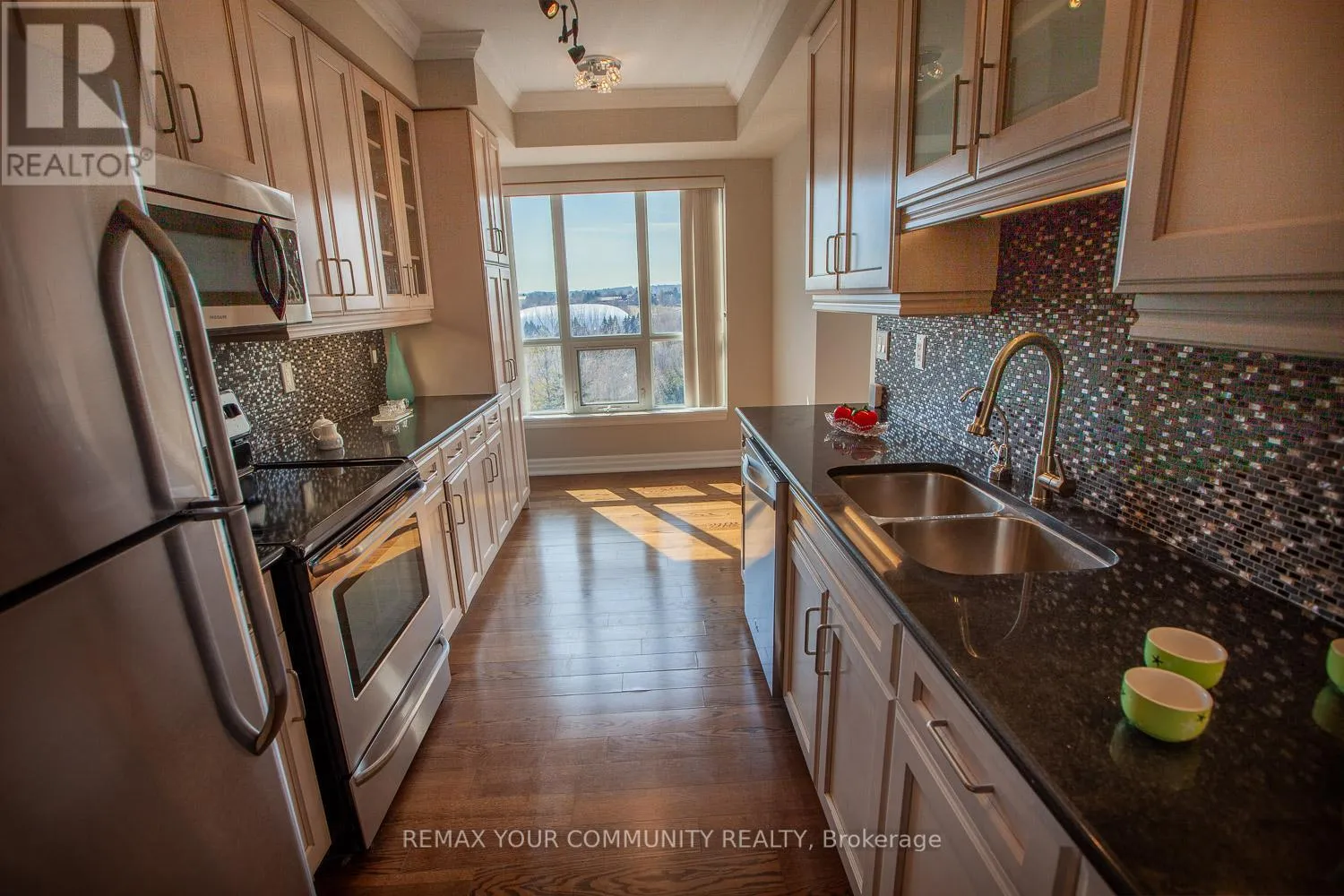 Wellington and John West Way Welcome to beautiful Ridgewood, considered as one of York Region's Finest Residences. This Building features Exceptional Construction and Attention to Details, The North/West views grant the owner a perfect view of the Pond, the Swans, the Forest and the Trails. This building is located a short walk to Banks, Shops, Theatre, Community Centre, Transit, Groomed Trails and Park. This Spacious Corner Unit boasts nicely appointed interior with Hardwood Floors, Crown Moldings, Designer Kitchen, Good Size Bedrooms and an Amazing, Breathtaking Views of Sunsets, Pond and Trees. Upgraded Kitchen ofers abundance of Cabinets, a Pantry, Granite Countertops, breakfast area and a great unobstructed views. Spacious and beautifully designed this sun filled 2 bdrm + Den corner unit offers the prefect blend of comfort and style, featuring a bright open concept layout, the unit includes an inviting eat-in kitchen that flows seamlessly into the Living and Dining areas - ideal for both everyday living and entertaining. Enjoy Hardwood floors and large windows that fill the space with natural light, step out into the space with natural light, step out into the oversized balcony and step out into the oversized balcony and take in serene views of the pond and surrounding trails - a perfect spot to relax and unwind. The versatile Den provides additional space for a home office or guest area, making this condo as functional as it is elegant. A rare corner unit offering privacy, scenic views & modern living in sought after Aurora Location. (id:27476)