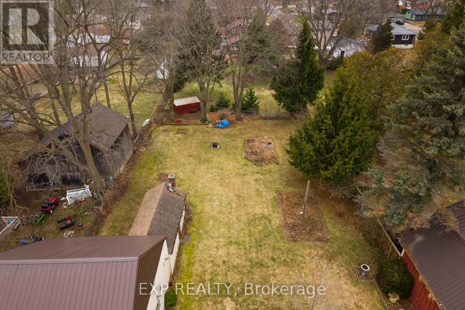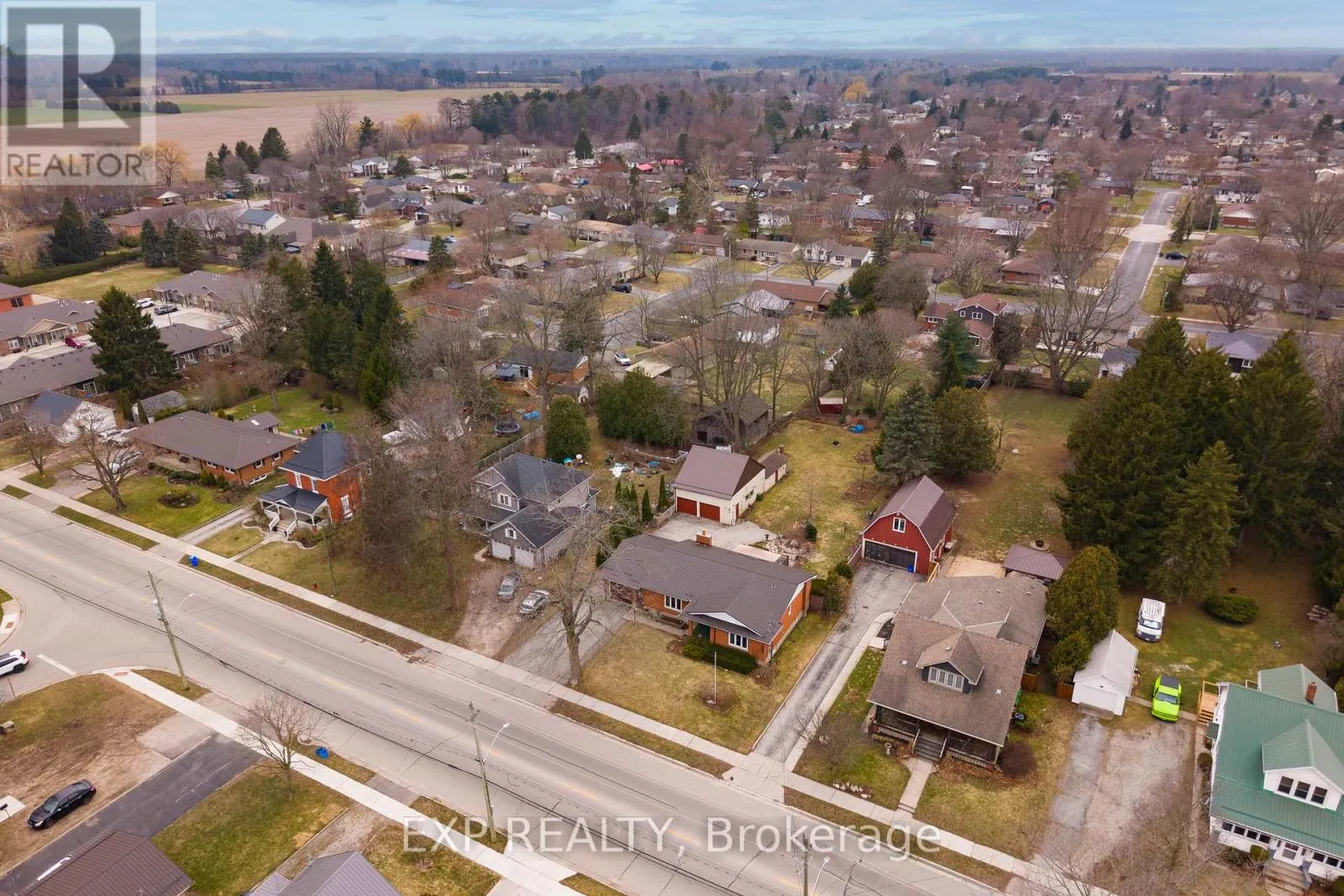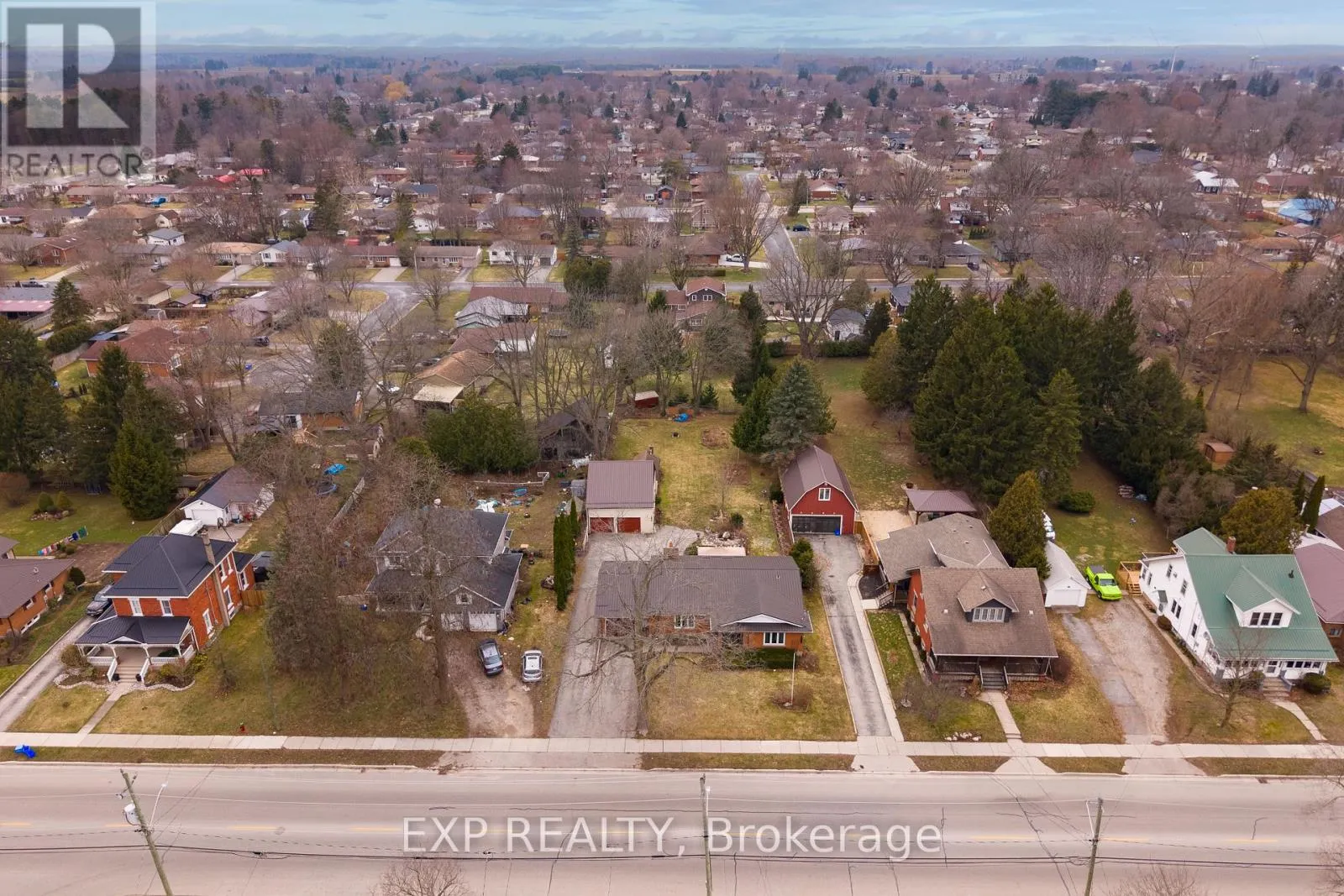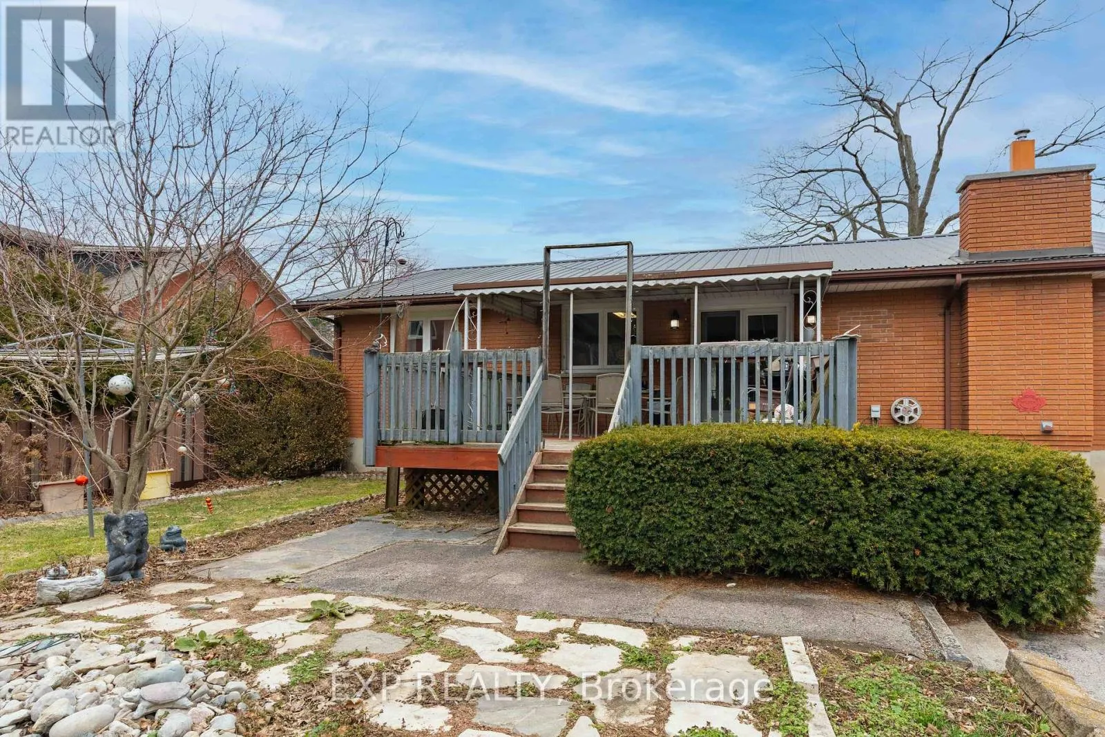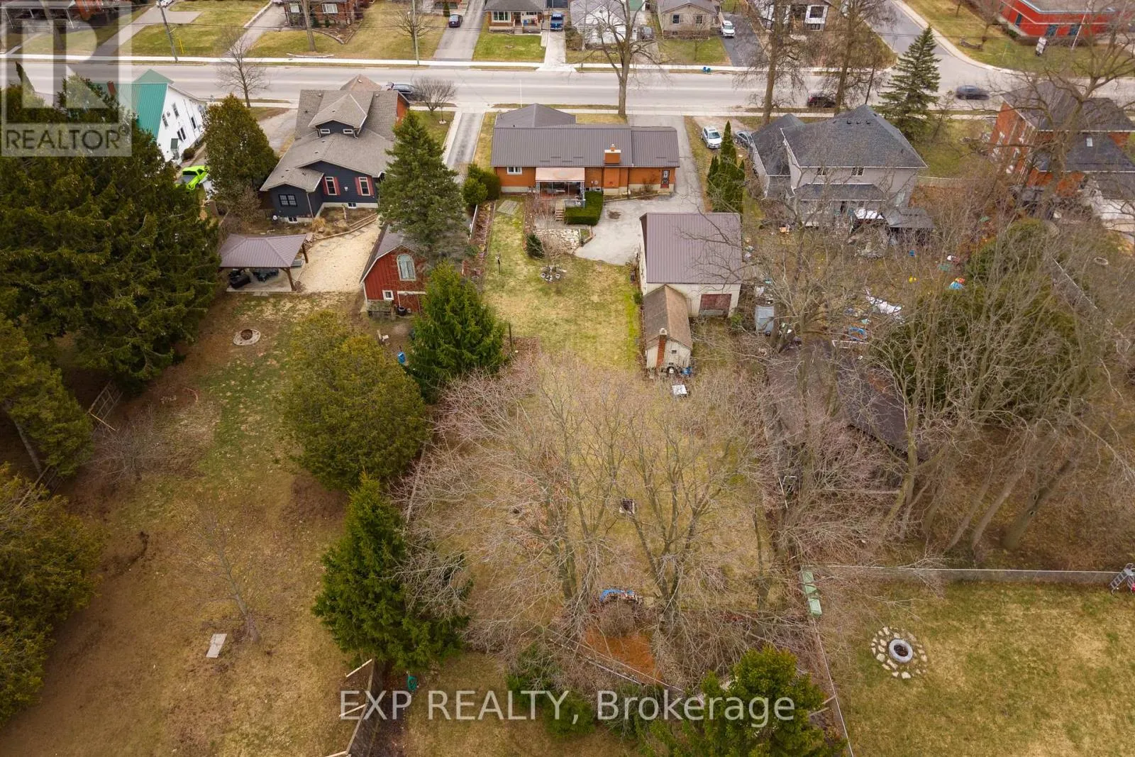 Talbot St W/John St S 308 John Street South, Aylmer offers a rare blend of in-town convenience, multi-generational flexibility, and exceptional outdoor utility on a deep lot that feels far more private than its central location suggests. This brick bungalow features an attached garage, a separate entrance to the basement, and an impressive detached shop with parking for two vehicles, remote openers, workshop space, and a large upper loft for added storage and future-use potential. Inside, the main level offers a bright, welcoming layout with spacious principal rooms, warm-toned laminate flooring, large front-facing windows, and an open-concept living and dining area anchored by a full brick fireplace. The kitchen provides extensive upper and lower cabinetry, generous counter space, and a large eat-in area with direct access to the covered rear deck with awning, creating an easy extension of the living space outdoors. The main level bedrooms are well-sized, the bathroom is clean and practical with a large vanity and good storage, and storage is a consistent strength throughout the home. The basement adds valuable flexibility with a spacious rec room, second kitchenette, additional bedroom, full bathroom, and separate entrance, making it well suited for extended family, guests, or multi-generational living. Outside, the property continues to stand out with ample parking at the front, side, and rear, a deep backyard with mature trees, expansive green space, garden areas, a bubbling rock water feature, and a fire pit area that together create a peaceful, country-like feel despite the in-town setting. Additional updates and features include a metal roof approximately 2022, furnace and central air conditioning from 2004, an upgraded electrical panel in 2004, and a dryer replaced in 2023. (id:27476)