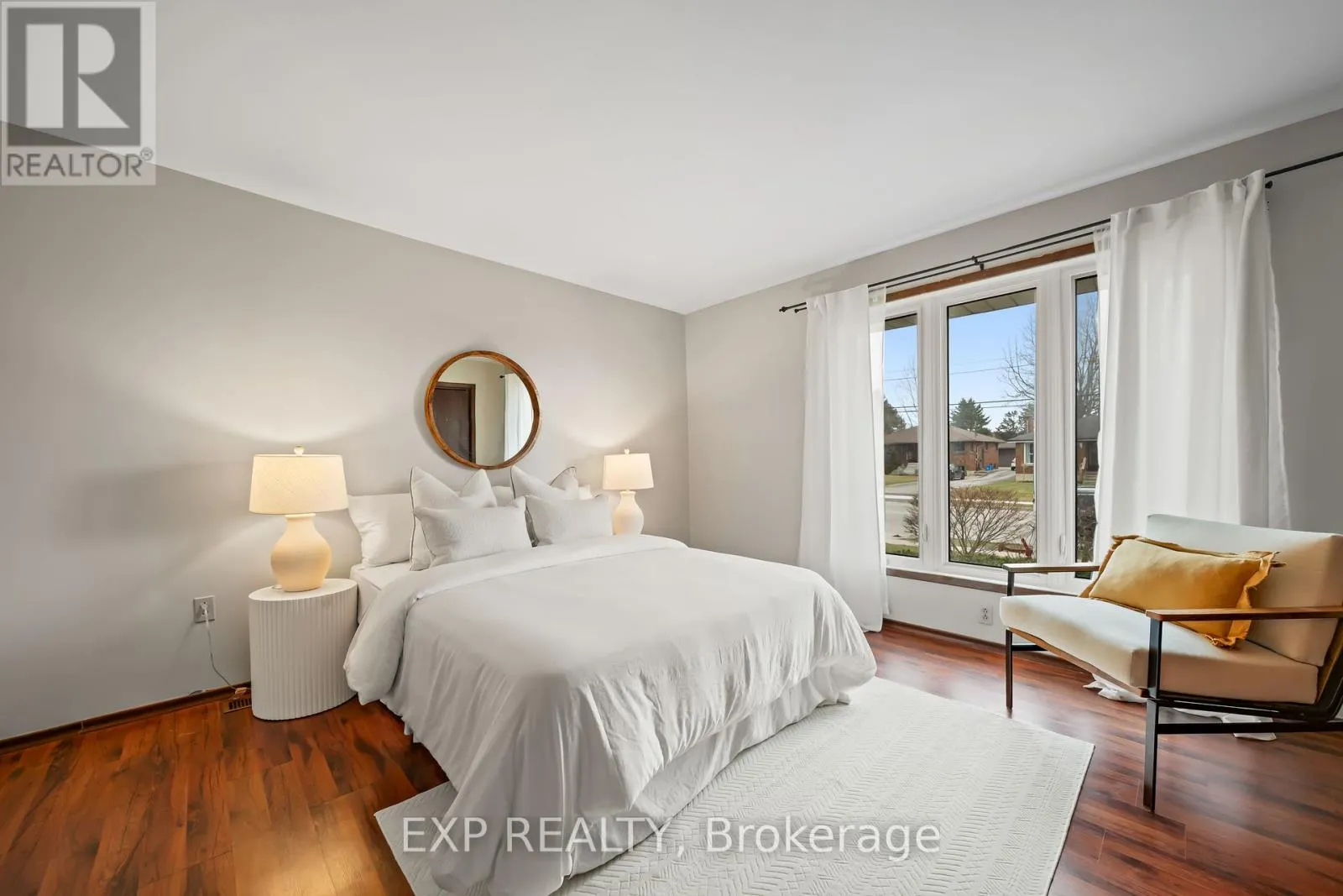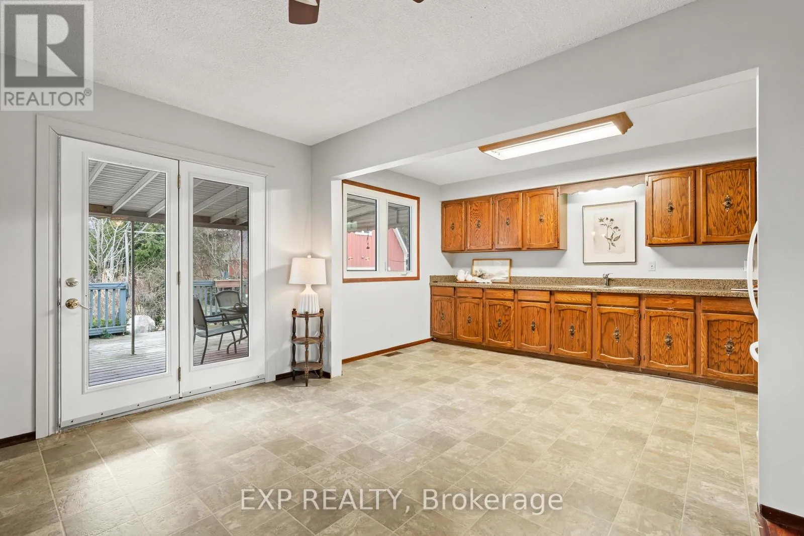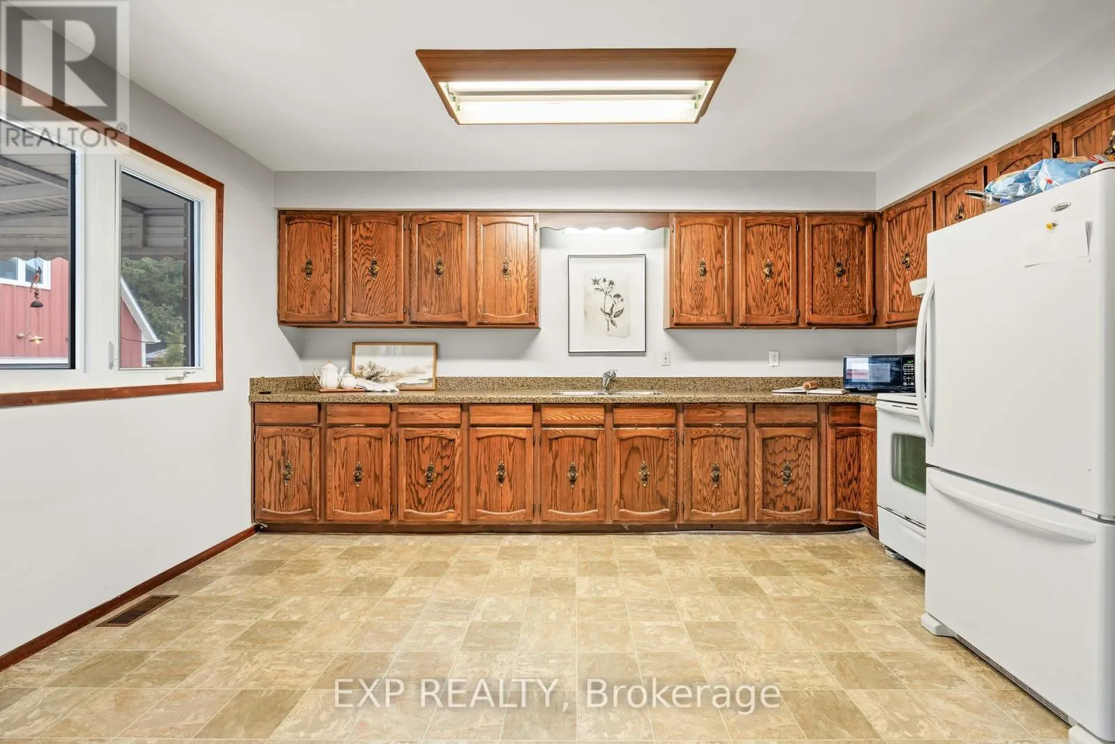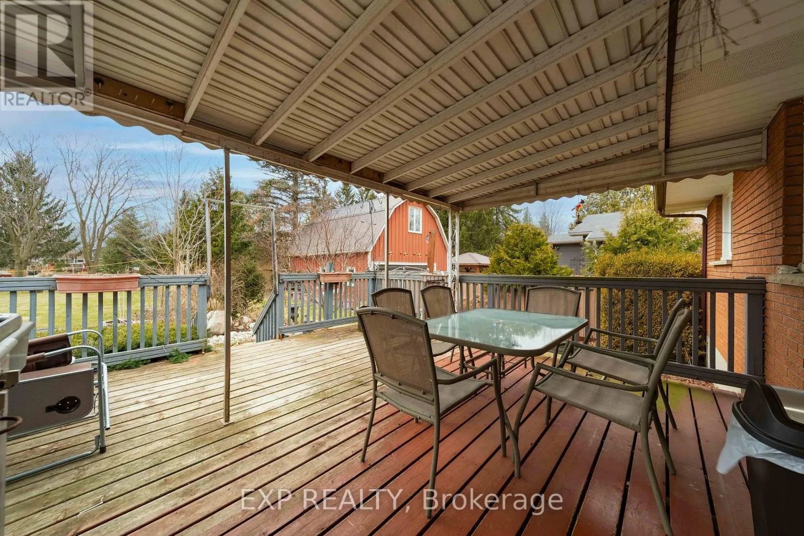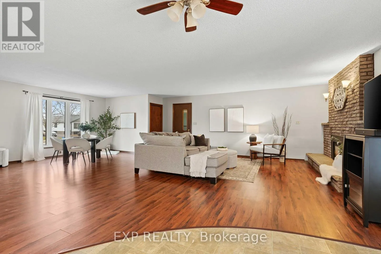 Talbot St W/John St S 308 John Street South, Aylmer offers a rare blend of in-town convenience, multi-generational flexibility, and exceptional outdoor utility on a deep lot that feels far more private than its central location suggests. This brick bungalow features an attached garage, a separate entrance to the basement, and an impressive detached shop with parking for two vehicles, remote openers, workshop space, and a large upper loft for added storage and future-use potential. Inside, the main level offers a bright, welcoming layout with spacious principal rooms, warm-toned laminate flooring, large front-facing windows, and an open-concept living and dining area anchored by a full brick fireplace. The kitchen provides extensive upper and lower cabinetry, generous counter space, and a large eat-in area with direct access to the covered rear deck with awning, creating an easy extension of the living space outdoors. The main level bedrooms are well-sized, the bathroom is clean and practical with a large vanity and good storage, and storage is a consistent strength throughout the home. The basement adds valuable flexibility with a spacious rec room, second kitchenette, additional bedroom, full bathroom, and separate entrance, making it well suited for extended family, guests, or multi-generational living. Outside, the property continues to stand out with ample parking at the front, side, and rear, a deep backyard with mature trees, expansive green space, garden areas, a bubbling rock water feature, and a fire pit area that together create a peaceful, country-like feel despite the in-town setting. Additional updates and features include a metal roof approximately 2022, furnace and central air conditioning from 2004, an upgraded electrical panel in 2004, and a dryer replaced in 2023. (id:27476)