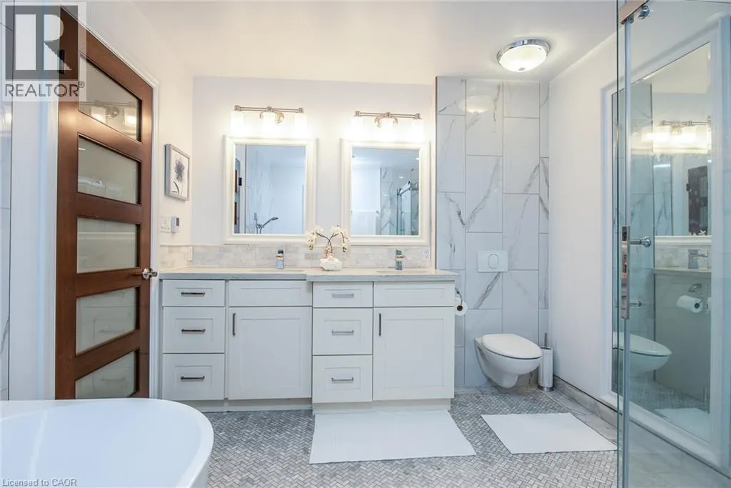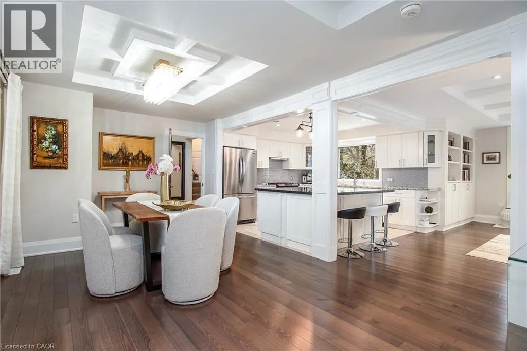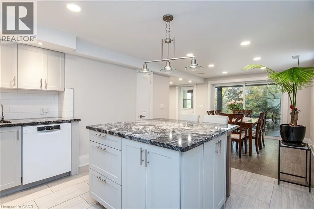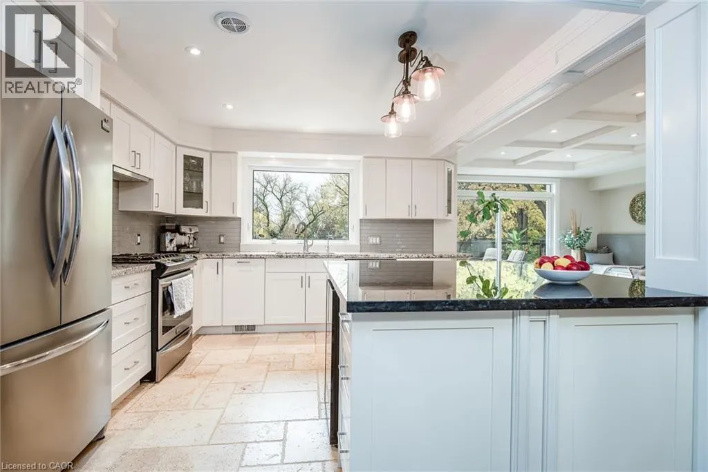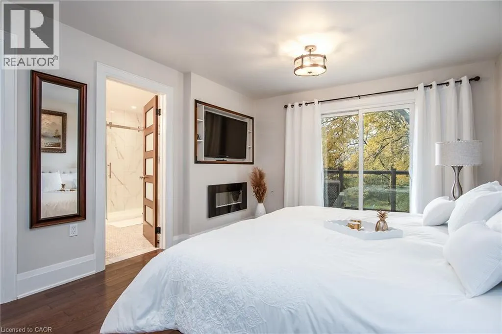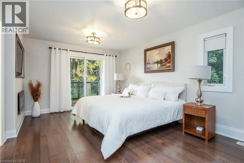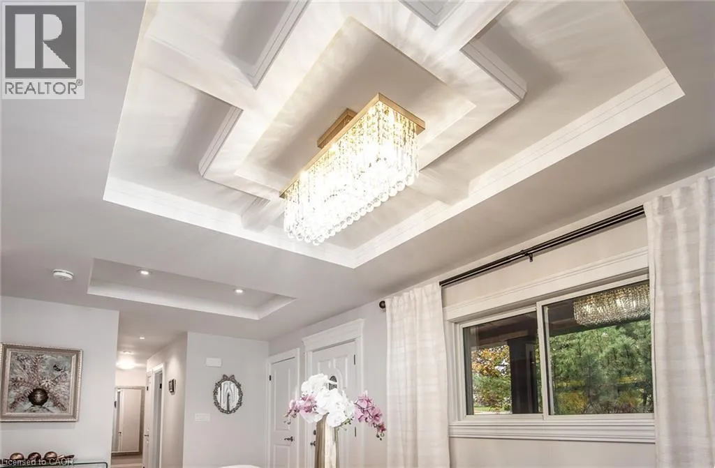 Stanley to Swan to Mitchell Custom-built dream home with a stunning view and a truly unique layout! Wake up to the peaceful beauty of a tree canopy on a pool-sized lot backing onto a mature forest. Whether you love to entertain or simply enjoy the serenity of nature, this home offers the best of both worlds. Boasting 4 spacious bedrooms and 5 bathrooms (3 with heated floors), this expansive walk-out bungalow provides flexible living with two living areas and an optional separate office space. Cozy up by one of two fireplaces, located in the recreation room and primary bedroom. The welcoming entrance leads to an open-concept main floor featuring beautifully detailed ceilings, hardwood floors throughout, and large glass doors that open to the balcony, offering unobstructed views of your private backyard oasis. The stylish kitchen/dining area showcases a large island, abundant cabinetry, and granite countertops. The dreamy primary bedroom features a spacious walk-in closet and additional closet, a luxurious 5-piece ensuite with a freestanding tub, and glass doors leading to a private balcony. The fully finished basement is perfect for multigenerational living or guest accommodations, complete with a large living room, 3-piece bathroom, powder room, laundry, kitchenette, bedroom, and spacious dining area with walk-out to the patio. Enjoy morning coffee on the front porch or host summer BBQs with ease. The oversized garage is insulated, drywalled, and painted, with a driveway for up to 7 vehicles. Metal roof installed in 2023 with lifetime guarantee. Located in a desirable neighbourhood within walking distance to schools, parks, trails, and playgrounds. With three separate entrances, this home featuring an in-law area is ideal for generational living or a home-based business. Nestled in the charming village of Ayr, just a short drive to Kitchener/Waterloo and minutes to Hwy 401, this character-filled property sits on just over half an acre â a rare find that blends space, style, and lifestyle. (id:27476)