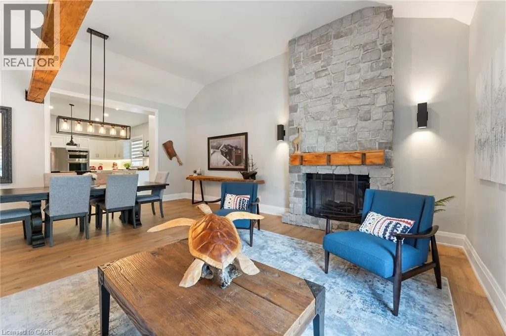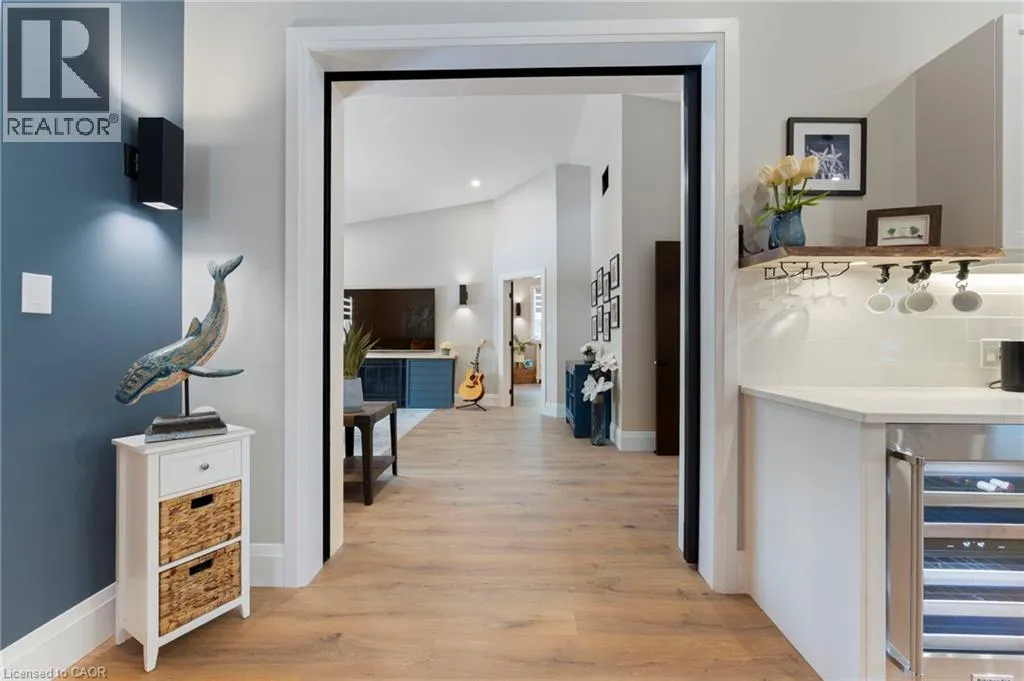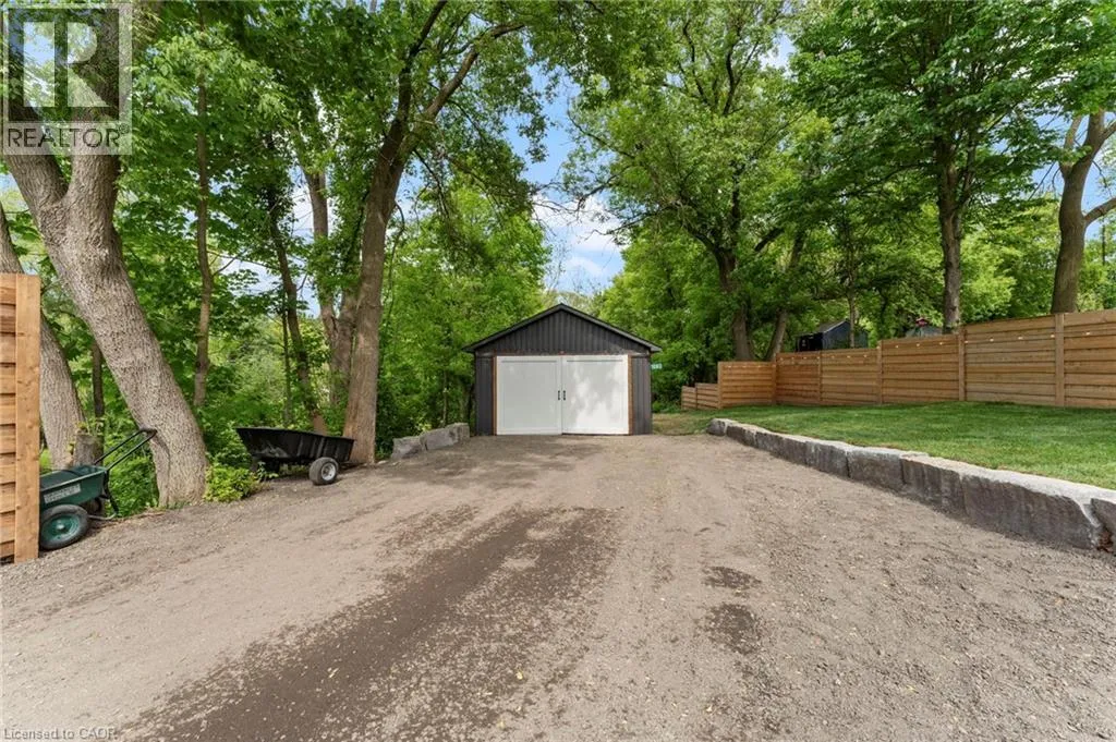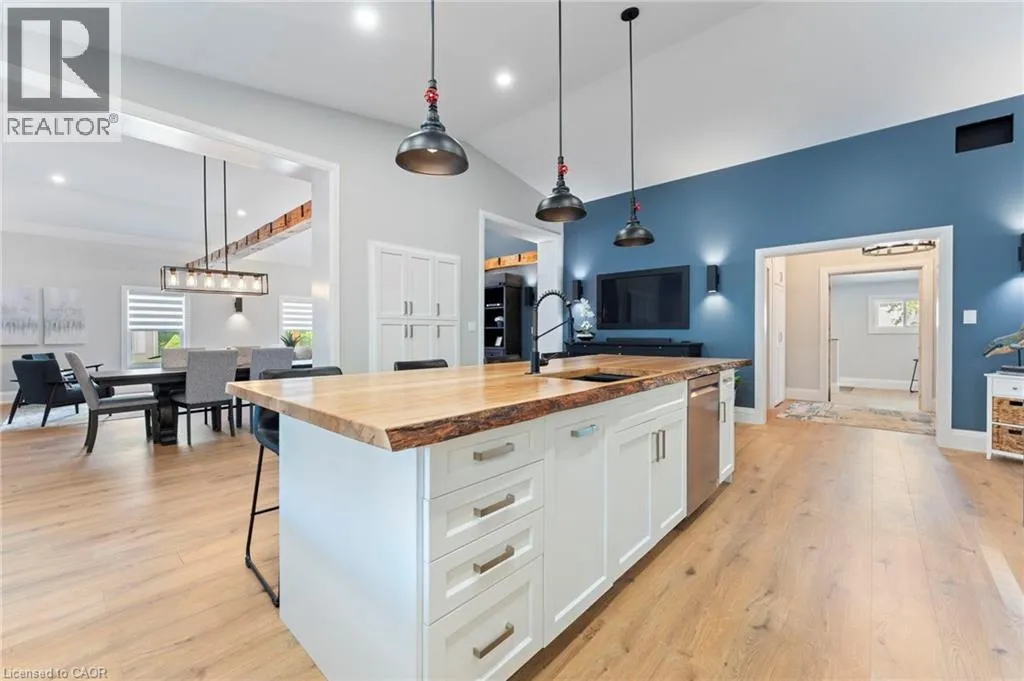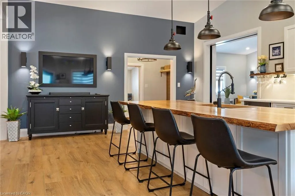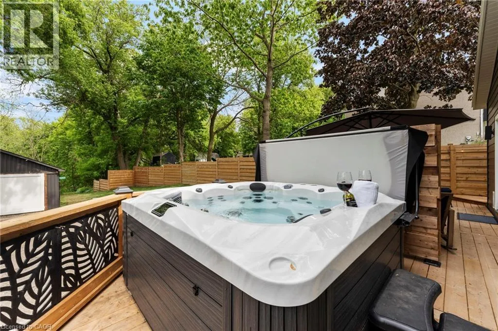 Heading South on Swan from Stanley downtown Ayr, the property is on the East side. Luxurious, newly renovated and partially newly built 2759 sq foot bungalow sits on close to a half acre. This gorgeous home stuns with a private oasis out back - backing onto green space, in the trees. This property also boasts two driveways, garage/workshop, Yoga or art studio and a private deck with hot tub. Walking into this truly Show Home, you will be shocked. The foyer has a private guest bath and then opens up into a massive, soaring ceiling kitchen, living room and dining room. The heart of the home - the entertainer's dream kitchen, with 10 ft. live edge wormy maple slab island, built in appliances including wine fridge, curated lighting, quartz, gas cooktop, and black sink and fixtures, this room is show-stopping. The dining room and living room are breathtaking. Vaulted ceilings with stone fireplace, beamed ceilings, new windows and doors, it's magnificent. Off the living room is the entrance to one of two completely separate private living spaces. This large bedroom with sitting area, walk in closet and five pc bath with private laundry can easily be converted into two bedrooms (seller willing to do this). Back through the kitchen, behind the massive 8 foot sliding door, retreat to your luxurious primary suite. Private den, spa like bath with walk in double, stone shower, and a large secluded bedroom with a secondary room which encompasses a w/in closet, laundry, coffee station, and walkout to private sitting area with hot tub. Accessible via the side entry, a few stairs down, you'll find a private wine cellar/speakeasy/cigar lounge for a whisky retreat or poker nights. Exceptional attention to detail and too many wow features to list. (id:27476)