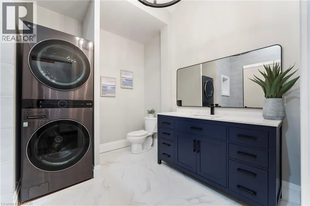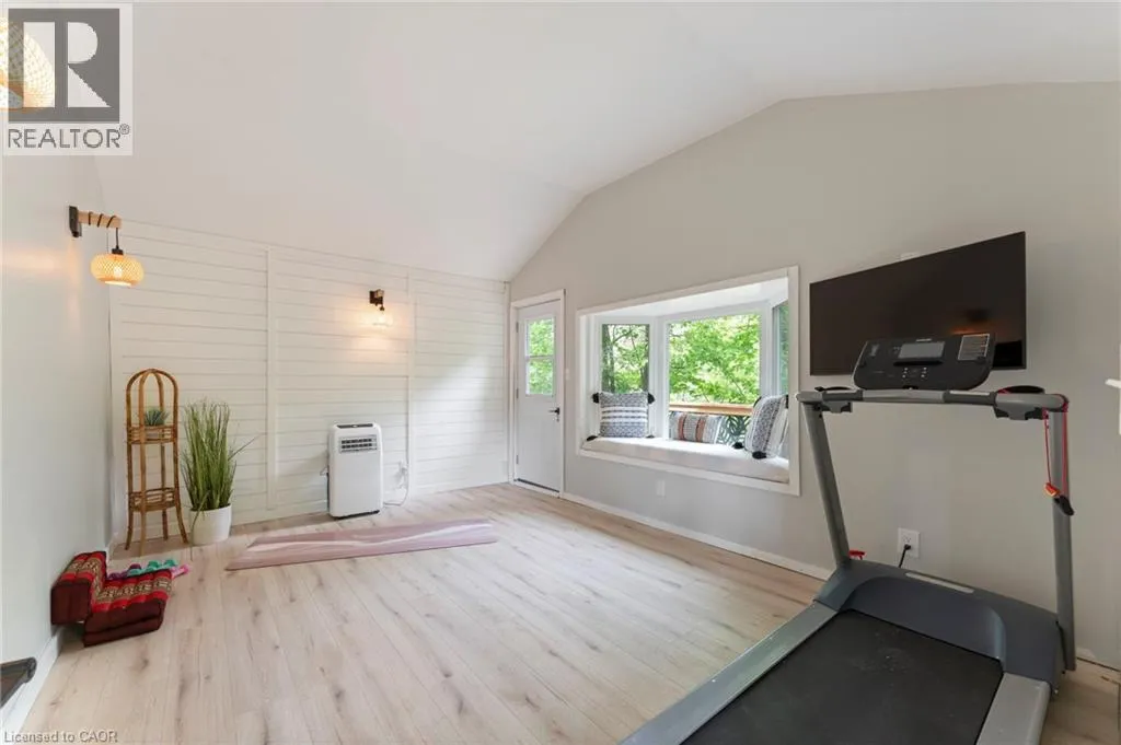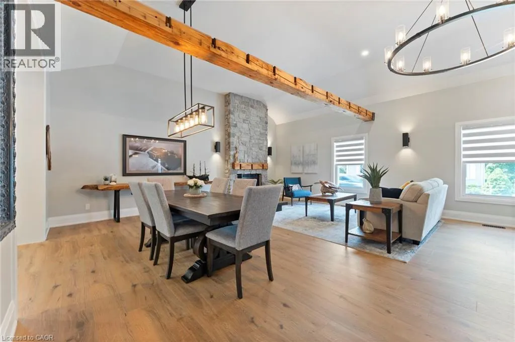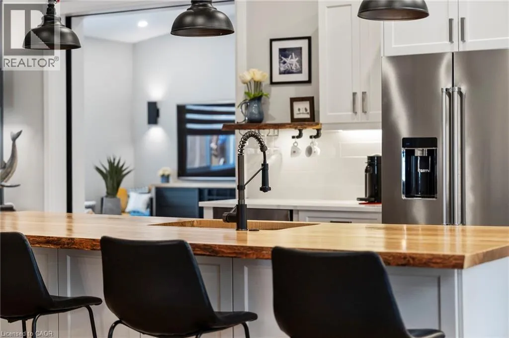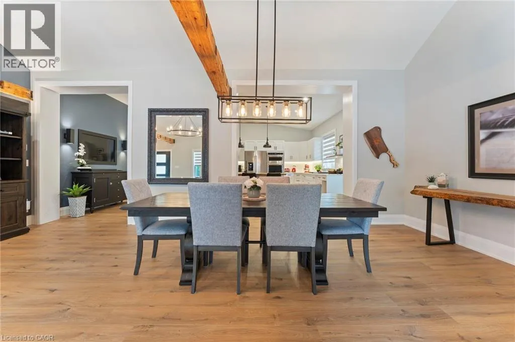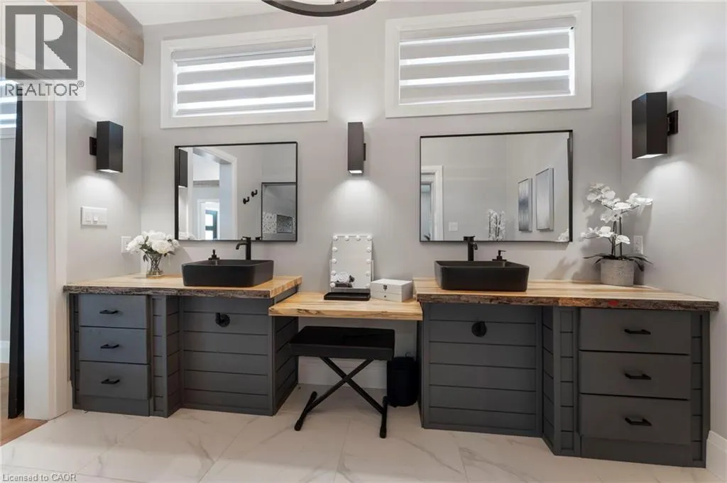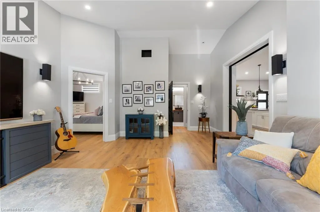 Heading South on Swan from Stanley downtown Ayr, the property is on the East side. Luxurious, newly renovated and partially newly built 2759 sq foot bungalow sits on close to a half acre. This gorgeous home stuns with a private oasis out back - backing onto green space, in the trees. This property also boasts two driveways, garage/workshop, Yoga or art studio and a private deck with hot tub. Walking into this truly Show Home, you will be shocked. The foyer has a private guest bath and then opens up into a massive, soaring ceiling kitchen, living room and dining room. The heart of the home - the entertainer's dream kitchen, with 10 ft. live edge wormy maple slab island, built in appliances including wine fridge, curated lighting, quartz, gas cooktop, and black sink and fixtures, this room is show-stopping. The dining room and living room are breathtaking. Vaulted ceilings with stone fireplace, beamed ceilings, new windows and doors, it's magnificent. Off the living room is the entrance to one of two completely separate private living spaces. This large bedroom with sitting area, walk in closet and five pc bath with private laundry can easily be converted into two bedrooms (seller willing to do this). Back through the kitchen, behind the massive 8 foot sliding door, retreat to your luxurious primary suite. Private den, spa like bath with walk in double, stone shower, and a large secluded bedroom with a secondary room which encompasses a w/in closet, laundry, coffee station, and walkout to private sitting area with hot tub. Accessible via the side entry, a few stairs down, you'll find a private wine cellar/speakeasy/cigar lounge for a whisky retreat or poker nights. Exceptional attention to detail and too many wow features to list. (id:27476)