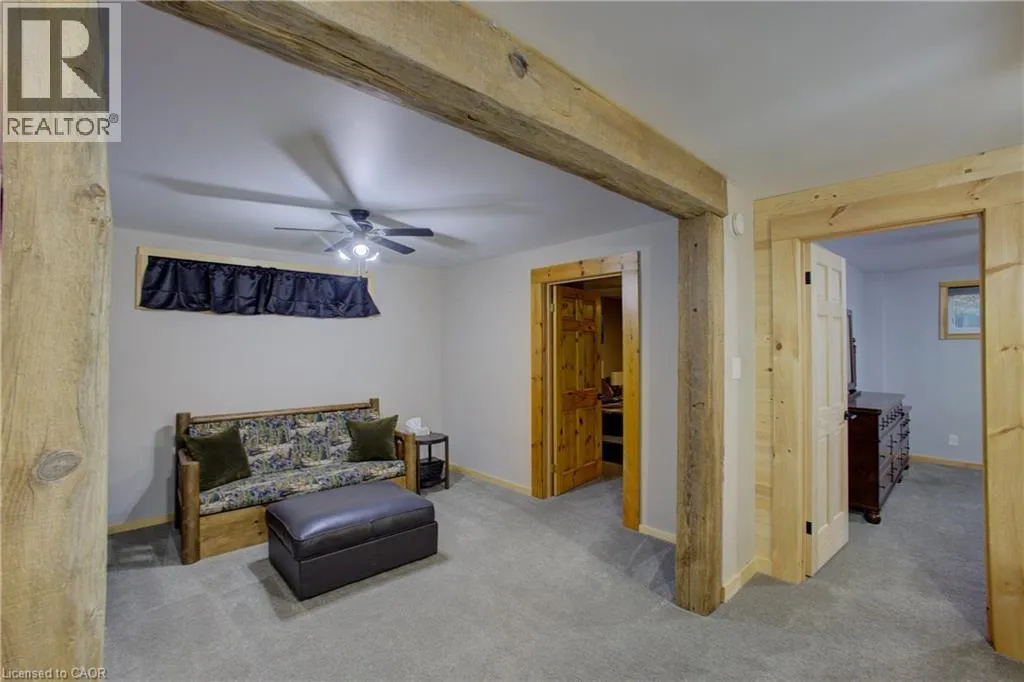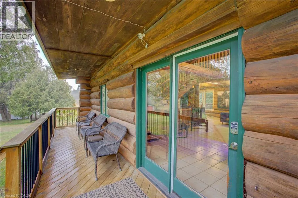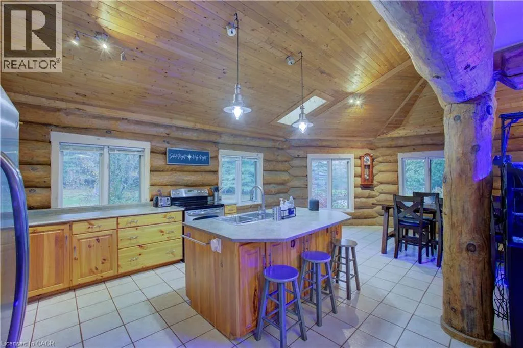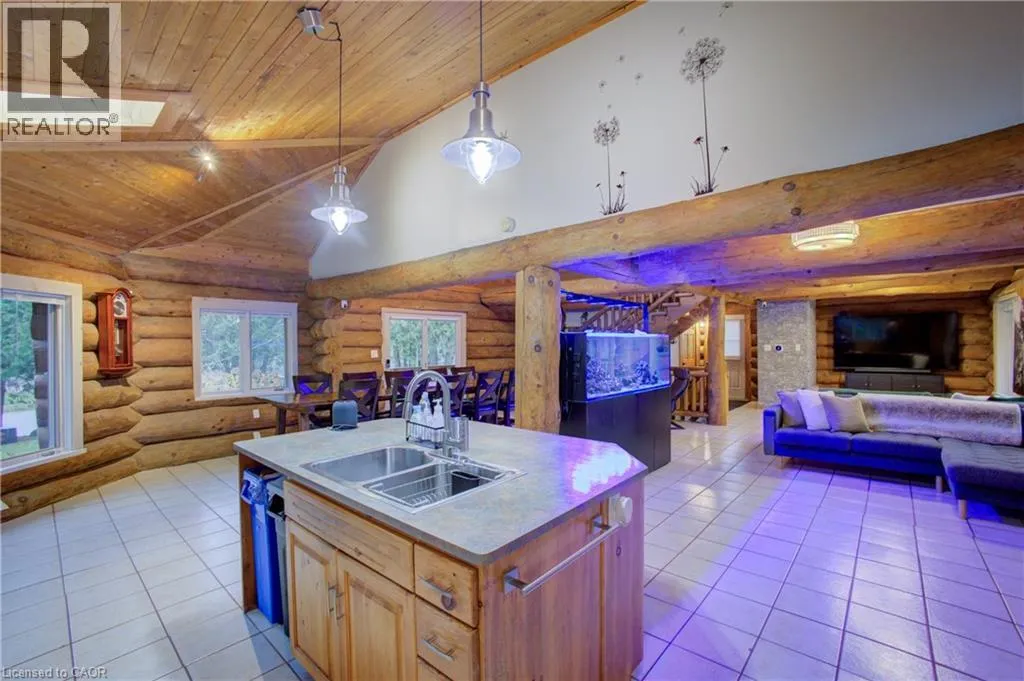 North of Mount Forest on west side of Highway 6 Tired of city living? Looking for a tranquil setting with a unique home? This could be the perfect home for you! This Scandinavian style log home is situated well away from the road for privacy on a beautiful, 11 acre lot with 360 degree scenic views. The home features a grand, open concept style with high vaulted ceilings, a skylight and upper windows providing lots of natural light, huge wood beams and walls, a spacious main floor layout with tiled flooring, a modern kitchen with island and Stainless appliances, and a full 4 piece bathroom. The second level is a huge loft with the Primary Bedroom and ensuite, and plenty of space for the workout and office area too! The basement has 3 additional bedrooms, a generous storage room, utility room, and a REC room. The home has hydronic in-floor heating for your comfort. For the car enthusiast or handyman, outside, there is a 30 X 40 insulated & heated shop/garage with double 10Ft Doors (interior has been divided into a 680s.f. heated workshop which can hold 3 cars and a 420s.f. single car garage with a TESLA charger). The property has lots of mature trees, two spring fed ponds with a small dock to relax on in the evening, and space for your canoe or paddleboat. The setting is perfect for evening hangouts around the firepit or on the porch. There is a 5 acre fenced pasture in front â raise your own livestock or ride your ATV here, another 3 acres at the north end, a small shed and a barn with water and 2 paddocks in addition to the 2 paddocks behind the garage area. There are many possibilities with enough land to have your own hobby farm, grow your own crops and raise your own chickens and eggs if that lifestyle appeals to you. Location is conveniently just north of Mount Forest and is just off Hwy 6 but below the grade of the highway for complete privacy! This home has everything you could want â it has to been seen to really appreciate all it has to offer. Come visit and see for yourself!! (id:27476)