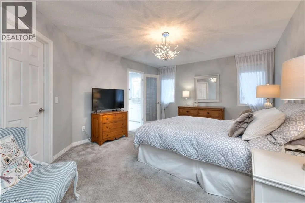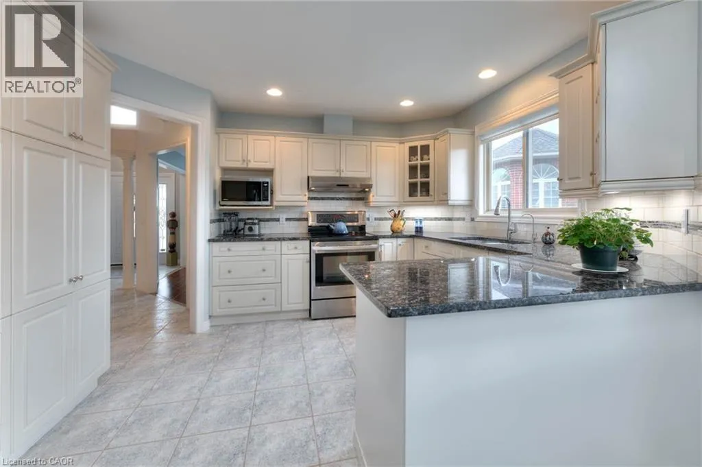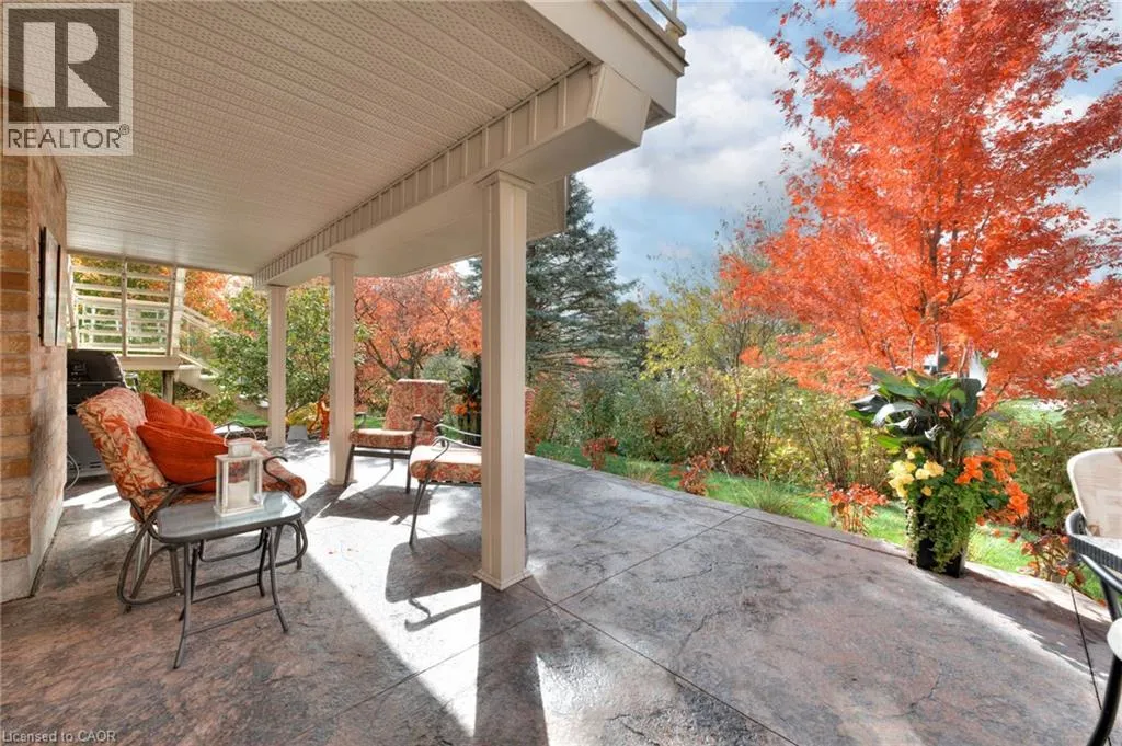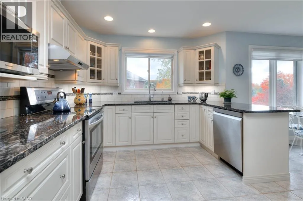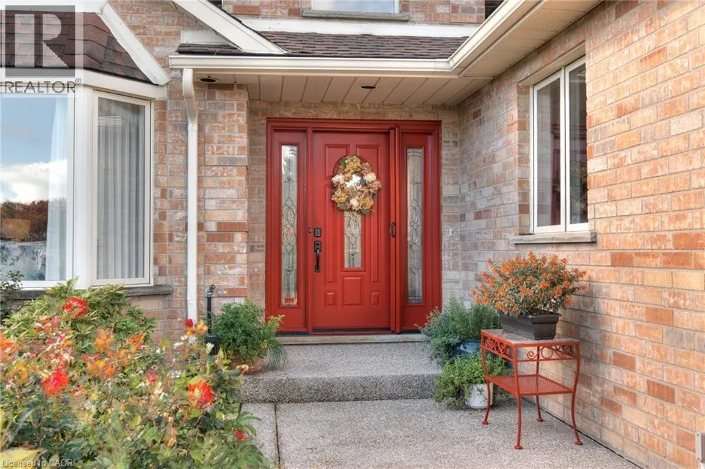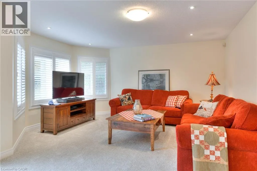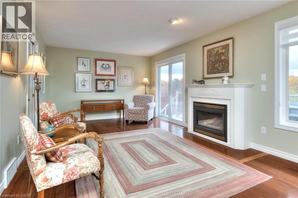 Erb's Road past Foxwood Golf Course, turn left into Foxboro Green, turn left on to Golf Links Drive, turn right on to Maue Court. Welcome to the highly desirable Foxboro Green Adult Lifestyle Community, nestled adjacent to Foxwood Golf Course. This impressive 1,900 sq ft home is situated on one of the communityâs premier lots, set in a serene cul-de-sac and offering a serene view of manicured greenspace. This elegant property boasts an elegant spiral staircase, soaring vaulted ceilings, rich hardwood flooring & exquisite French doors. With over $100,000 invested in updates, the home features tasteful decor and high-quality finishes throughout. The sunlit living room invites relaxation, while the gourmet eat-in kitchen, complete with granite countertops, offers both style and function. Entertain guests in the spacious dining room or unwind in the cozy family room, accentuated by a gas fireplace and direct access to a large deck overlooking the serene greenspace to enjoy your morning coffee or evening sunsets. The principal bedroom is a true retreat, featuring a walk-in closet, updated ensuite bath with a luxurious free-standing tub and captivating view. A second bedroom & modernized 3-piece bath provide ample accommodations for guests. The bright & fully finished walk-out basement level is a standout feature, offering 2 additional bedrooms, a versatile hobby room, a 3 pc bath, and an updated laundry room. The lower level also includes a cold cellar, storage room, and a comfortable sitting room with access to a large patio and a very private backyard. This all-brick home is completed by an oversized double garage. Residents of Foxboro Green enjoy access to a superb recreation center featuring a swimming pool, tennis/ pickleball courts, a library, party room, games room, exercise room & more. Scenic walking trails meander through the community, offering a picturesque backdrop for daily strolls. Located just 10 minutes from Waterloo, Costco, and the Ira Needles Boardwalk, this property offers both tranquility and convenience. Embrace an active and vibrant lifestyle in this exceptional home. (id:27476)