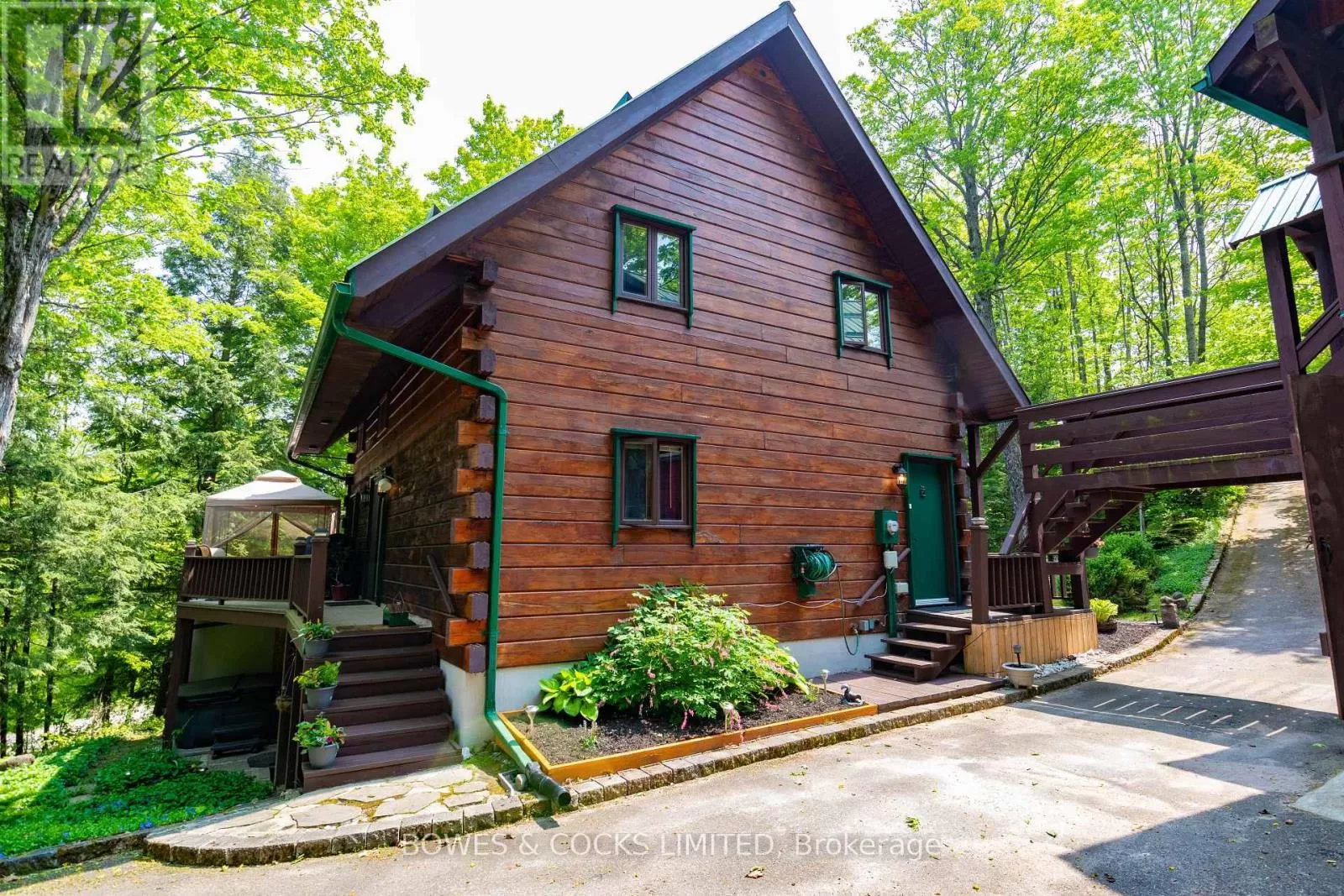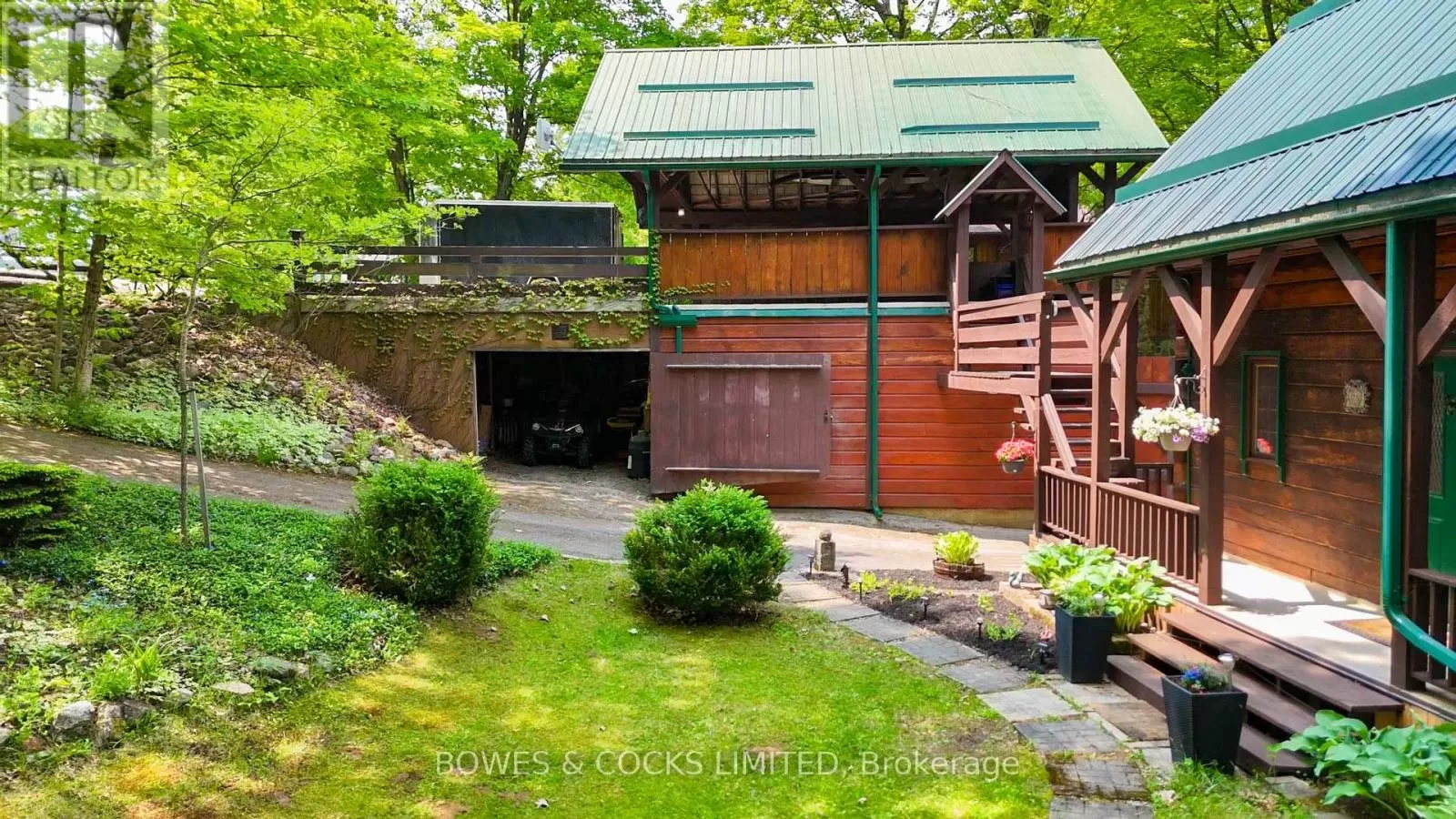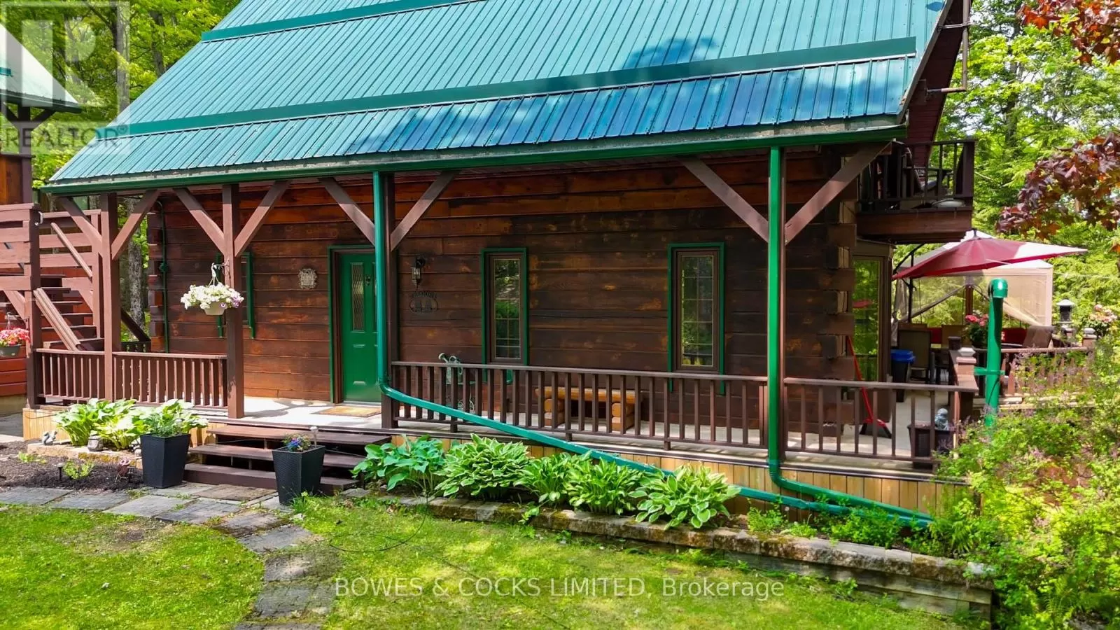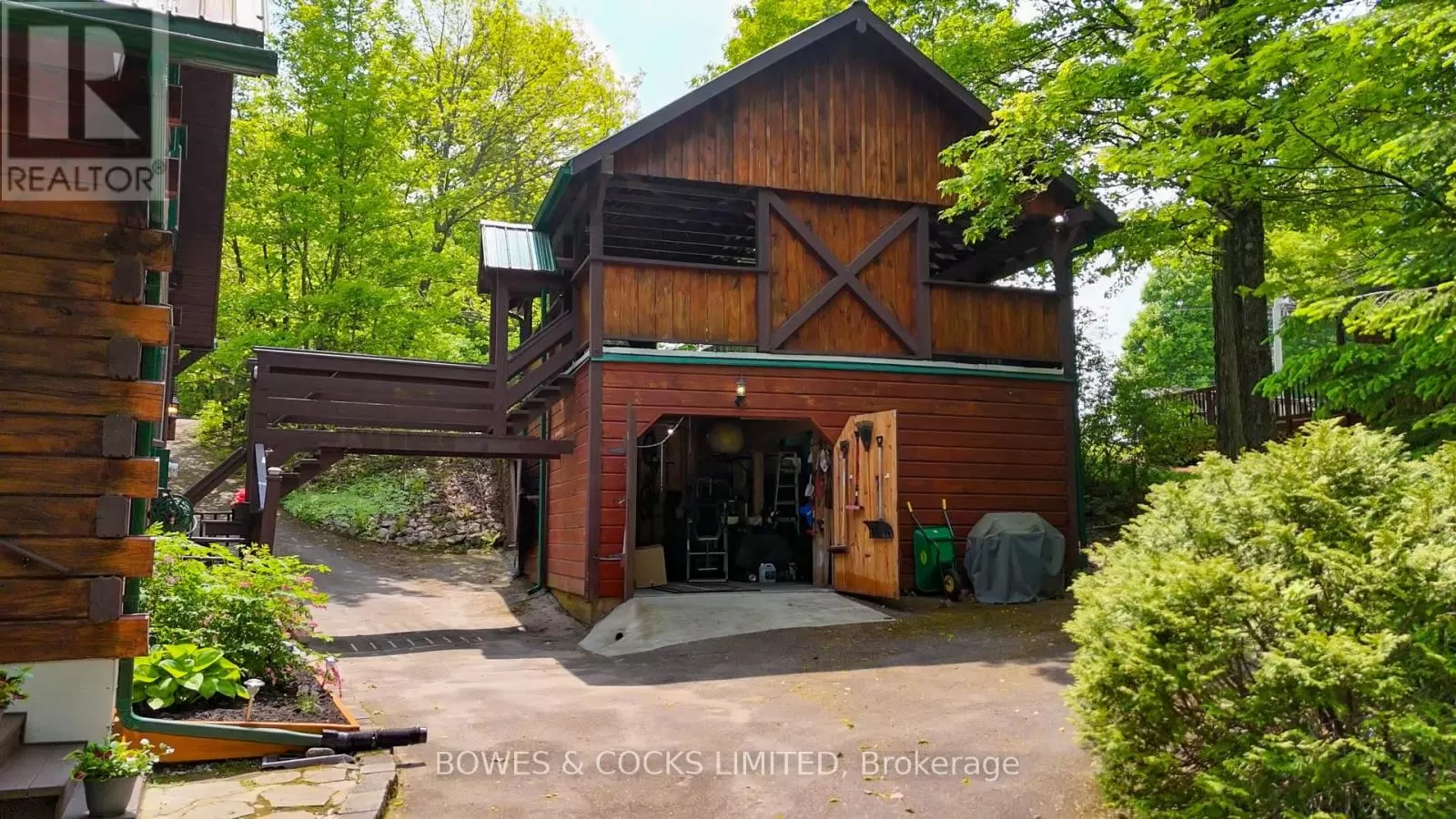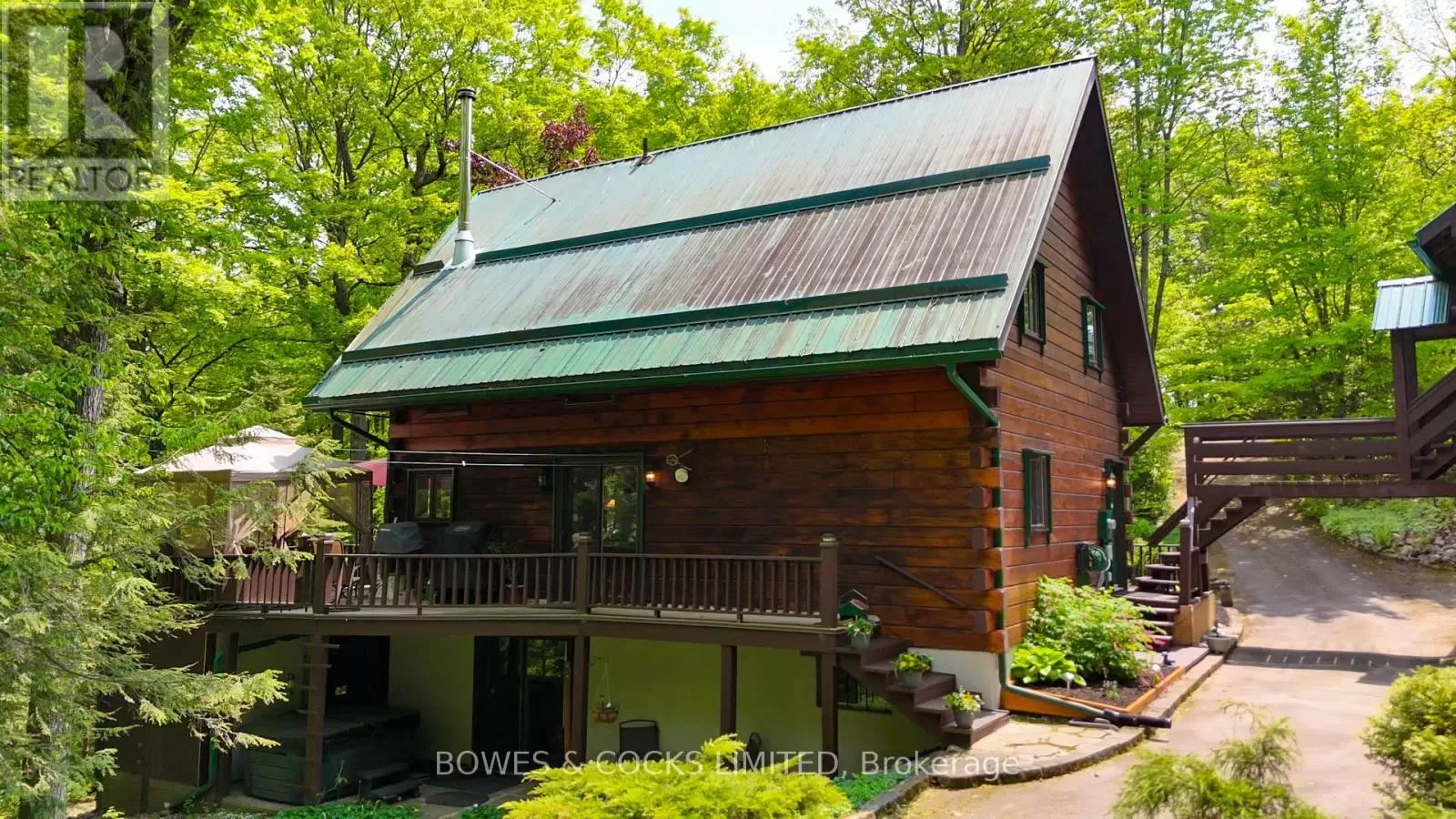 Chemaushgon Rd. to Forest Hill Dr. to Ridge Rd. Nestled on a quiet cul-de-sac just five minutes from downtown Bancroft, this custom-built log home offers a rare combination of rustic charm, modern comfort, and everyday convenience. Surrounded by beautifully landscaped, tree-lined grounds with natural stone accents, this two-storey home features three plus one bedrooms and three bathrooms, making it ideal for families or anyone seeking a tranquil escape with town amenities close at hand. Step inside the spacious main level where a large eat-in kitchen awaits, complete with stainless steel appliances, generous cupboard space, and a walkout to a wraparound deck that overlooks the peaceful, private property. A cozy sitting area, a practical mud and laundry room, and a versatile den or home office complete the main floor, creating a layout that's both functional and inviting. Upstairs, the serene primary suite features a four-piece ensuite, walk-in closet, and a walkout to a Juliette balcony perfect for quiet mornings with a view. The fully finished lower level offers a warm rec room with a woodstove, a workout room or fourth bedroom, a three-piece bathroom, and plenty of storage and utility space. The home is equipped with a forced air electric furnace, HVAC system, steel roof, heated eavestroughs, and a generator hookup to keep you comfortable year-round. A standout feature is the spacious two-storey detached garage and carport with hydro, easily accessed by a double driveway that provides separate access to both the upper and lower levels, offering ample parking and flexible use for vehicles, storage, or workshop space. With municipal services and direct access to the Heritage Trail from your driveway, this property is ideal for nature lovers and outdoor enthusiasts. You're also just minutes away from schools, shopping, golf, lakes, provincial parks, and a variety of trails. (id:27476)