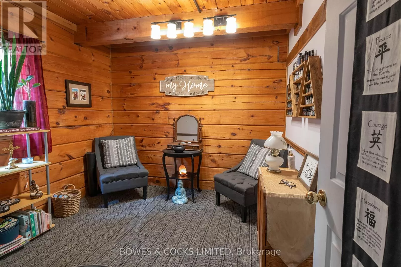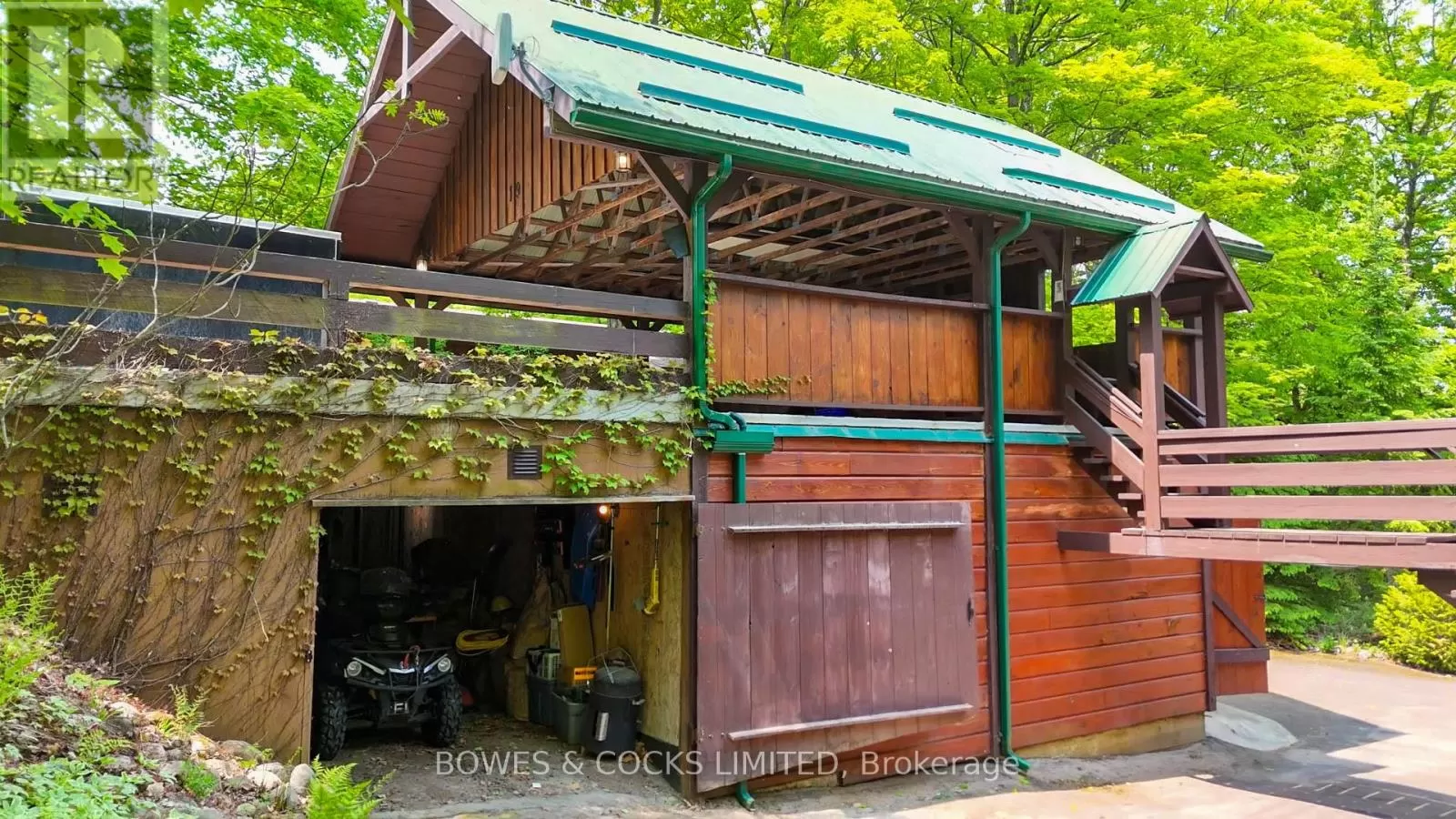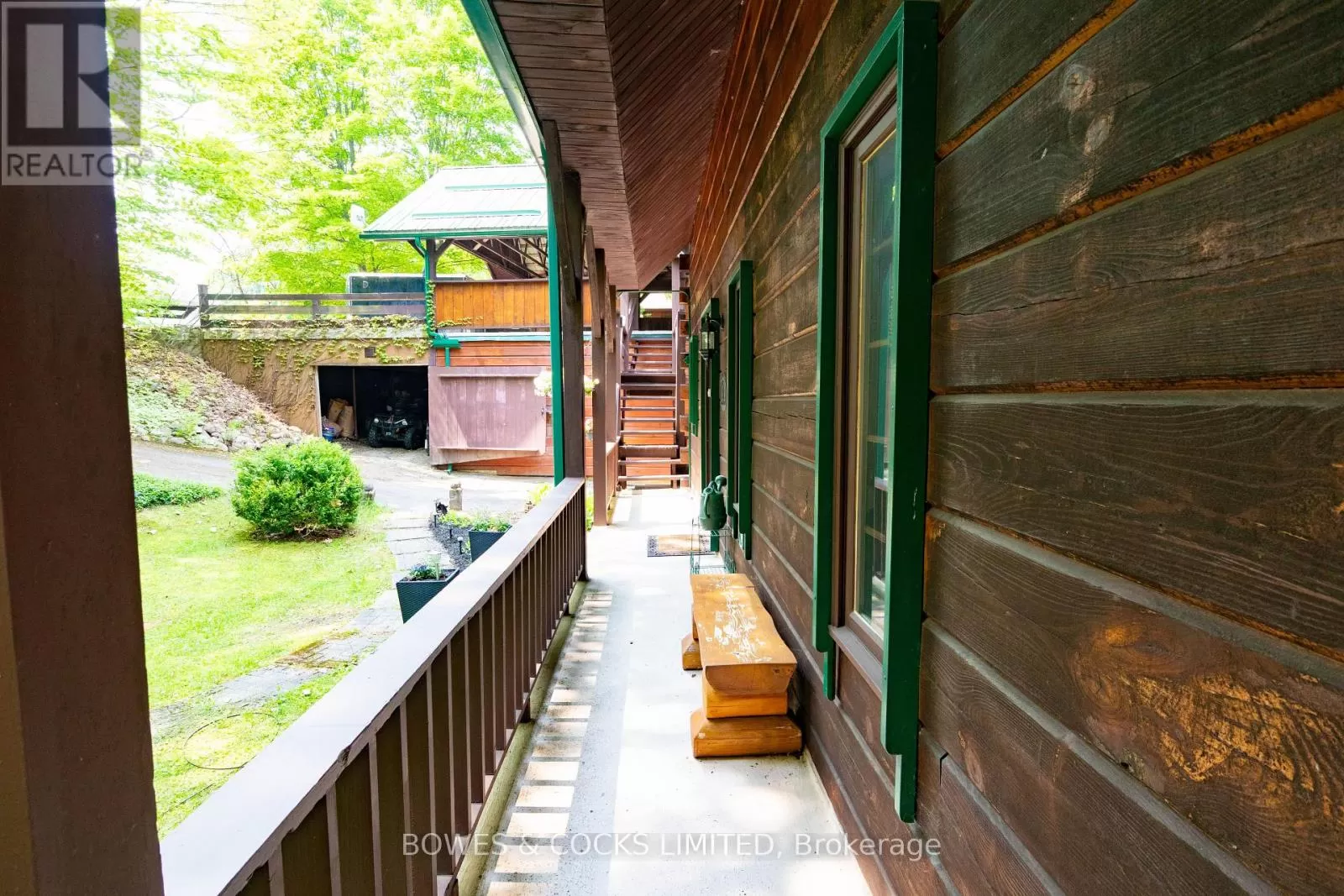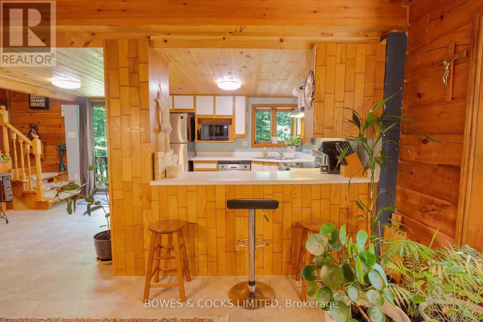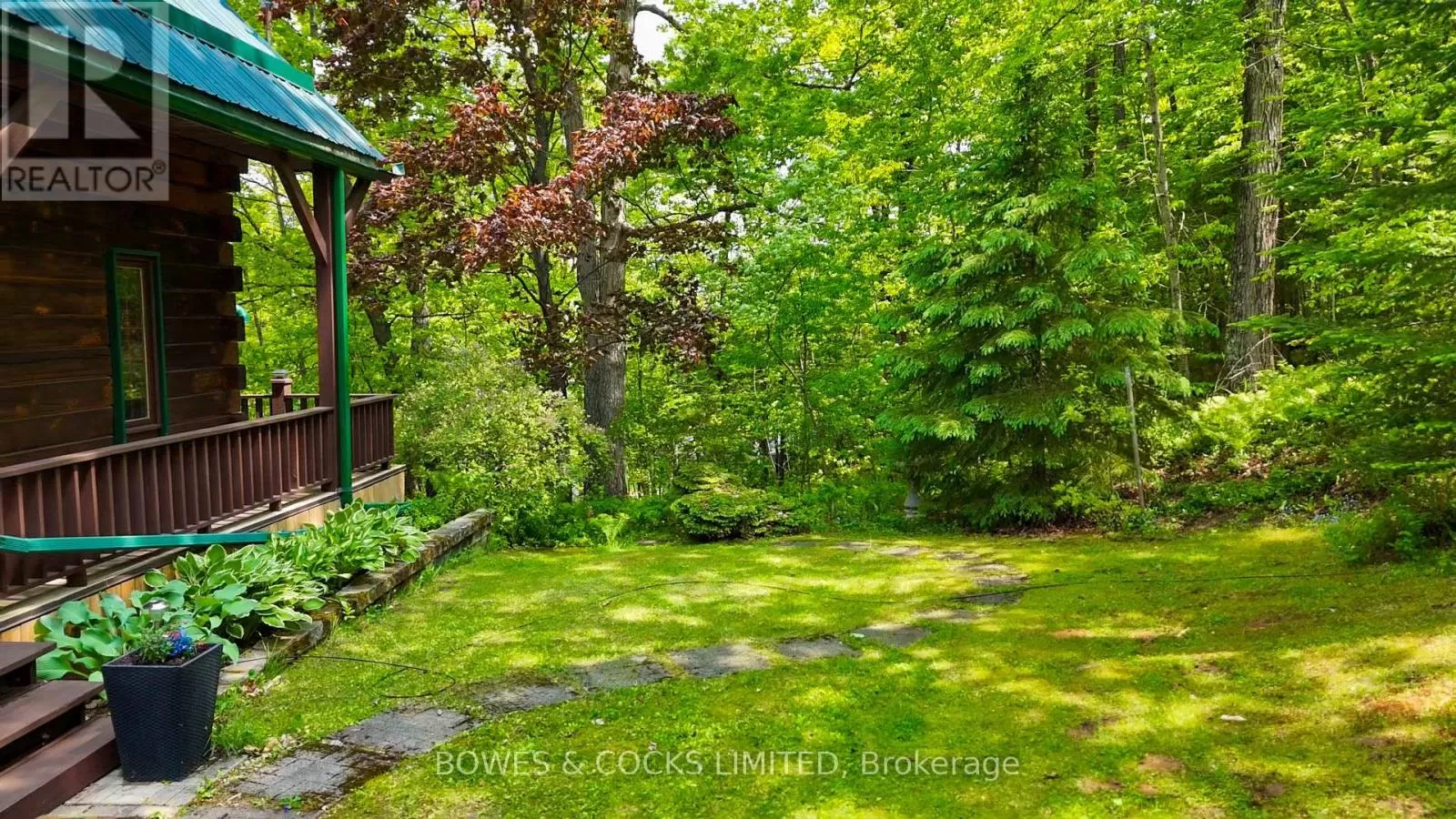 Chemaushgon Rd. to Forest Hill Dr. to Ridge Rd. Nestled on a quiet cul-de-sac just five minutes from downtown Bancroft, this custom-built log home offers a rare combination of rustic charm, modern comfort, and everyday convenience. Surrounded by beautifully landscaped, tree-lined grounds with natural stone accents, this two-storey home features three plus one bedrooms and three bathrooms, making it ideal for families or anyone seeking a tranquil escape with town amenities close at hand. Step inside the spacious main level where a large eat-in kitchen awaits, complete with stainless steel appliances, generous cupboard space, and a walkout to a wraparound deck that overlooks the peaceful, private property. A cozy sitting area, a practical mud and laundry room, and a versatile den or home office complete the main floor, creating a layout that's both functional and inviting. Upstairs, the serene primary suite features a four-piece ensuite, walk-in closet, and a walkout to a Juliette balcony perfect for quiet mornings with a view. The fully finished lower level offers a warm rec room with a woodstove, a workout room or fourth bedroom, a three-piece bathroom, and plenty of storage and utility space. The home is equipped with a forced air electric furnace, HVAC system, steel roof, heated eavestroughs, and a generator hookup to keep you comfortable year-round. A standout feature is the spacious two-storey detached garage and carport with hydro, easily accessed by a double driveway that provides separate access to both the upper and lower levels, offering ample parking and flexible use for vehicles, storage, or workshop space. With municipal services and direct access to the Heritage Trail from your driveway, this property is ideal for nature lovers and outdoor enthusiasts. You're also just minutes away from schools, shopping, golf, lakes, provincial parks, and a variety of trails. (id:27476)