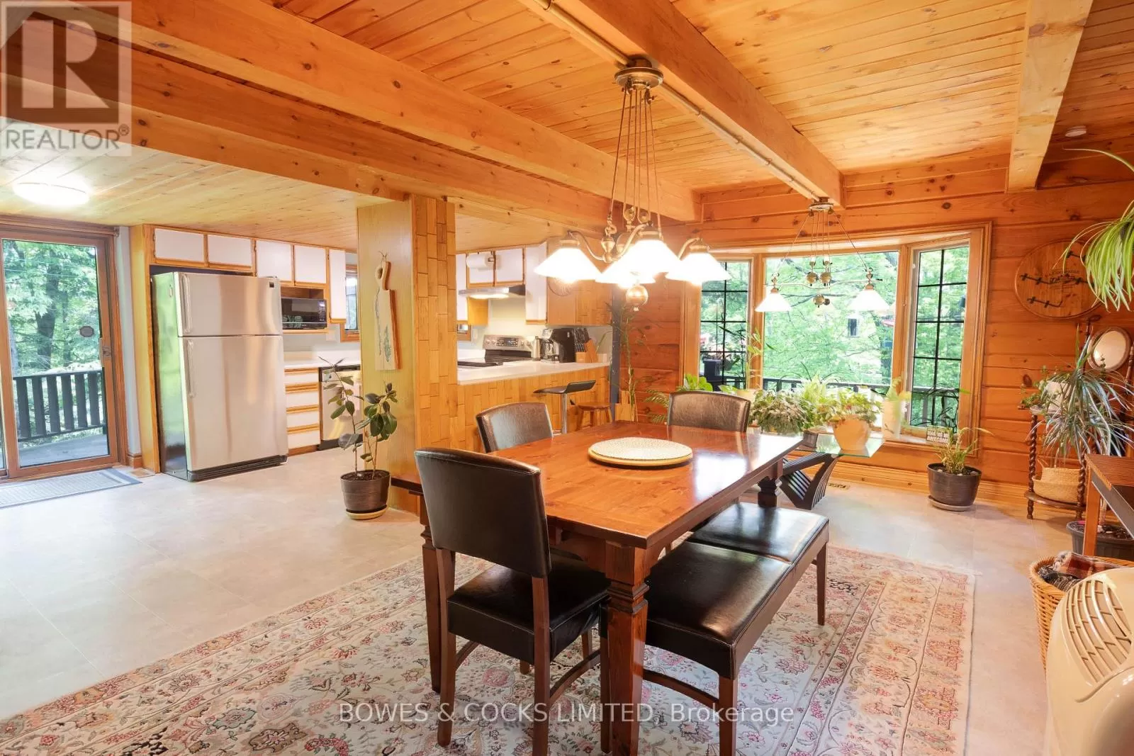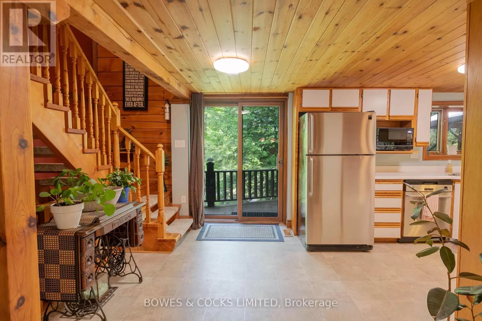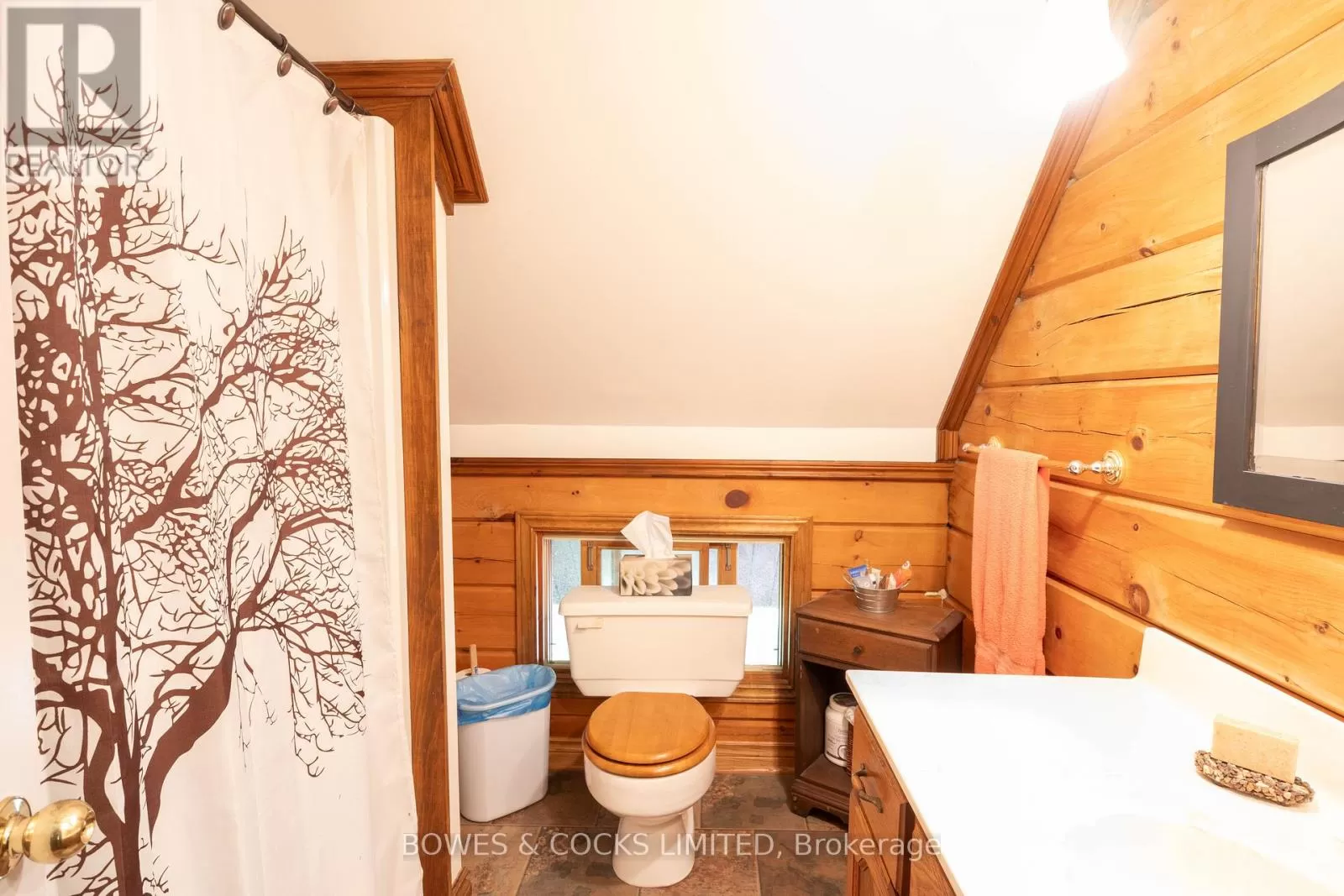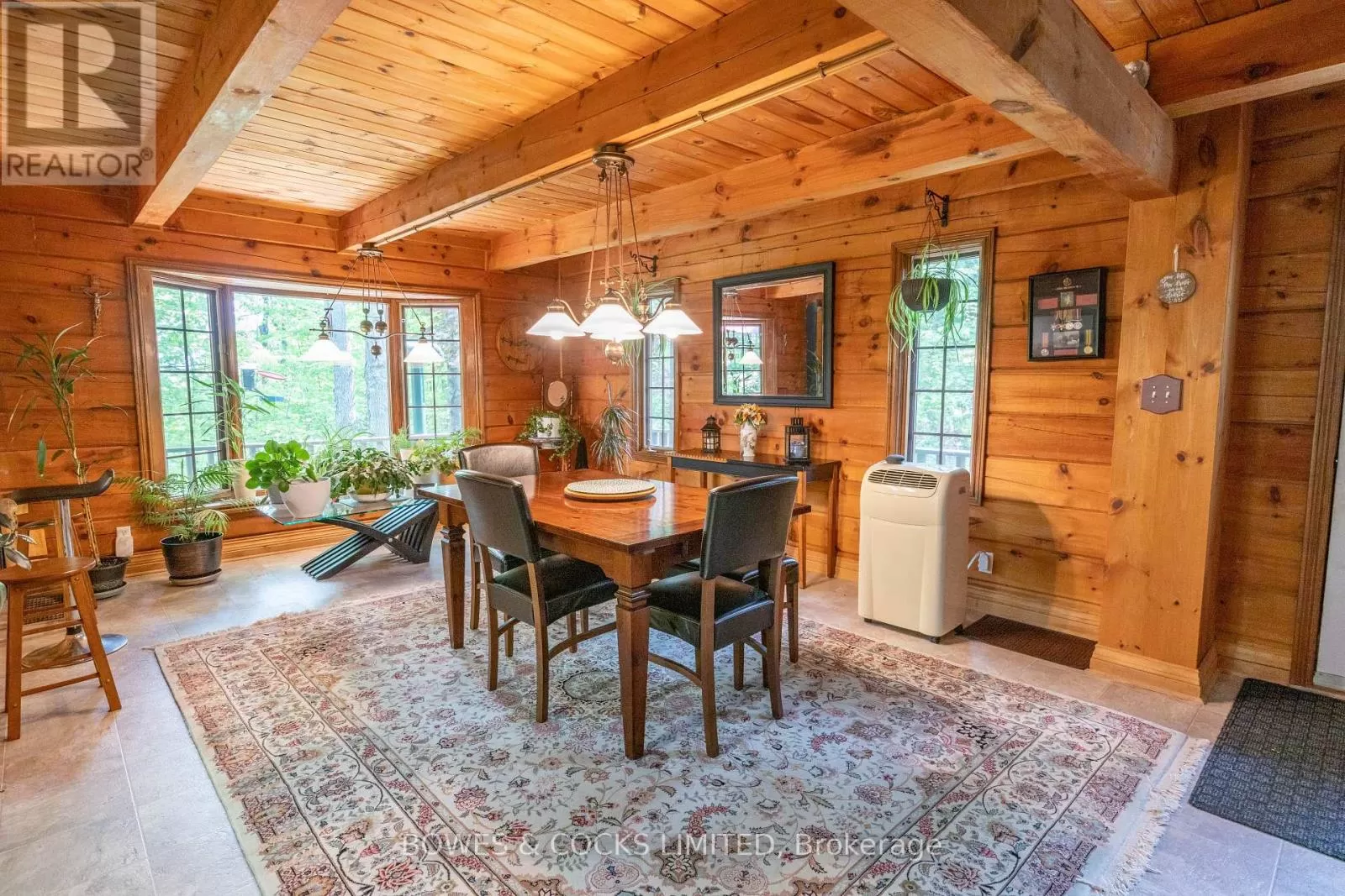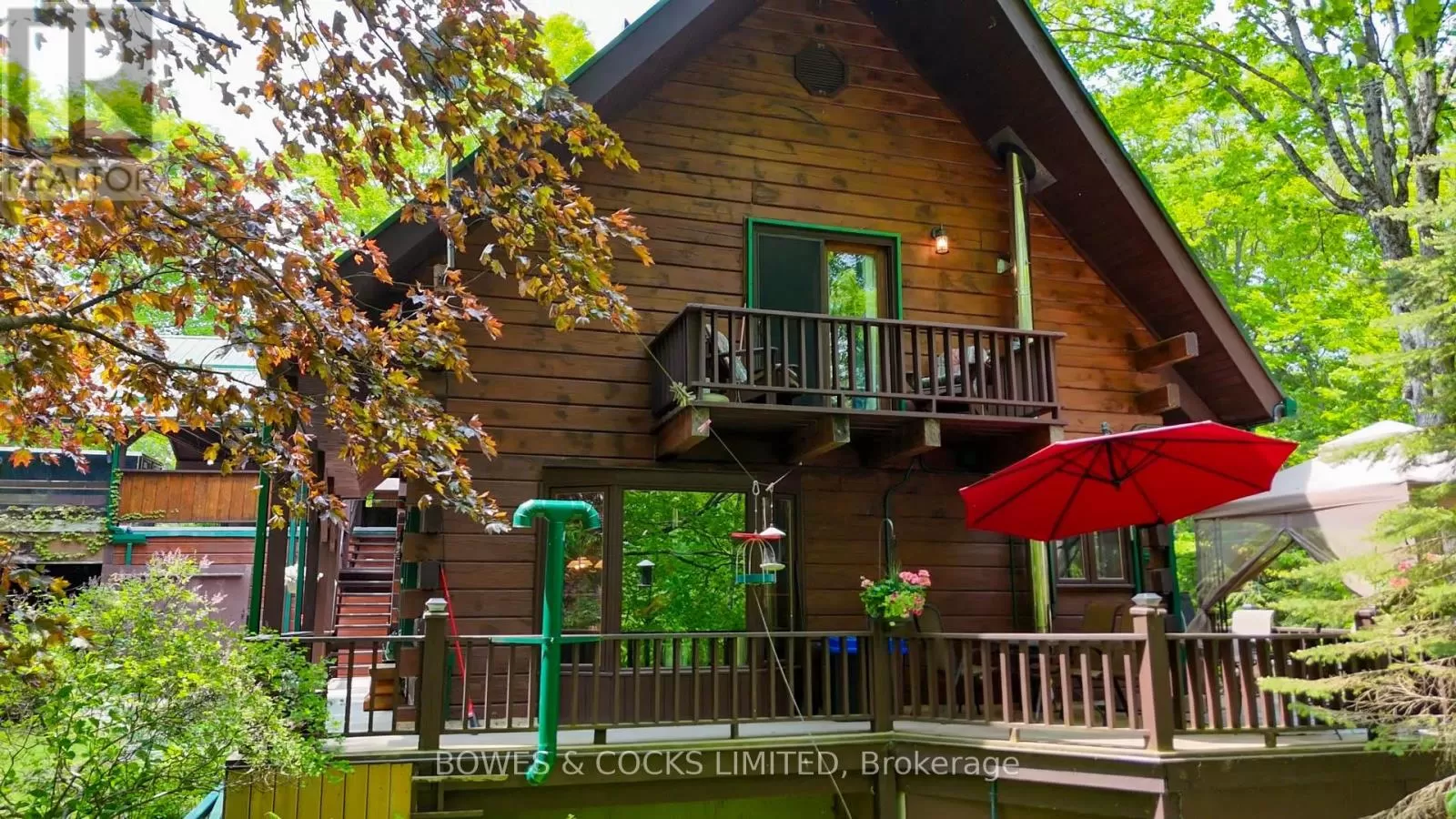 Chemaushgon Rd. to Forest Hill Dr. to Ridge Rd. Nestled on a quiet cul-de-sac just five minutes from downtown Bancroft, this custom-built log home offers a rare combination of rustic charm, modern comfort, and everyday convenience. Surrounded by beautifully landscaped, tree-lined grounds with natural stone accents, this two-storey home features three plus one bedrooms and three bathrooms, making it ideal for families or anyone seeking a tranquil escape with town amenities close at hand. Step inside the spacious main level where a large eat-in kitchen awaits, complete with stainless steel appliances, generous cupboard space, and a walkout to a wraparound deck that overlooks the peaceful, private property. A cozy sitting area, a practical mud and laundry room, and a versatile den or home office complete the main floor, creating a layout that's both functional and inviting. Upstairs, the serene primary suite features a four-piece ensuite, walk-in closet, and a walkout to a Juliette balcony perfect for quiet mornings with a view. The fully finished lower level offers a warm rec room with a woodstove, a workout room or fourth bedroom, a three-piece bathroom, and plenty of storage and utility space. The home is equipped with a forced air electric furnace, HVAC system, steel roof, heated eavestroughs, and a generator hookup to keep you comfortable year-round. A standout feature is the spacious two-storey detached garage and carport with hydro, easily accessed by a double driveway that provides separate access to both the upper and lower levels, offering ample parking and flexible use for vehicles, storage, or workshop space. With municipal services and direct access to the Heritage Trail from your driveway, this property is ideal for nature lovers and outdoor enthusiasts. You're also just minutes away from schools, shopping, golf, lakes, provincial parks, and a variety of trails. (id:27476)