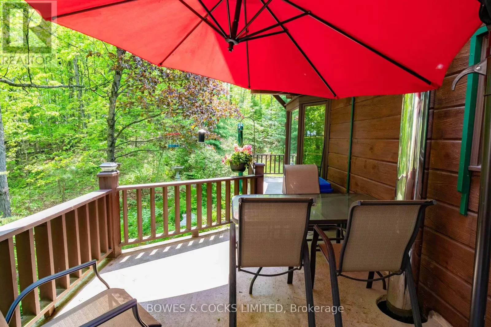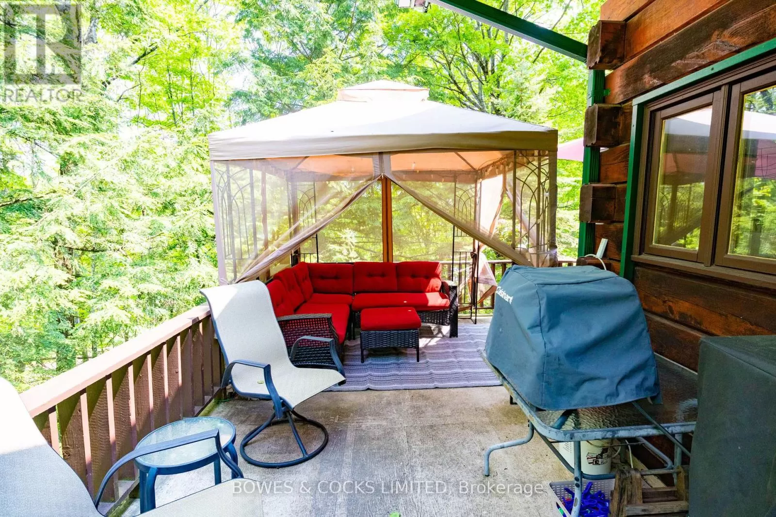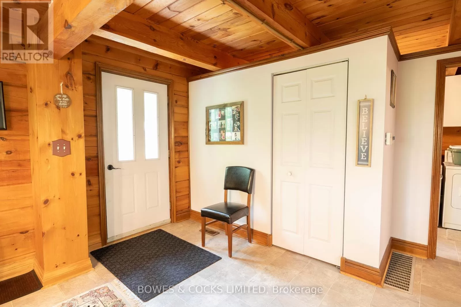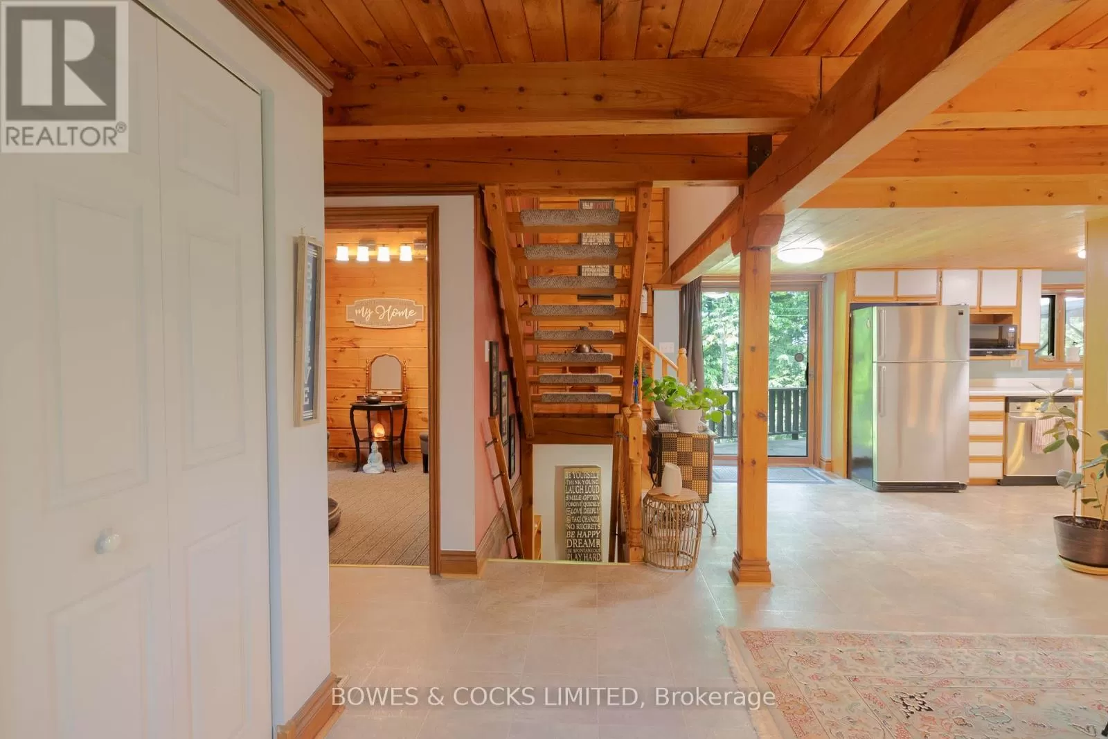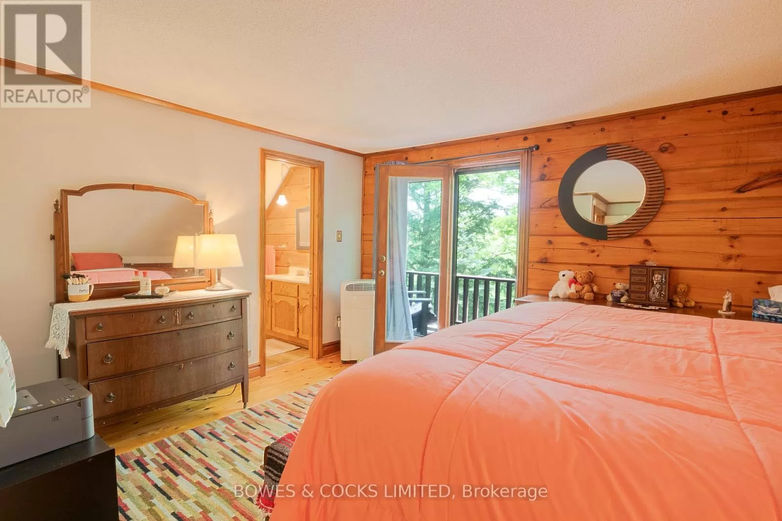 Chemaushgon Rd. to Forest Hill Dr. to Ridge Rd. Nestled on a quiet cul-de-sac just five minutes from downtown Bancroft, this custom-built log home offers a rare combination of rustic charm, modern comfort, and everyday convenience. Surrounded by beautifully landscaped, tree-lined grounds with natural stone accents, this two-storey home features three plus one bedrooms and three bathrooms, making it ideal for families or anyone seeking a tranquil escape with town amenities close at hand. Step inside the spacious main level where a large eat-in kitchen awaits, complete with stainless steel appliances, generous cupboard space, and a walkout to a wraparound deck that overlooks the peaceful, private property. A cozy sitting area, a practical mud and laundry room, and a versatile den or home office complete the main floor, creating a layout that's both functional and inviting. Upstairs, the serene primary suite features a four-piece ensuite, walk-in closet, and a walkout to a Juliette balcony perfect for quiet mornings with a view. The fully finished lower level offers a warm rec room with a woodstove, a workout room or fourth bedroom, a three-piece bathroom, and plenty of storage and utility space. The home is equipped with a forced air electric furnace, HVAC system, steel roof, heated eavestroughs, and a generator hookup to keep you comfortable year-round. A standout feature is the spacious two-storey detached garage and carport with hydro, easily accessed by a double driveway that provides separate access to both the upper and lower levels, offering ample parking and flexible use for vehicles, storage, or workshop space. With municipal services and direct access to the Heritage Trail from your driveway, this property is ideal for nature lovers and outdoor enthusiasts. You're also just minutes away from schools, shopping, golf, lakes, provincial parks, and a variety of trails. (id:27476)
