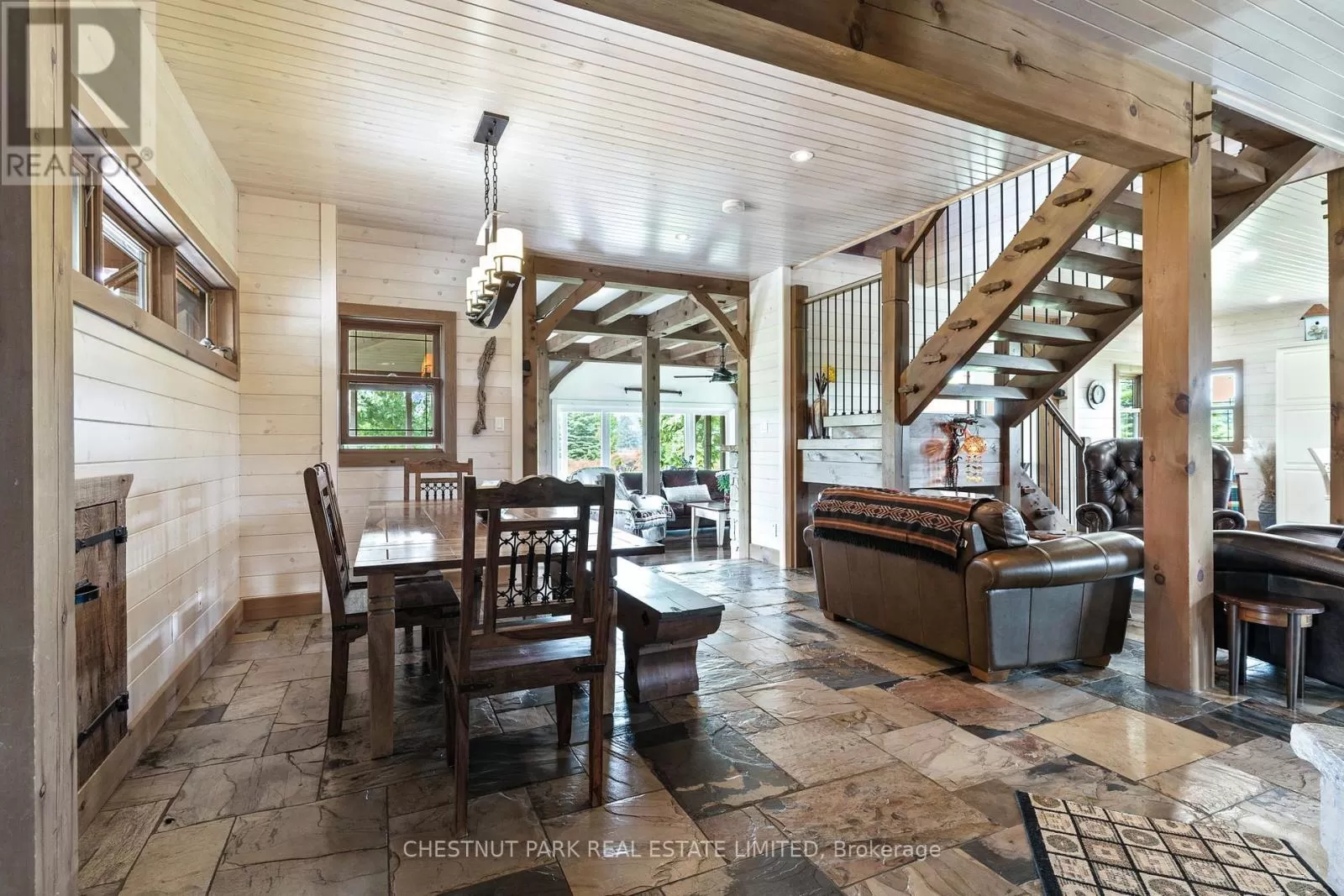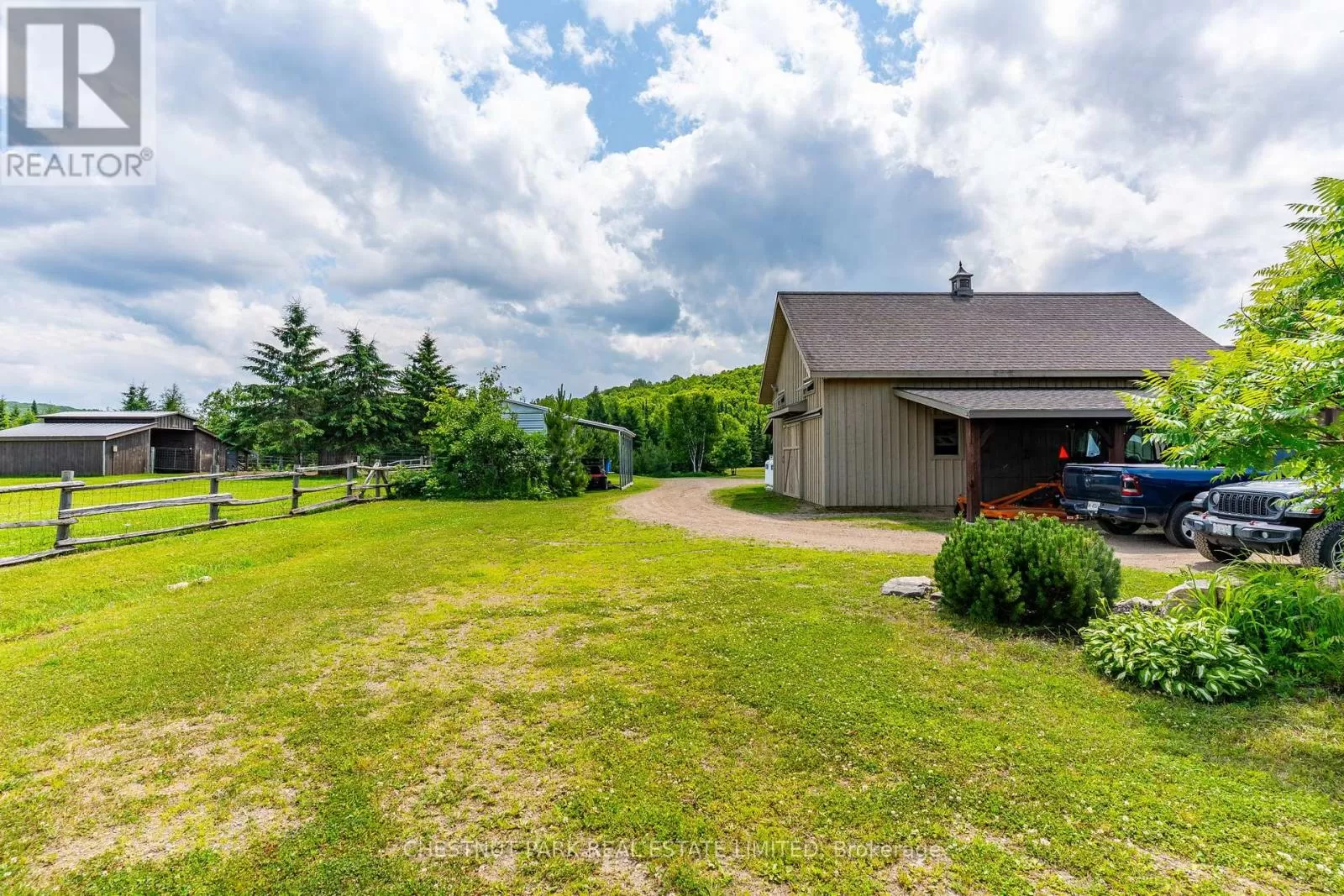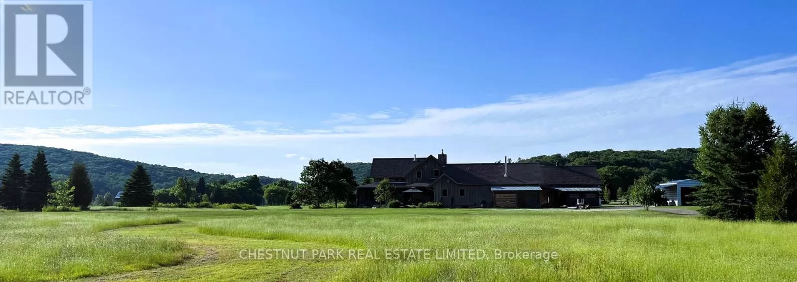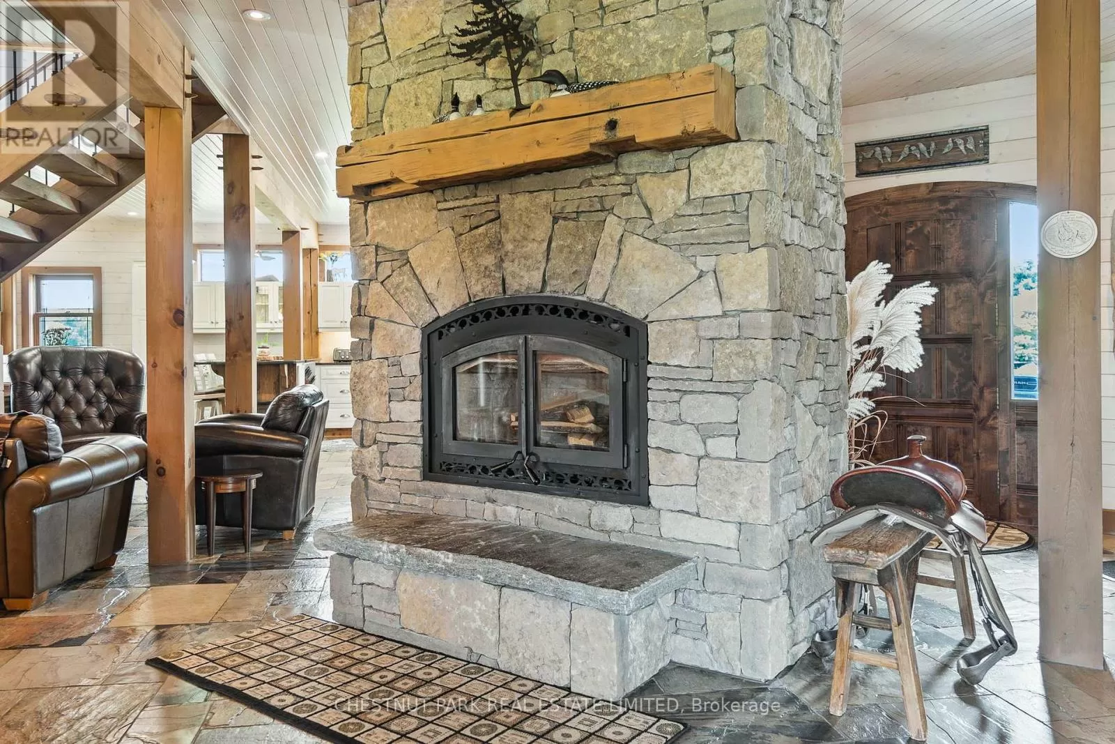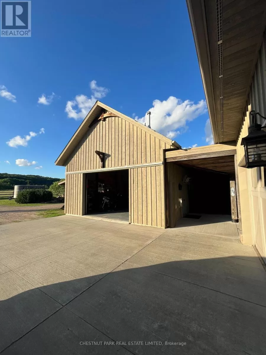 Cross Streets: 62 North & Maxwell Settlement. ** Directions: 62 North, East on Maxwell Settlement. An extraordinary country estate set on 122 acres of rolling pasture, hardwood forest, and scenic trails. This timeless Discovery Dream Homes Timber Frame hybrid draws inspiration from classic farmhouse architecture and is finished with exceptional craftsmanship, reclaimed pine barn boards, slate tile, engineered alder and walnut floors, solid alder doors, and a dramatic 600 sq ft timber-framed great room with a stone fireplace. The 4-bedroom home is designed for comfort and connection, featuring a custom kitchen, handcrafted timber staircase, mahogany-accented upper level, and a screened-in timber porch. Step outside to the expansive outdoor entertaining terrace ideal for al fresco dining, evening gatherings, and taking in the sweeping countryside views. Equestrian-ready with 25+ acres of fenced pasture, horse paddocks, a 24x36 barn with two 10x20 stalls (with power and water), and a hay barn with covered storage. A 2-car garage is attached to the home, and a separate garage includes a workshop and office space perfect for creative pursuits or home-based business. A private trail network winds through managed forest, leading to a charming wildlife viewing cabin overlooking Grace Lake and adjoining crown land. With in-floor radiant and gas heating, an Amberwood front door, and inclusion in the Managed Forest Program, this property offers the ultimate in luxury, privacy, and rural sophistication. (id:27476)