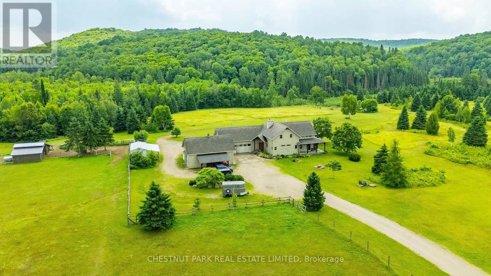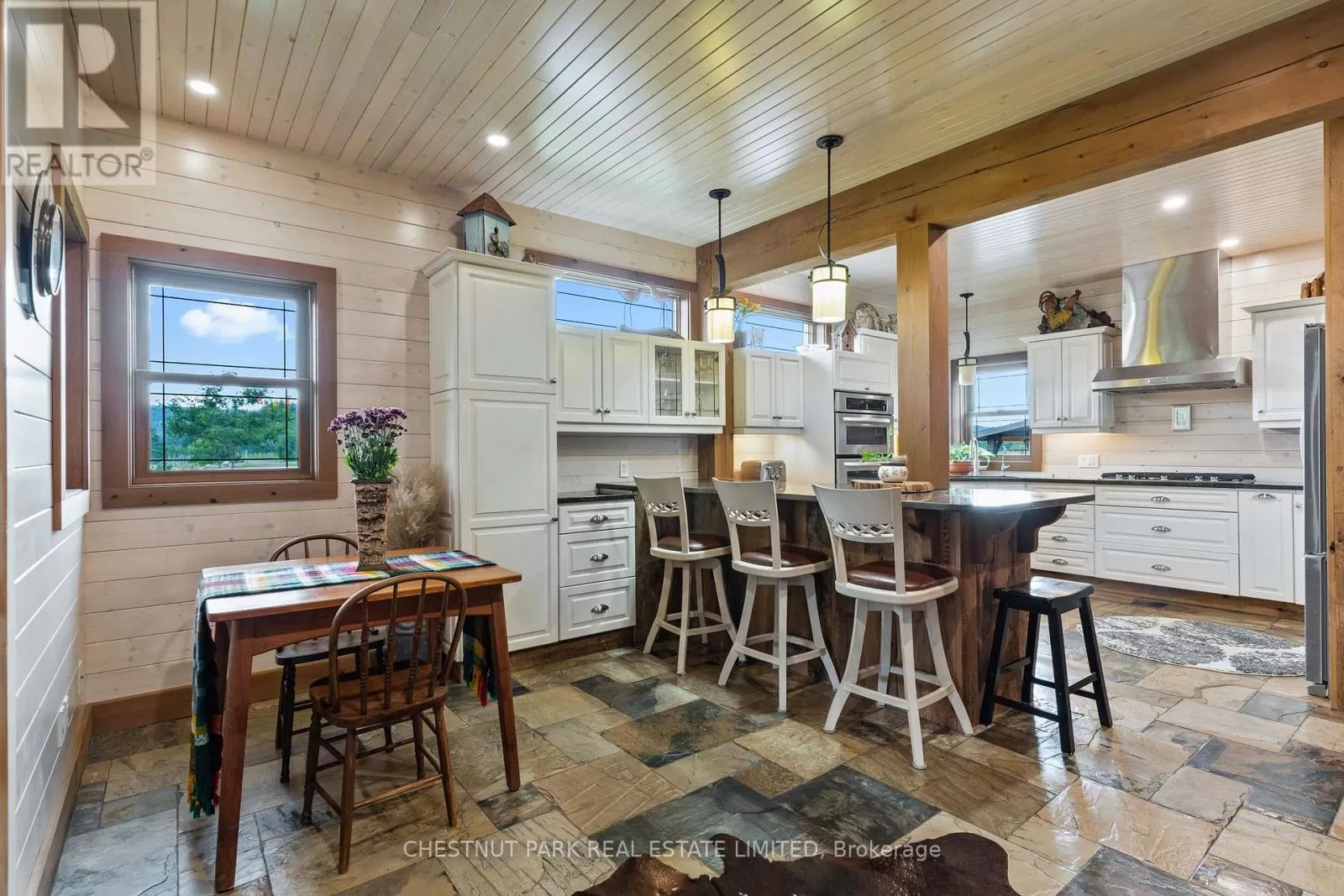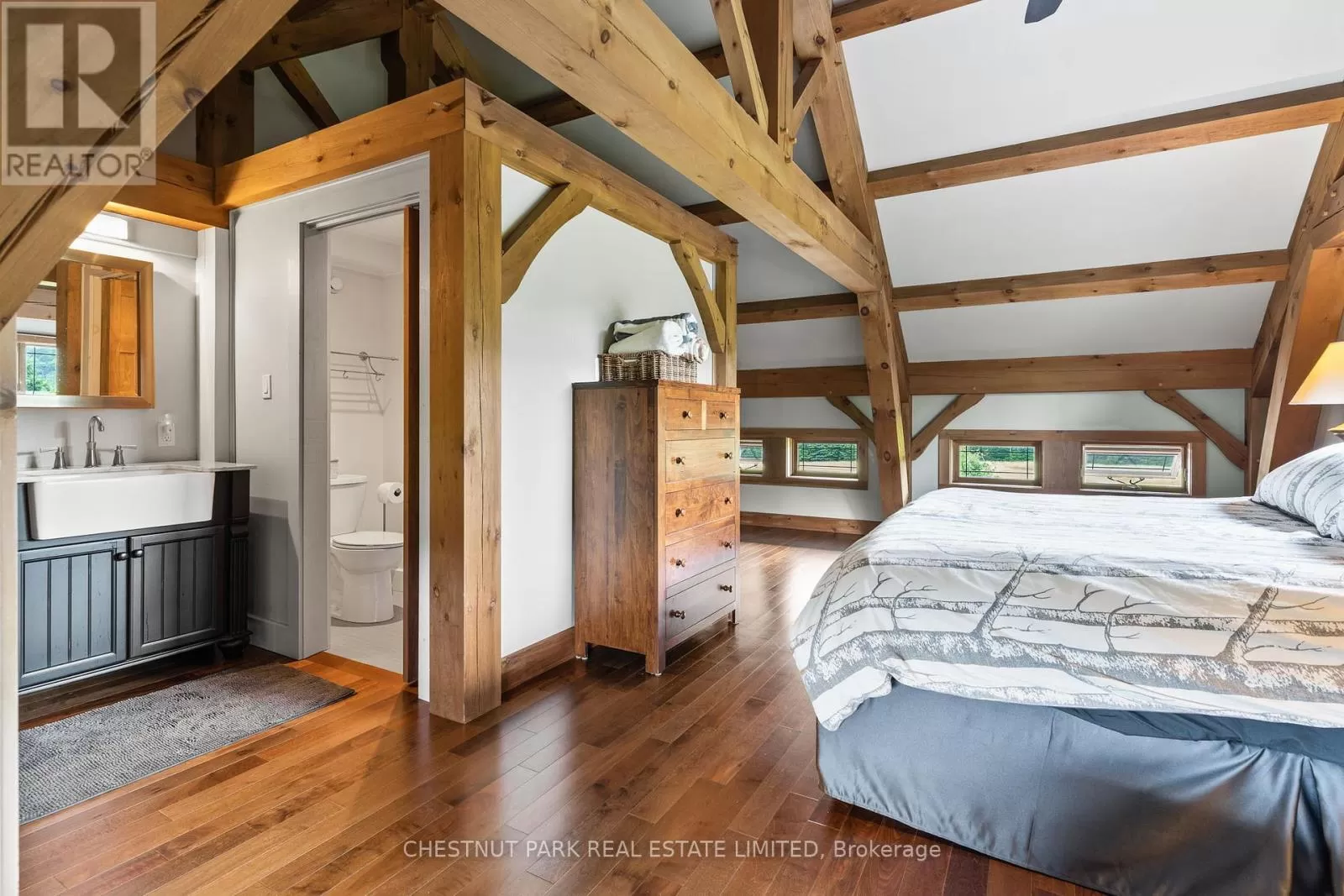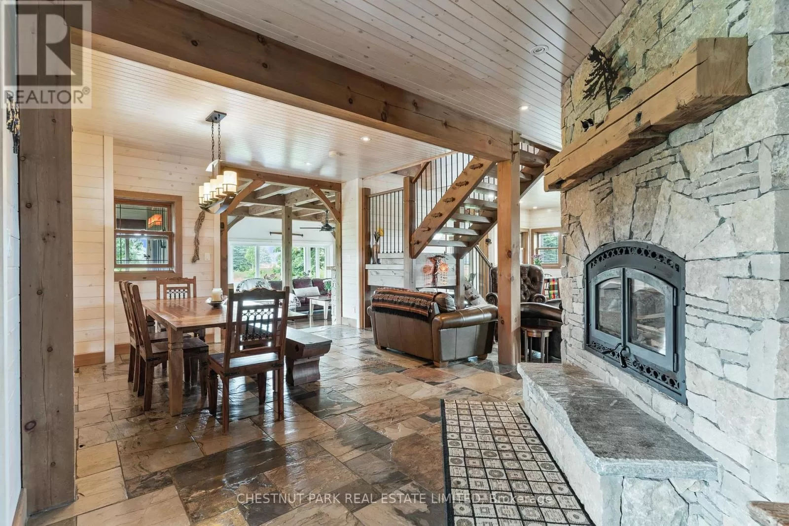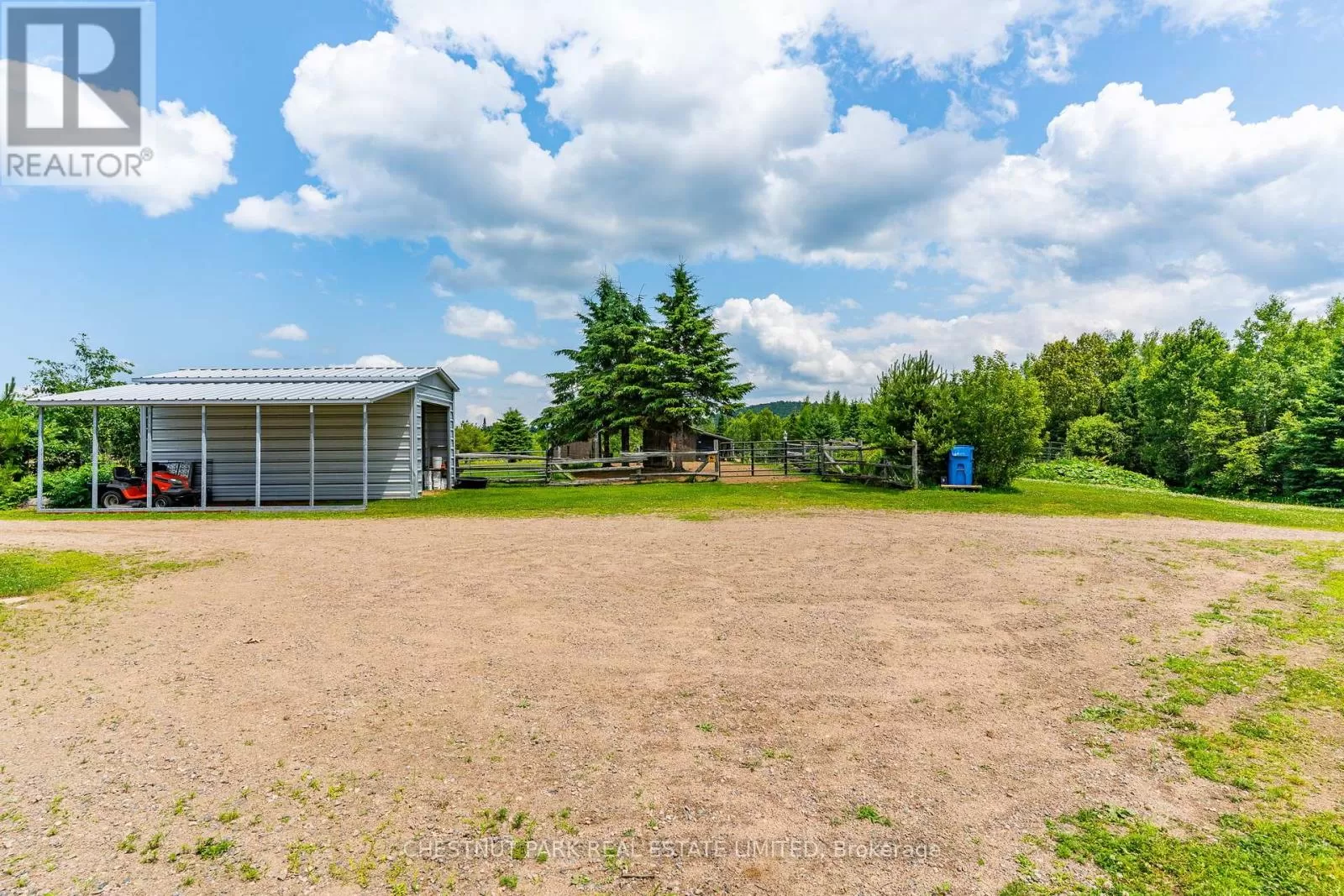 Cross Streets: 62 North & Maxwell Settlement. ** Directions: 62 North, East on Maxwell Settlement. An extraordinary country estate set on 122 acres of rolling pasture, hardwood forest, and scenic trails. This timeless Discovery Dream Homes Timber Frame hybrid draws inspiration from classic farmhouse architecture and is finished with exceptional craftsmanship, reclaimed pine barn boards, slate tile, engineered alder and walnut floors, solid alder doors, and a dramatic 600 sq ft timber-framed great room with a stone fireplace. The 4-bedroom home is designed for comfort and connection, featuring a custom kitchen, handcrafted timber staircase, mahogany-accented upper level, and a screened-in timber porch. Step outside to the expansive outdoor entertaining terrace ideal for al fresco dining, evening gatherings, and taking in the sweeping countryside views. Equestrian-ready with 25+ acres of fenced pasture, horse paddocks, a 24x36 barn with two 10x20 stalls (with power and water), and a hay barn with covered storage. A 2-car garage is attached to the home, and a separate garage includes a workshop and office space perfect for creative pursuits or home-based business. A private trail network winds through managed forest, leading to a charming wildlife viewing cabin overlooking Grace Lake and adjoining crown land. With in-floor radiant and gas heating, an Amberwood front door, and inclusion in the Managed Forest Program, this property offers the ultimate in luxury, privacy, and rural sophistication. (id:27476)
