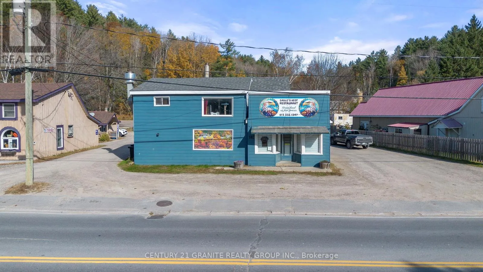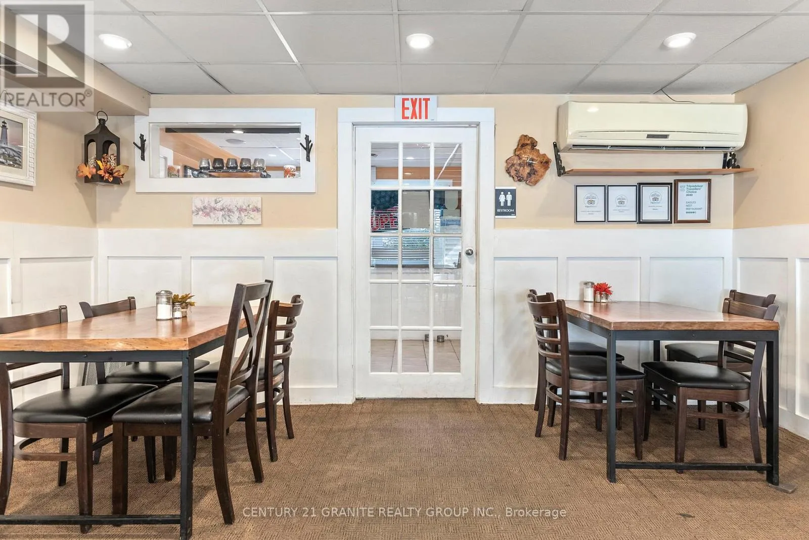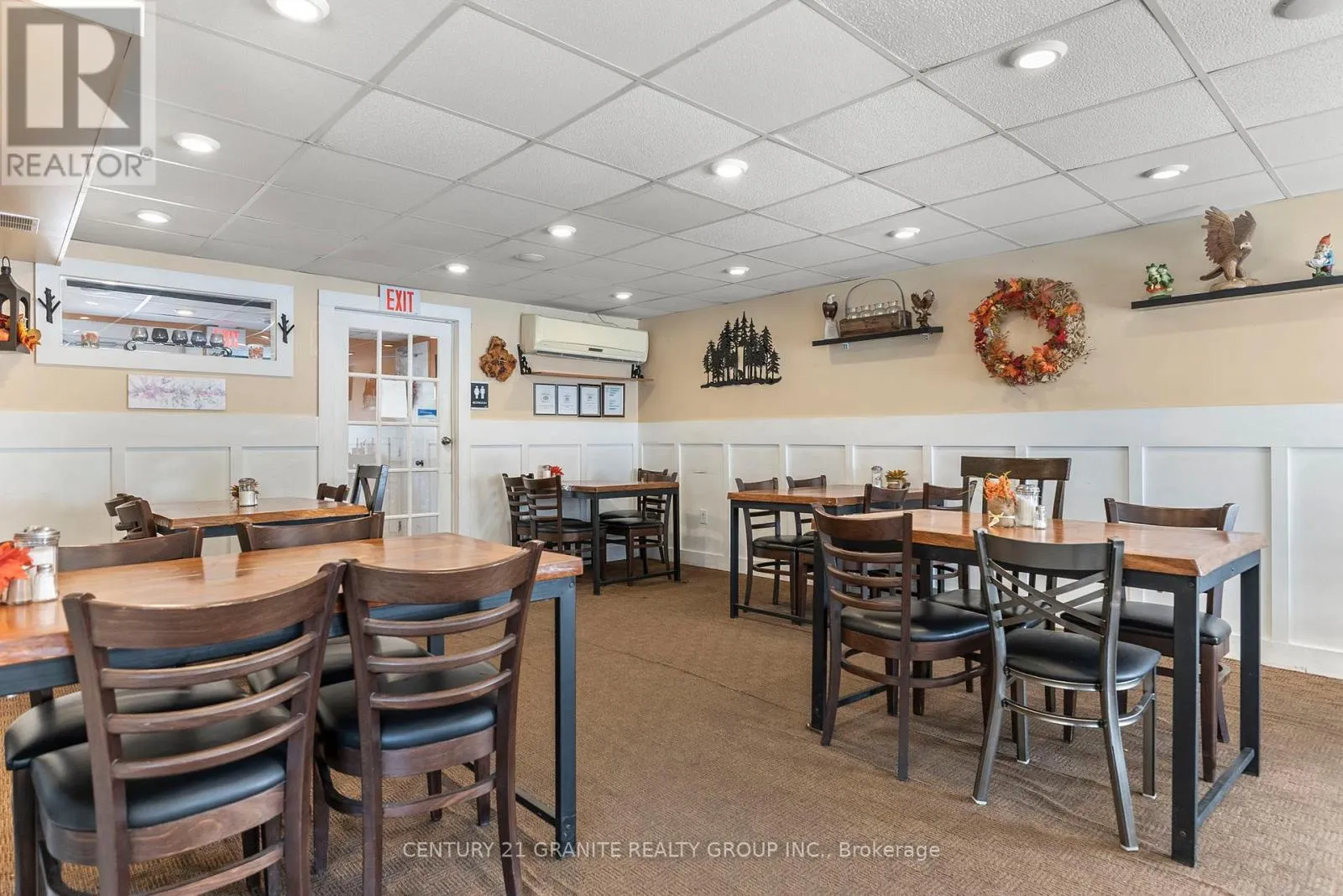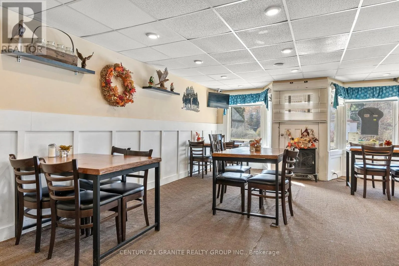 Cross Streets: Hastings St N. ** Directions: From Bancroft take Hastings St N towards Birds Creek. See signs beside Loyalist College. Ready to bring your business dreams to life? This turn-key restaurant comes with a bright and spacious 2-bedroom apartment (574 sq ft) above-perfect for living where you work or generating rental income. The main floor offers a fully equipped restaurant setup with Main Street commercial zoning, giving you the freedom to run a cafe, retail shop, takeover the very successful established restaurant or any venture you've been dreaming of. Enjoy the convenience of municipal water and the affordability of a private septic, plus a private parking lot for 8+ vehicles-a rare find in town! The restaurant is equipped with owned commercial appliances, male and female washrooms, foyer, 15x24 ft dining area with an additional 12.5x14ft flex space to accommodate more diners. Located just steps from downtown Bancroft, you'll benefit from high visibility and steady local traffic, surrounded by other established businesses in one of Ontario's fastest-growing small towns. Whether you're an entrepreneur ready to serve the community or an investor looking for a smart mixed-use opportunity. Live upstairs. Work downstairs. Grow your future-all right here in Bancroft. The restaurant is sold fully equipped. (id:27476)