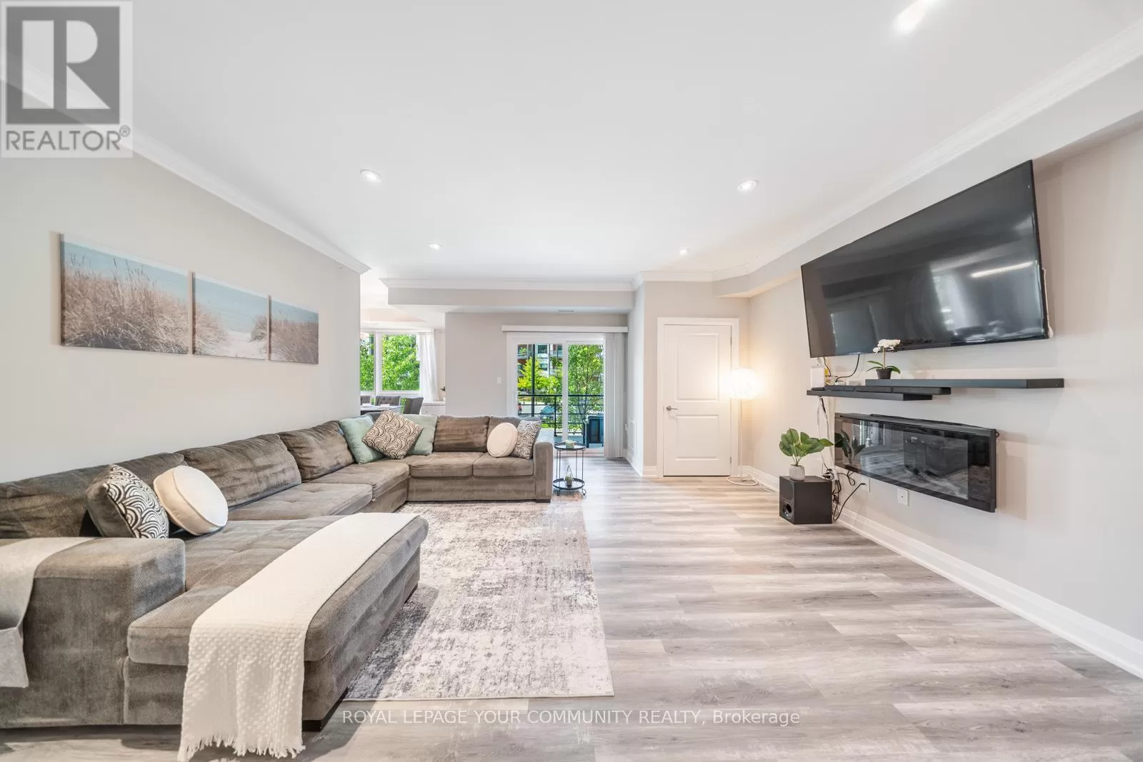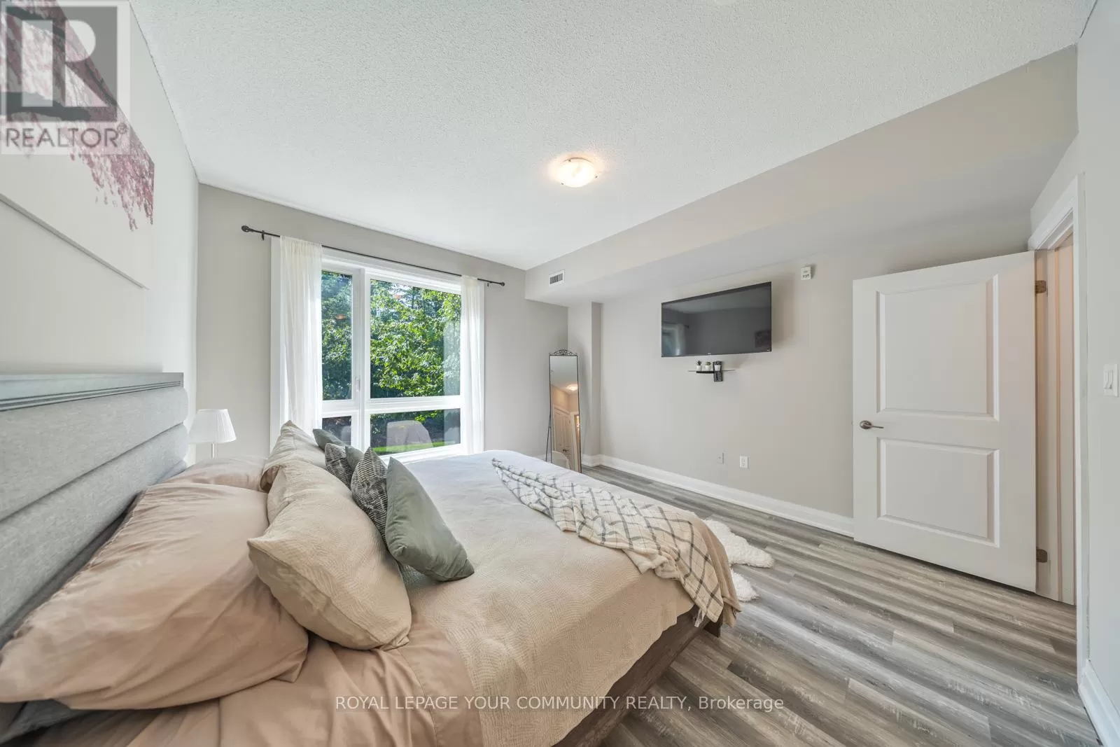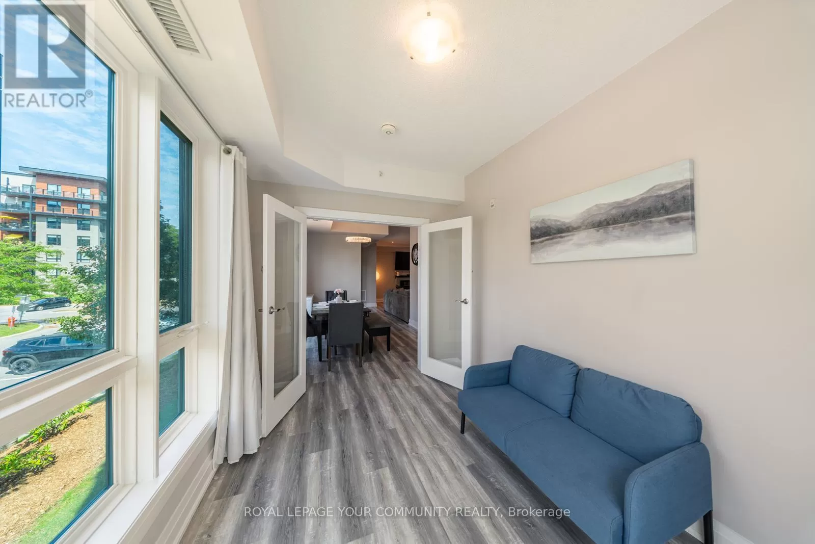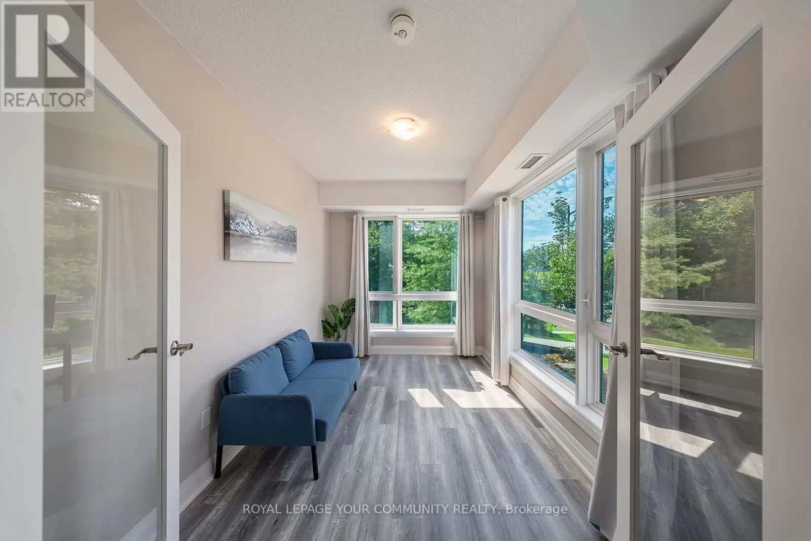 Essa Rd. and Bryne Dr. Spacious. Bright. Effortless Living. Perfect for the down sizers who want zero maintenance living. This oversized main floor unit is a rare gem offering the space of a home with the ease of condo living. Featuring 2 bedrooms plus a den, with the den easily convertible to a 3rd bedroom, this home offers exceptional flexibility for guests, hobbies, or extra living space. Ideal for down sizers, enjoy limited stairs, easy elevator access, and no more shovelling or yard work. Just lock up and go! Inside, you'll find a freshly painted, sun-filled layout with room to breathe. The modern glass shower doors (2025) add a stylish update. Your enclosed parking spot is on the main level, with a locker directly behind. No hauling groceries long distances! Step outside to a beautiful nature trail, and enjoy the convenience of shopping, dining, and Hwy 400 just minutes away. Whether you're ready to simplify or buying your first place, this bright, spacious, affordable home is the one you've been waiting for. (id:27476)