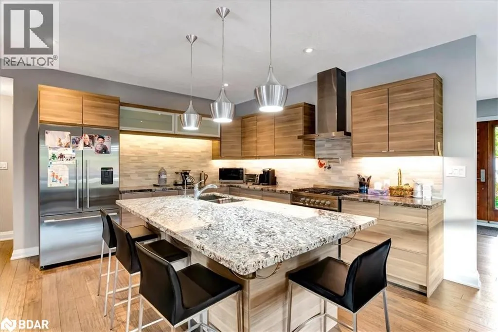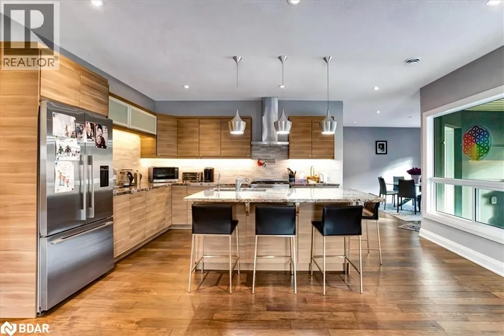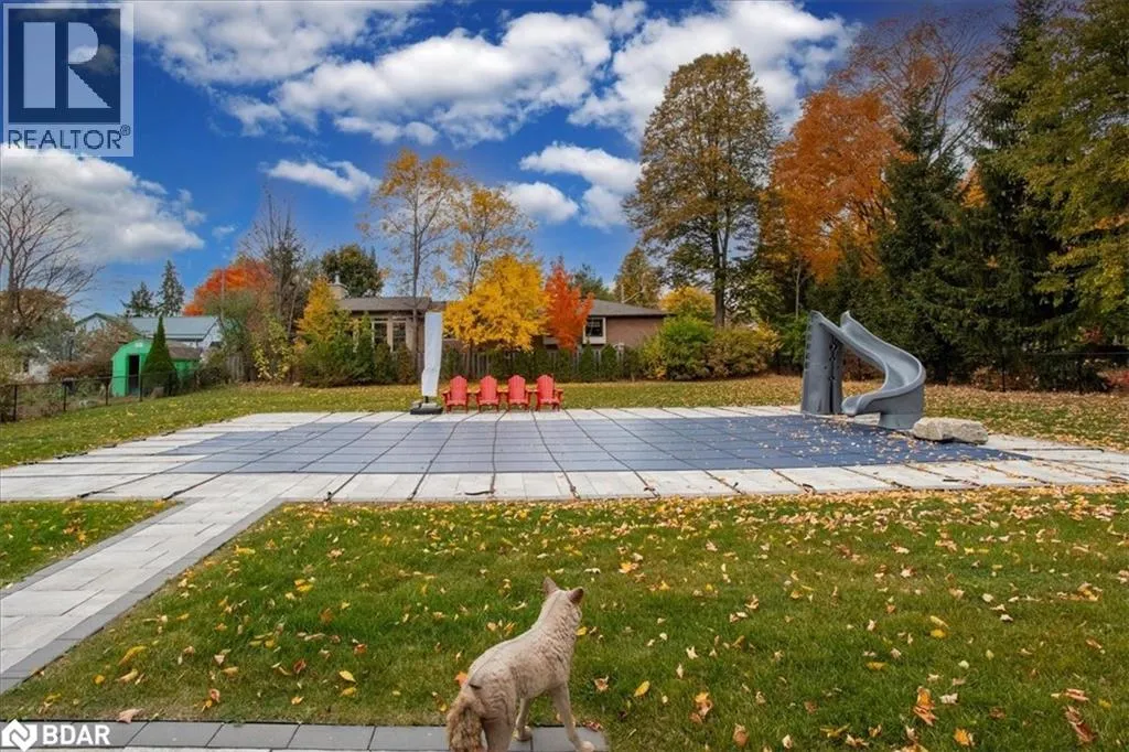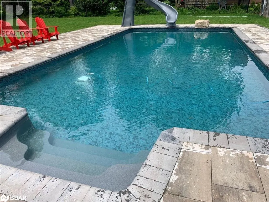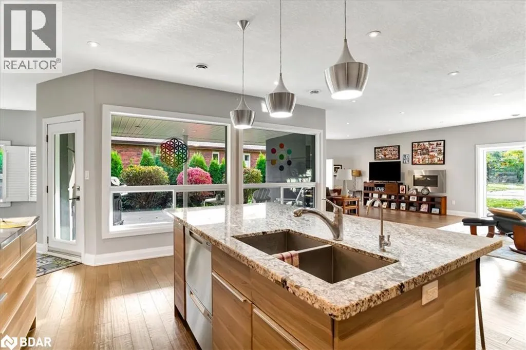 CODRINGTON ST TO COOK ST Unique Custom Sprawling Modern Bungalow with Inground Pool, and triple car garage - ideally located in Barrieâs East Endâs Exclusive Area of Fine Homes situated on a 110ft x 185ft lot. This home exudes curb appeal, and interior beams with sophisticated architectural beauty and designer custom finishes. Features 5 bedrooms, 3 bathrooms, and 10ft ceilings. The very bright open concept layout offers over 3000sqft of living space on one level â âno stairsâ and is wheelchair accessible. The kitchen is a chefâs dream, complete with a large island, quartz counters, pot filler tap, stainless steel appliances & gorgeous tile backsplash and large pantry. The formal oversize dining area looks amazing with a round table. The spacious primary bedroom has an ex-large walk-in closet & 5-piece ensuite with double sinks, glass shower & soaker tub. Enjoy outdoor activities on the canopied patio which allows for all year around barbecuing. The massive beautiful landscaped fenced yard has a (19' x 38â) gas heated inground pool- with a 5âdeepend and a slide, installed 2 years ago. The double garage has an additional side by side single garage with inside entry to the home. Walking distance to nature trails, downtown, shops and restaurants; close proximity to RVH, Kempenfelt Bay, makes this is a perfect family home. (id:27476)