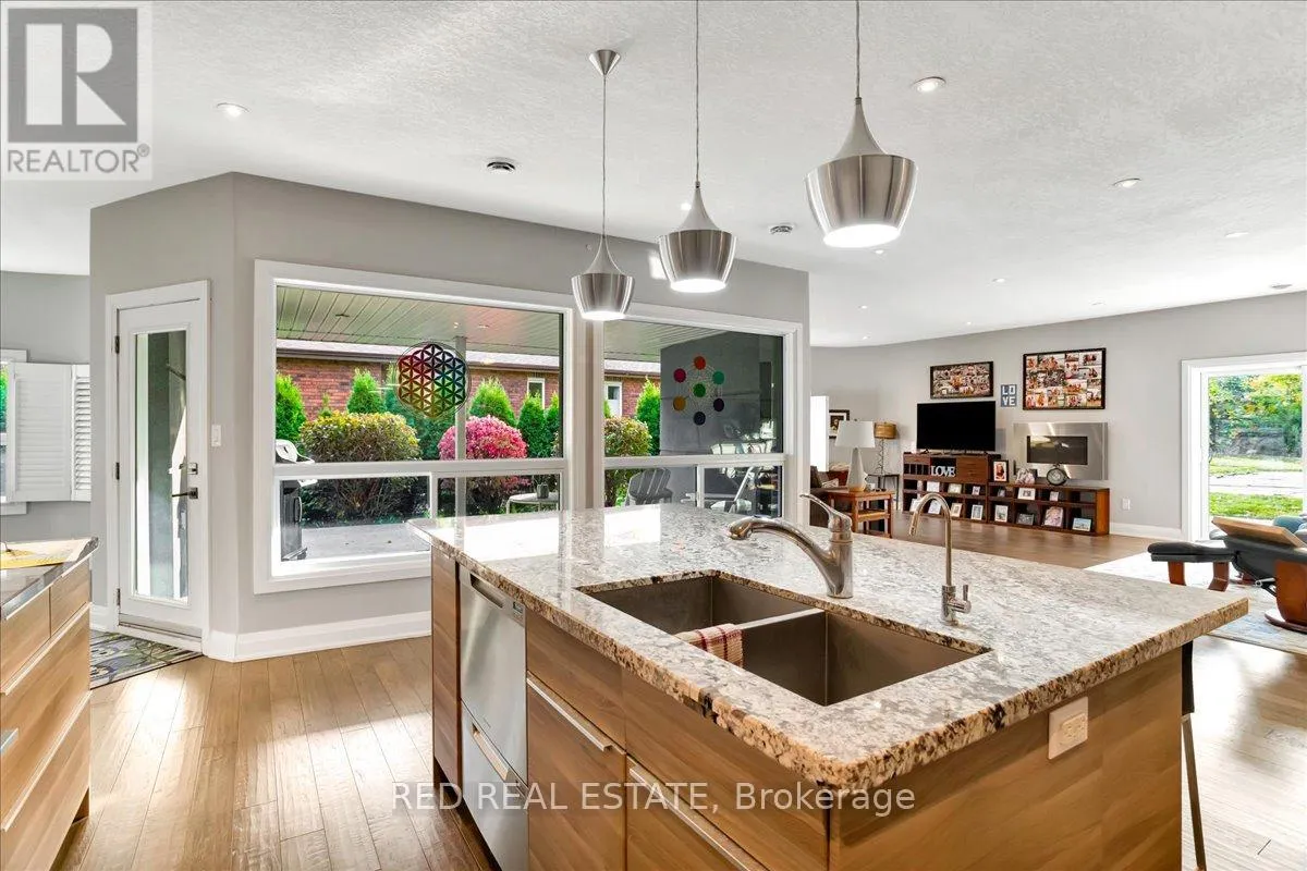 Cross Streets: Cook / Codrington. ** Directions: CODRINGTON ST TO COOK ST. Unique Custom Sprawling Modern Bungalow with "Inground Pool", and triple car garage - ideally located in Barrie's East Ends Exclusive Area of Fine Homes situated on a 110ft x 185ft lot. This home exudes curb appeal, and interior beams with sophisticated architectural beauty and designer custom finishes. Features5 bedrooms, 3 bathrooms, and 10ft ceilings. The very bright open concept layout offers over 3000sqft of living space on one level no stairs and is wheelchair accessible. The kitchen is a chefs dream, complete with a large island, quartz counters, pot filler tap, stainless steel appliances & gorgeous tile backsplash and large pantry. The formal oversize dining area looks amazing with a roundtable. The spacious primary bedroom has an ex-large walk-in closet & 5-piece ensuite with double sinks, glass shower & soaker tub. Enjoy outdoor activities on the canopied patio which allows for all year around barbecuing. The massive beautiful landscaped fenced yard has a (19' x38) gas heated inground pool- with a 5ft deep end and a slide, installed 2 years ago. The double garage has an additional side by side single garage with inside entry to the home. Walking distance to nature trails, downtown, shops and restaurants; close proximity to RVH, Kempenfelt Bay, makes this is a perfect family home. (id:27476)