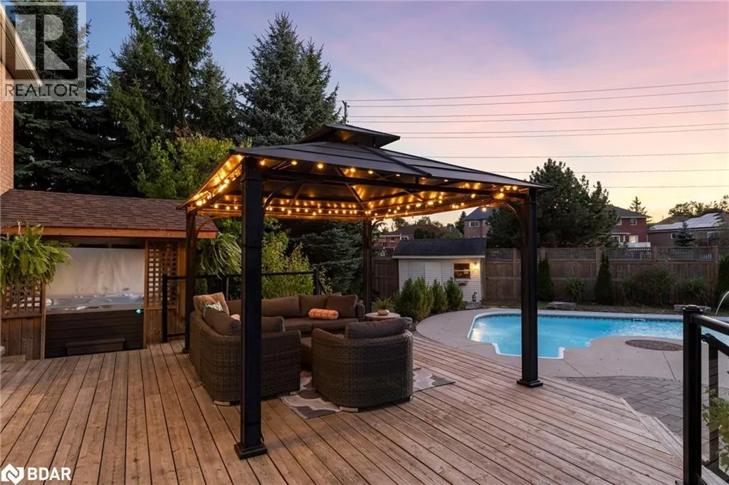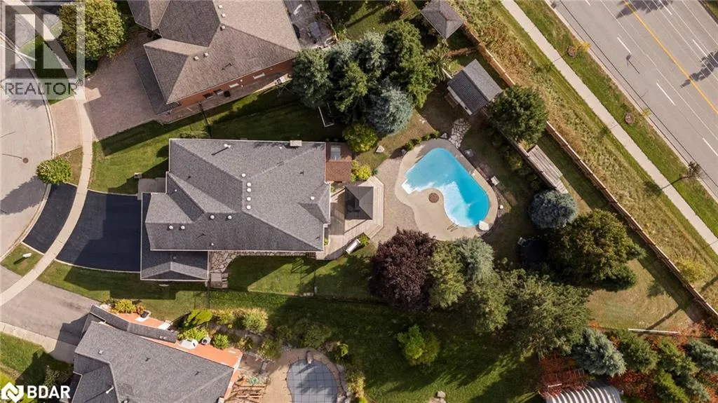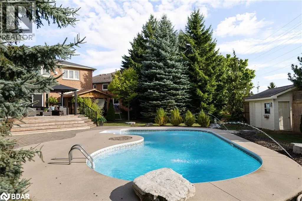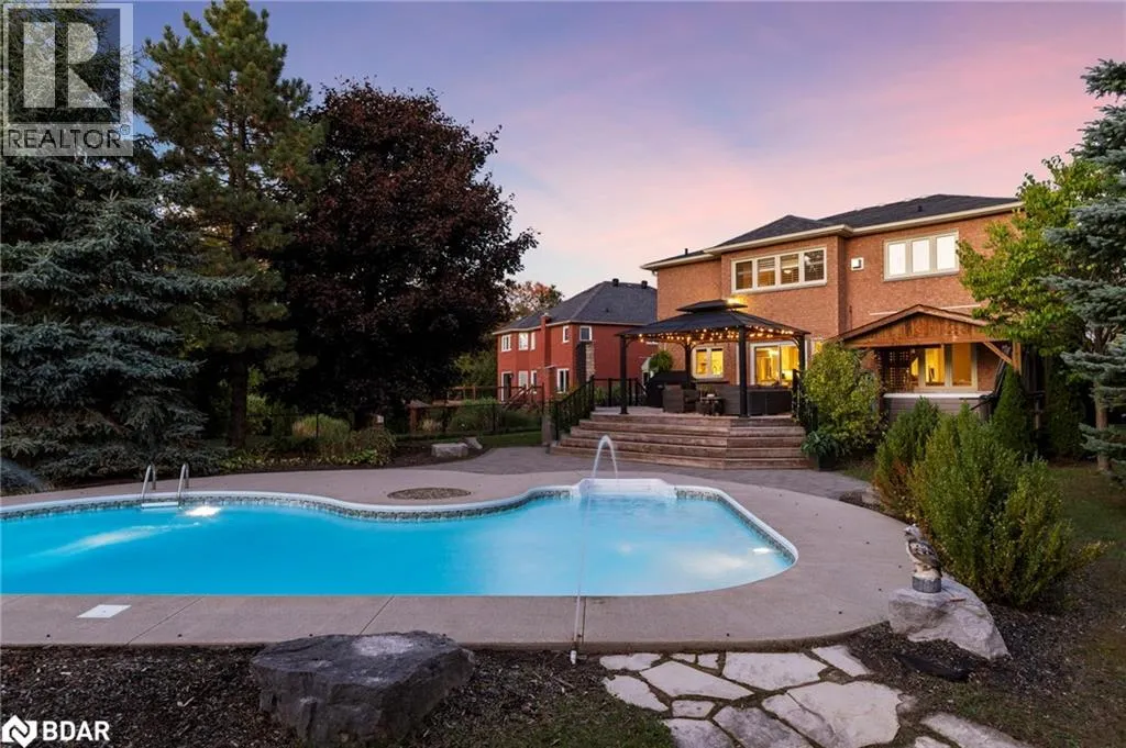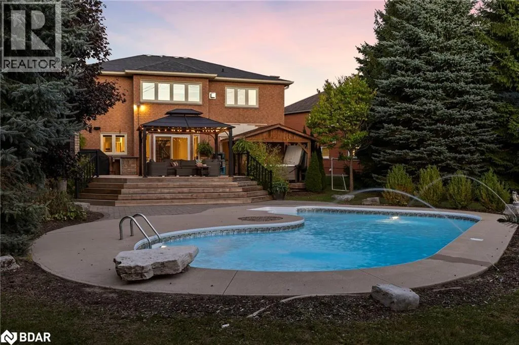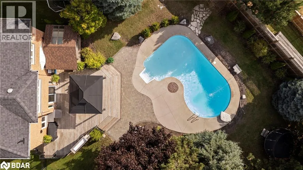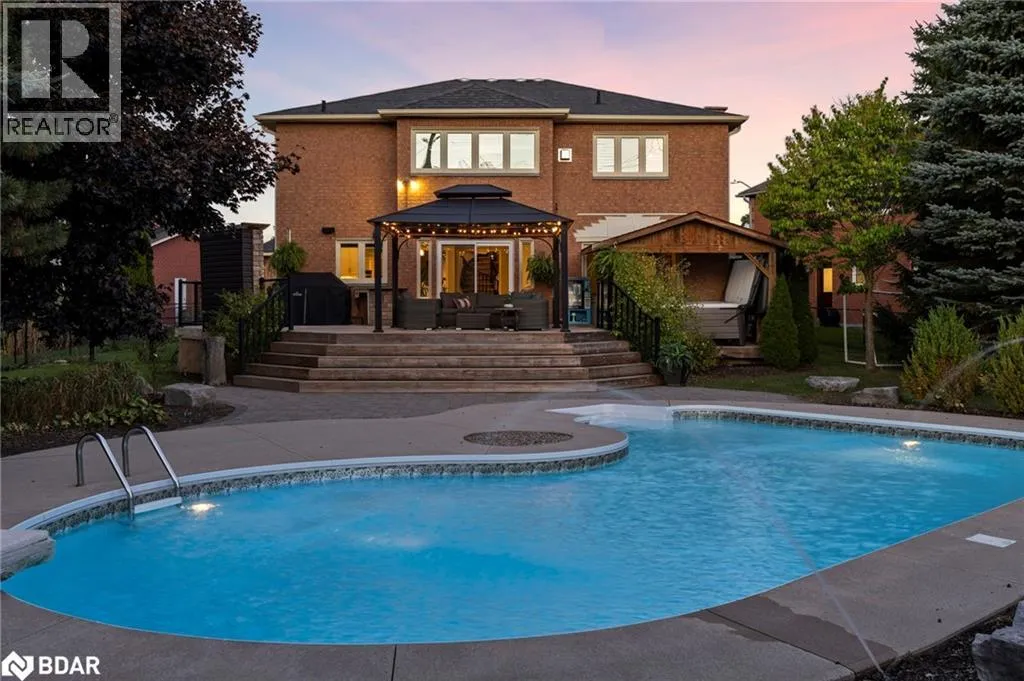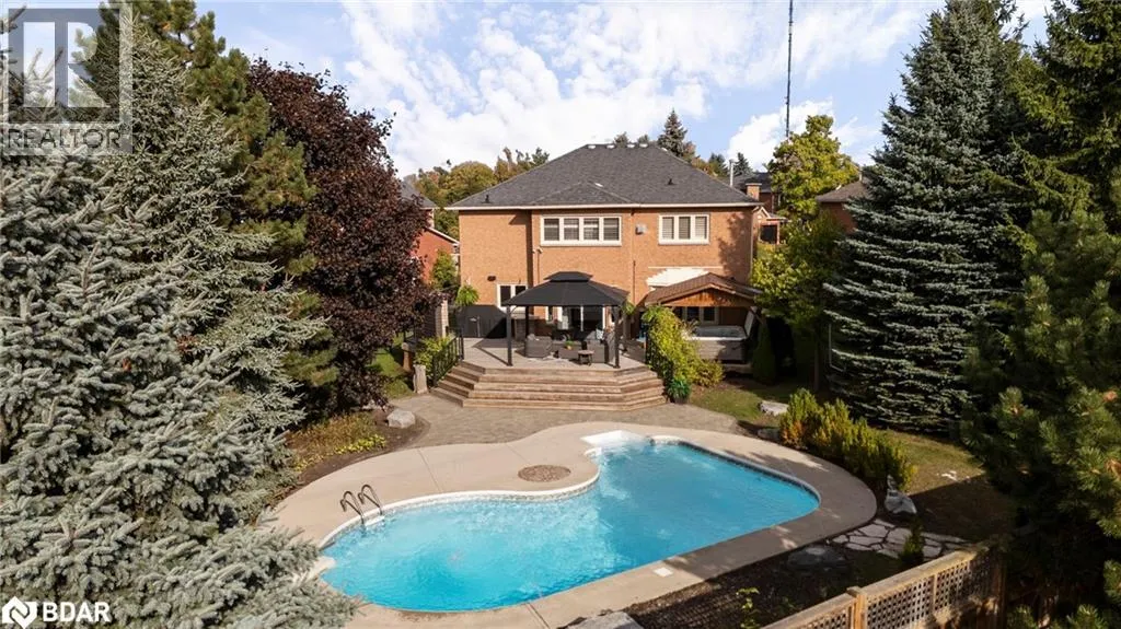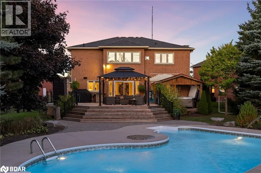 Ferndale Dr South/Stroud Pl/Cityview Circl This beautifully maintained home blends timeless design with modern updates inside and out. The stucco façade and mature landscaping create a classic curb appeal, complemented by a freshly paved driveway (2025). Inside, the main level features freshly painted walls, trim, and doors (2025), an updated kitchen with repainted cabinetry and lighting, and a breakfast area that walks out to the backyard. The layout includes a formal dining room with a bay-style window, a living room with a stone fireplace, a flexible family room at the front of the home, a main-floor office, a powder room, and a laundry room with inside entry from the garage, side-yard access, and included washer and dryer. Upstairs, the primary bedroom offers two walk-in closets, a ceiling fan, California shutters, and a double-sided fireplace that opens to a spacious ensuite with dual vanities, a walk-in glass shower, and a corner soaker tub surrounded by ceramic tile. Four additional bedrooms complete this level, three with walk-in closets and semi-ensuite access. The upper bathrooms include one with a dual-sink vanity and walk-in shower and another with a glass vessel sink and a combined shower and bathtub. The backyard is surrounded by mature trees and 6x6 wood fencing (2023), offering an in-ground pool, an expansive deck with a gazebo, and a covered hot tub within a custom wood structure. Additional updates include new fascia and eavestroughs (2019) and a new pool pump, chlorinator, filter, and heater (2023). Situated in Barries desirable Holly neighbourhood, this home is minutes from Peggy Hill Community Centre, Harvie Park, and Mapleview Drive amenities, with quick access to Highway 400 for commuters. (id:27476)
