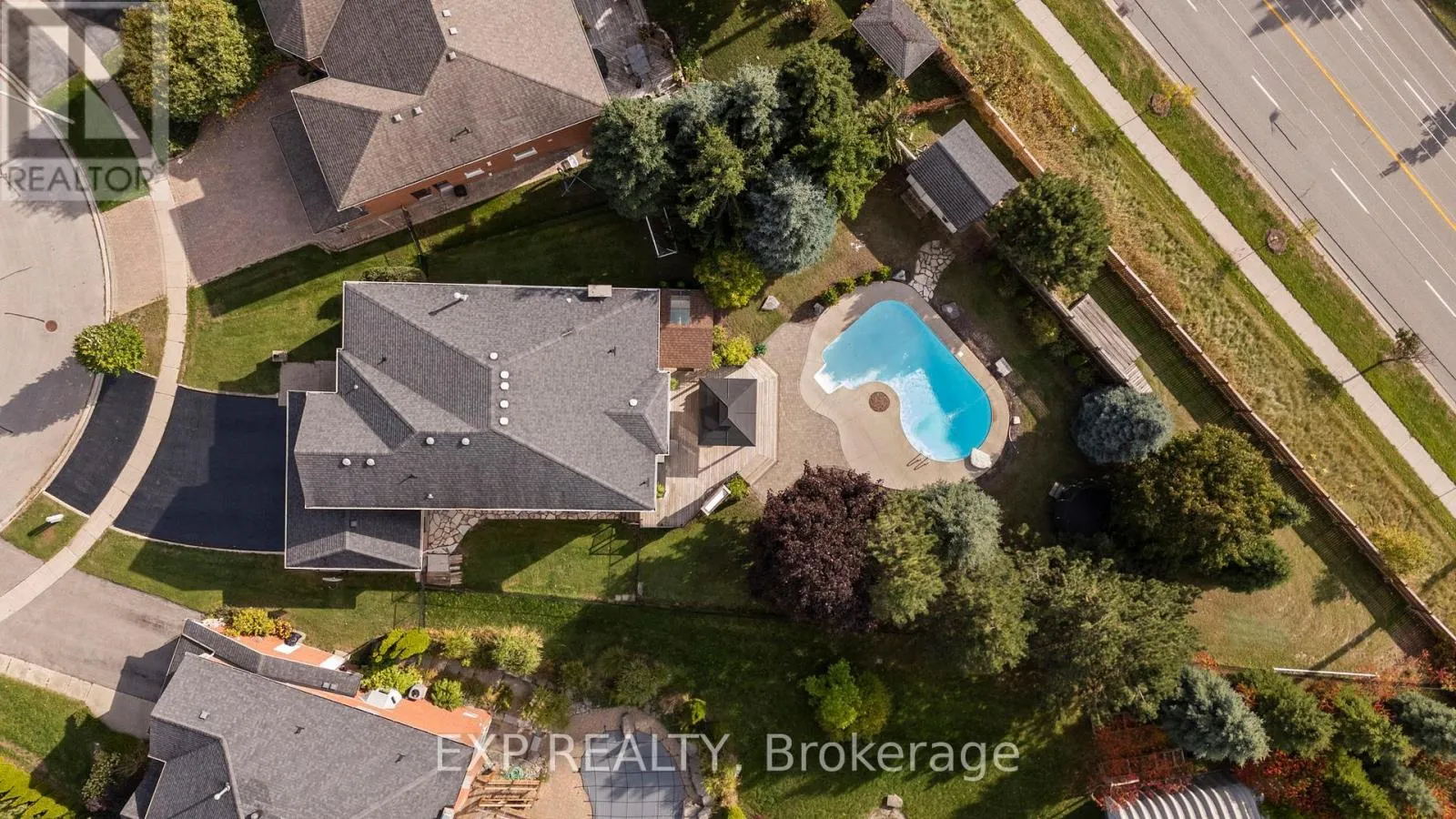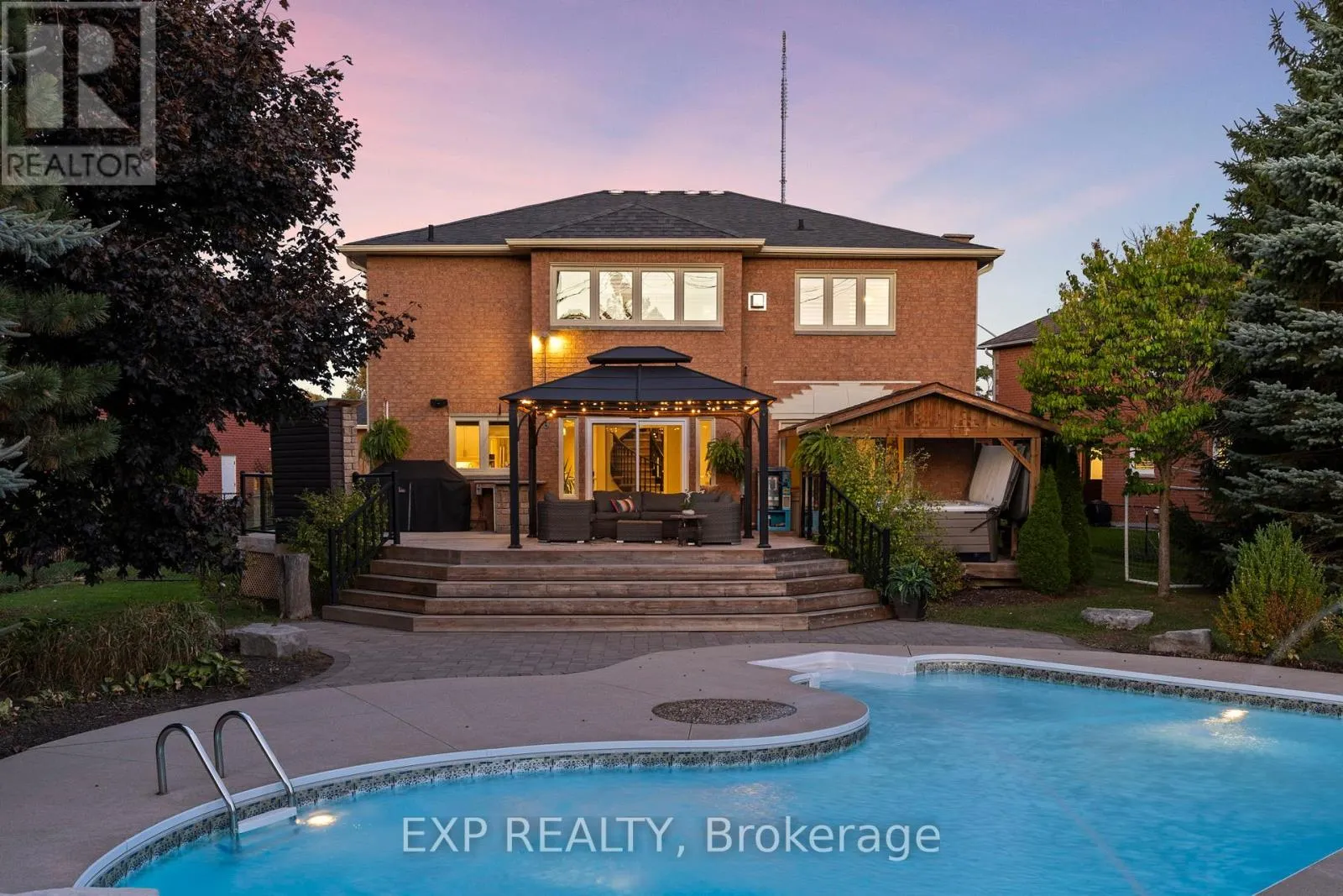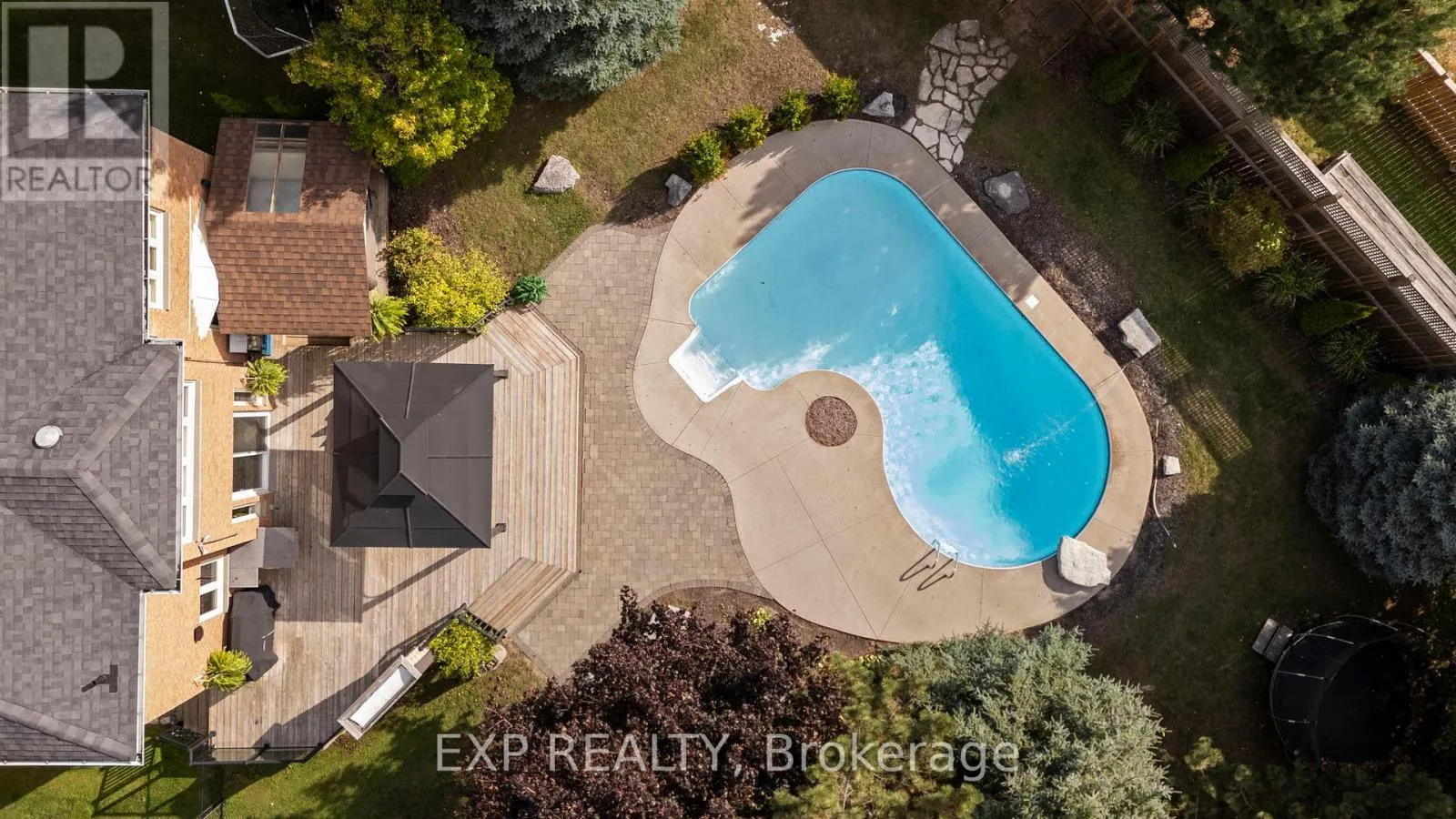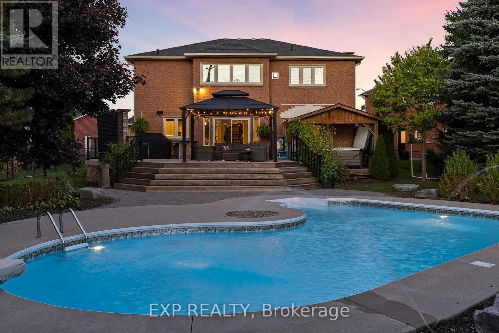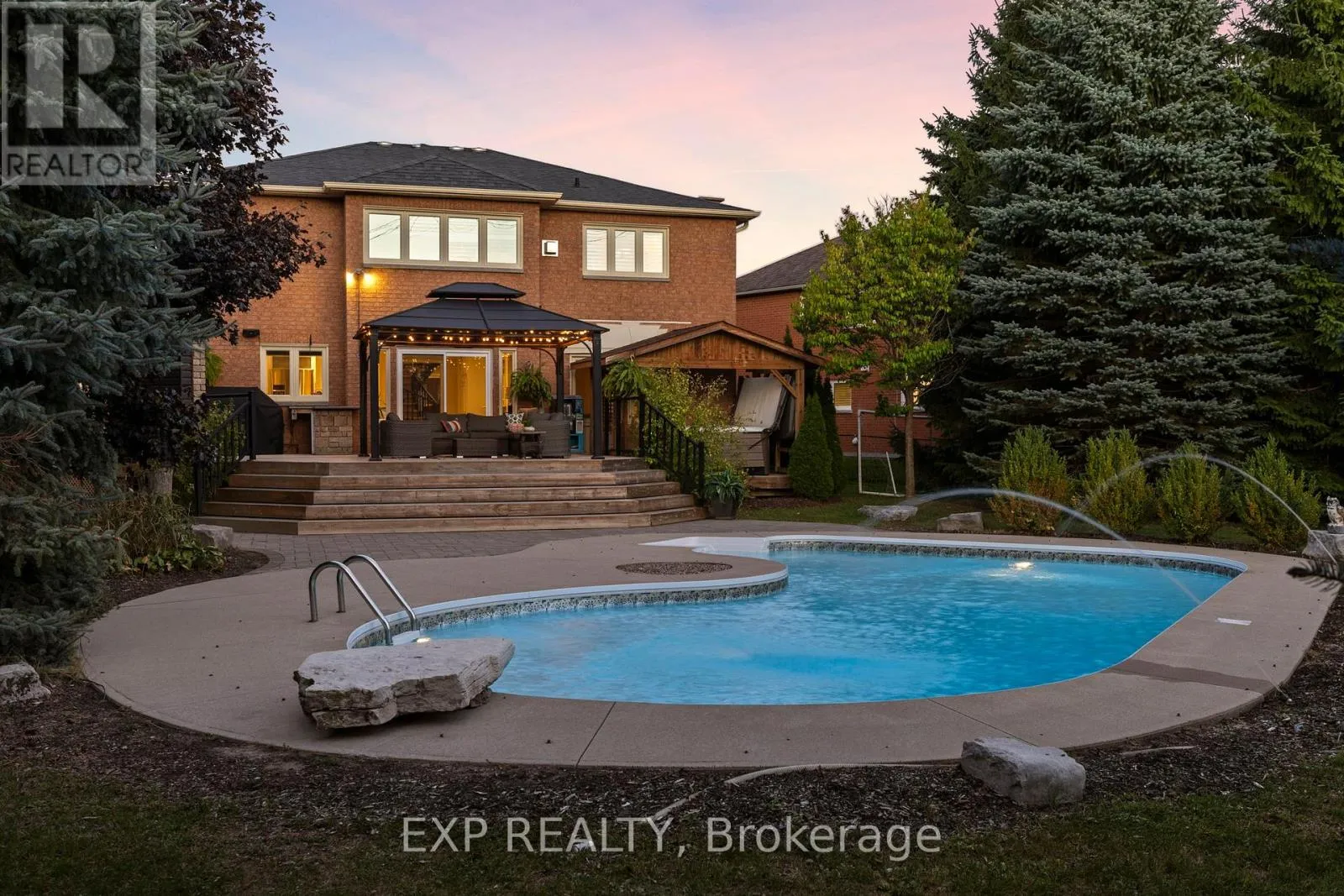 Ferndale Dr South/Stroud Pl/Cityview Circl This beautifully maintained home blends timeless design with modern updates inside and out. The stucco façade and mature landscaping create a classic curb appeal, complemented by a freshly paved driveway (2025). Inside, the main level features freshly painted walls, trim, and doors (2025), an updated kitchen with repainted cabinetry and lighting, and a breakfast area that walks out to the backyard. The layout includes a formal dining room with a bay-style window, a living room with a stone fireplace, a flexible family room at the front of the home, a main-floor office, a powder room, and a laundry room with inside entry from the garage, side-yard access, and included washer and dryer. Upstairs, the primary bedroom offers two walk-in closets, a ceiling fan, California shutters, and a double-sided fireplace that opens to a spacious ensuite with dual vanities, a walk-in glass shower, and a corner soaker tub surrounded by ceramic tile. Four additional bedrooms complete this level, three with walk-in closets and semi-ensuite access. The upper bathrooms include one with a dual-sink vanity and walk-in shower and another with a glass vessel sink and a combined shower and bathtub. The backyard is surrounded by mature trees and 6x6 wood fencing (2023), offering an in-ground pool, an expansive deck with a gazebo, and a covered hot tub within a custom wood structure. Additional updates include new fascia and eavestroughs (2019) and a new pool pump, chlorinator, filter, and heater (2023). Situated in Barries desirable Holly neighbourhood, this home is minutes from Peggy Hill Community Centre, Harvie Park, and Mapleview Drive amenities, with quick access to Highway 400 for commuters. (id:27476)