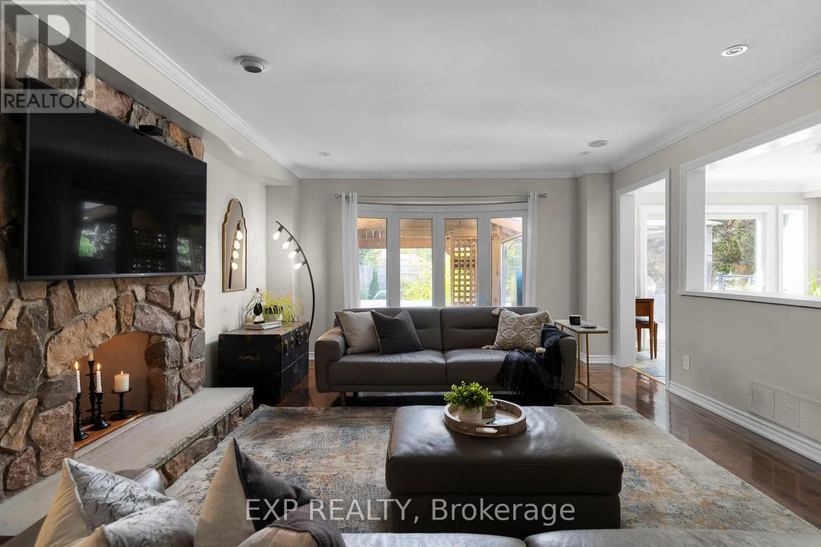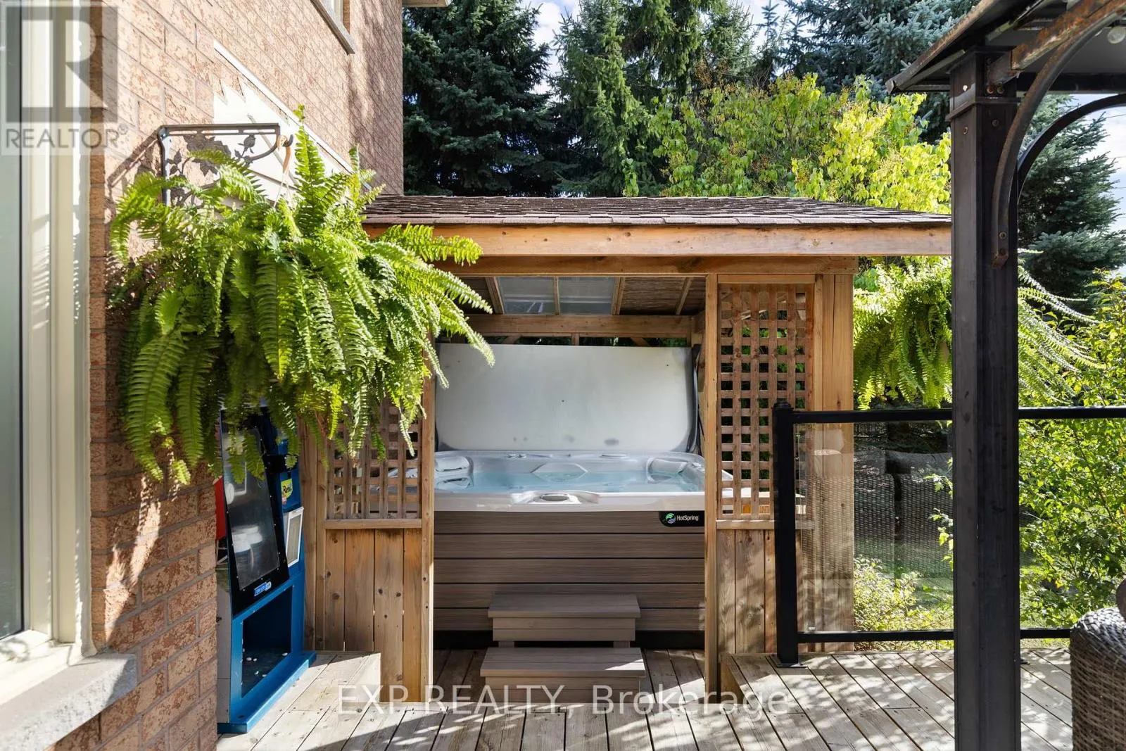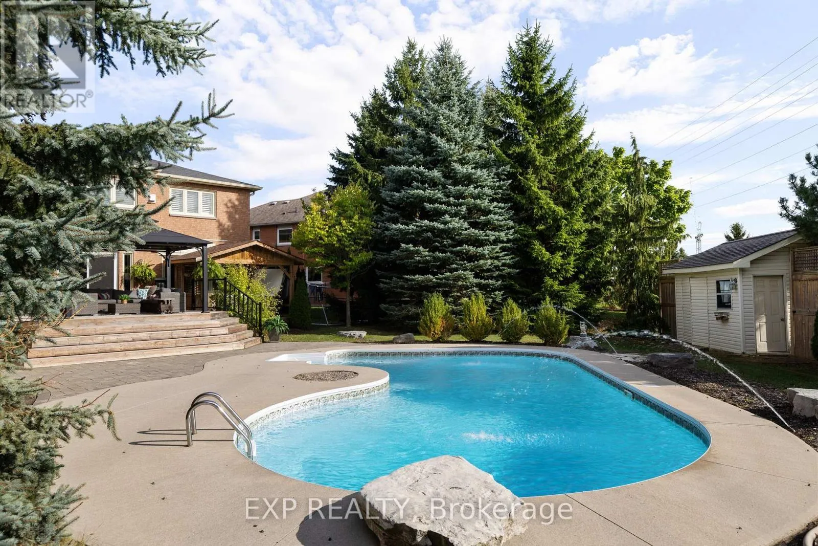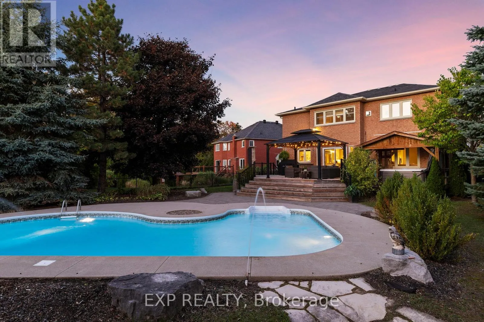 Ferndale Dr South/Stroud Pl/Cityview Circl This beautifully maintained home blends timeless design with modern updates inside and out. The stucco façade and mature landscaping create a classic curb appeal, complemented by a freshly paved driveway (2025). Inside, the main level features freshly painted walls, trim, and doors (2025), an updated kitchen with repainted cabinetry and lighting, and a breakfast area that walks out to the backyard. The layout includes a formal dining room with a bay-style window, a living room with a stone fireplace, a flexible family room at the front of the home, a main-floor office, a powder room, and a laundry room with inside entry from the garage, side-yard access, and included washer and dryer. Upstairs, the primary bedroom offers two walk-in closets, a ceiling fan, California shutters, and a double-sided fireplace that opens to a spacious ensuite with dual vanities, a walk-in glass shower, and a corner soaker tub surrounded by ceramic tile. Four additional bedrooms complete this level, three with walk-in closets and semi-ensuite access. The upper bathrooms include one with a dual-sink vanity and walk-in shower and another with a glass vessel sink and a combined shower and bathtub. The backyard is surrounded by mature trees and 6x6 wood fencing (2023), offering an in-ground pool, an expansive deck with a gazebo, and a covered hot tub within a custom wood structure. Additional updates include new fascia and eavestroughs (2019) and a new pool pump, chlorinator, filter, and heater (2023). Situated in Barries desirable Holly neighbourhood, this home is minutes from Peggy Hill Community Centre, Harvie Park, and Mapleview Drive amenities, with quick access to Highway 400 for commuters. (id:27476)