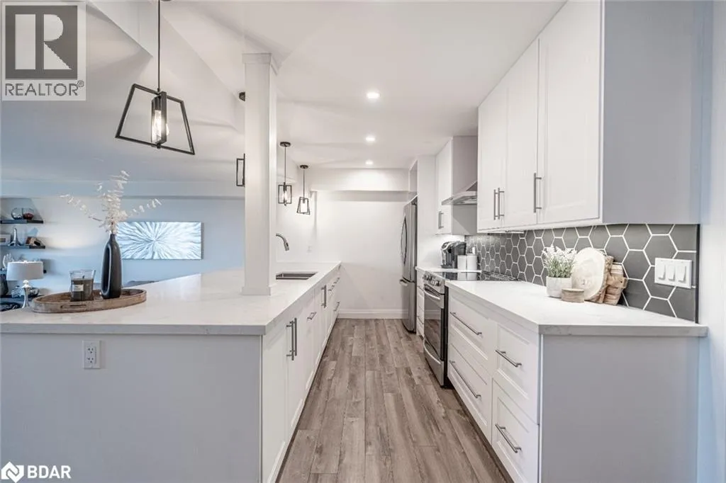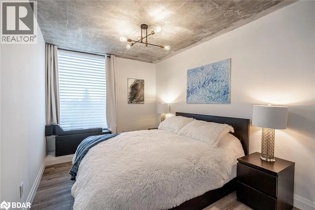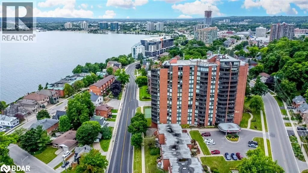 Hwy 400/Dunlop St E/Albert St/Collier St STUNNING, FULLY RENOVATED CONDO WITH OPEN-CONCEPT MODERN DESIGN, LAKE VIEWS, STEPS FROM THE WATERFRONT & THE BEST OF CITY LIVING! Live in the heart of it all with this upgraded Killdeer-style unit in Barrieâs vibrant City Centre, providing the ideal mix of comfort, convenience, and captivating views. Fully renovated with care and style, this unit stands out from the rest with fresh, modern finishes and a long list of thoughtful upgrades throughout. From the moment you step inside, you'll notice the attention to detail, starting with the stunning chef-inspired kitchen featuring an oversized island with bonus storage, quartz countertops, stainless steel appliances, and ample prep space. The airy living and dining area opens to a private enclosed balcony that showcases stunning views of Kempenfelt Bay. The thoughtfully designed floor plan separates the bedrooms for added privacy, with a spacious primary suite complete with a walk-in closet and 3-piece ensuite. Concrete ceilings add a touch of modern style to the bedrooms, complemented by updated pot lights, and durable laminate flooring throughout. Additional highlights include a dedicated laundry room and generous in-unit storage. Residents enjoy top-tier amenities including an indoor pool, sauna, fitness centre, tennis court, games room, meeting space, and visitor parking, while an exclusive parking space and a dedicated locker storage unit complete the package. Just steps from shops, restaurants, entertainment, and year-round community events, this location puts everything within reach - including Kempenfelt Park, the scenic North Shore Trail, and Johnsonâs Beach. Enjoy a highly walkable lifestyle with the added ease of being less than 10 minutes from Highway 400, perfect for stress-free commuting. This exceptional #HomeToStay provides stylish, low-maintenance living with spectacular views, unbeatable walkability, and resort-style amenities - all in one of Barrieâs most dynamic and connected locations. (id:27476)