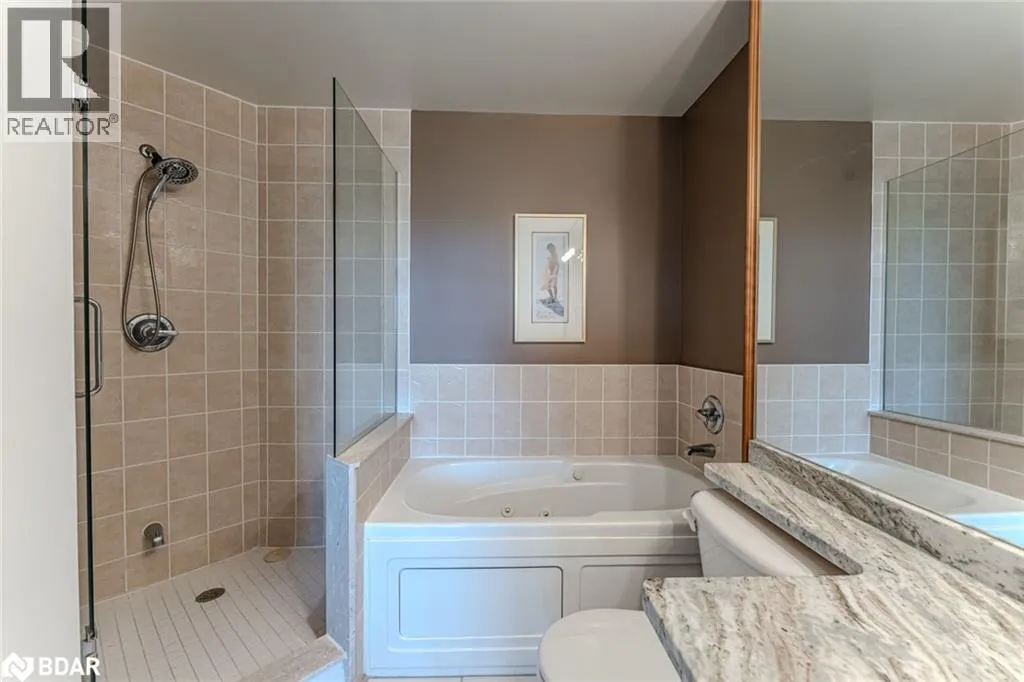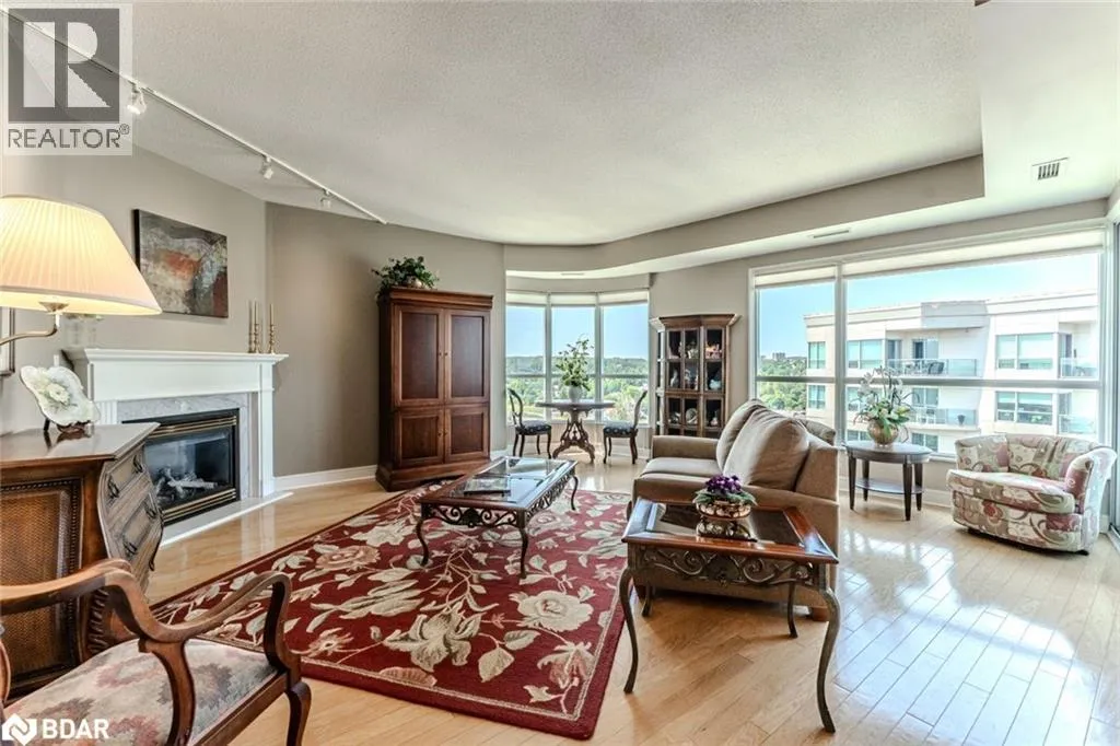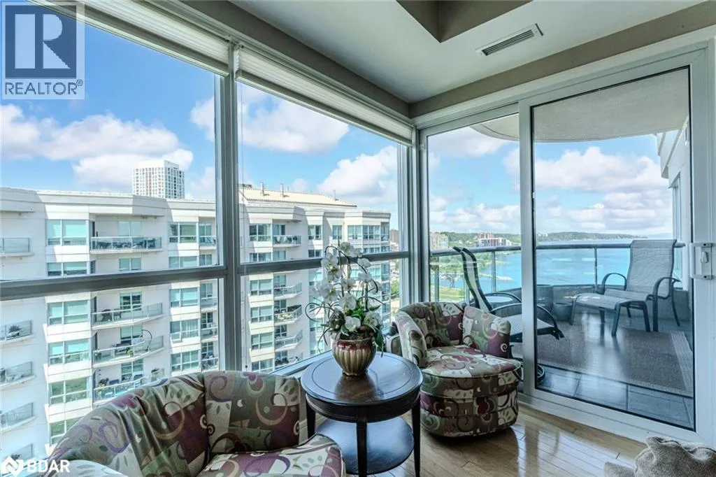 Hwy 400/Dunlop St W/Toronto St SUNLIT CORNER UNIT PENTHOUSE WITH PANORAMIC KEMPENFELT BAY VIEWS & ACCESS TO IT ALL! Welcome to elevated waterfront living in the heart of Barrieâs vibrant Lakeshore neighbourhood. This spacious top-floor corner unit in the sought-after Grand Harbour building boasts breathtaking panoramic views of Kempenfelt Bay, the city skyline, and the Barrie Marina just across the street. Step outside and enjoy being just moments from Centennial Beach, scenic boardwalks, parks, and the bustling downtown core filled with restaurants, patios, shops, and entertainment. Inside, the bright open-concept kitchen, dining, and living area impresses with soaring 9-foot ceilings, hardwood floors, and a cozy natural gas fireplace, with a sliding glass walkout to a private balcony perfect for morning coffee or evening sunsets overlooking the water. The layout features two generously sized bedrooms, including a serene primary suite with a walk-in closet and a spa-like 4-piece ensuite complete with a soaker tub and glass-enclosed shower. A second full bathroom, in-suite laundry, and included parking and storage offer everyday ease, while premium building amenities - an indoor pool, fitness facilities, a games room, and guest suites - elevate the lifestyle and complete this exceptional offering. Commuters will love the quick access to Highway 400, the Allandale GO Station, and public transit. Donât miss this rare opportunity to live just steps from the shoreline in one of Barrieâs most sought-after waterfront destinations - where every day feels like a getaway! (id:27476)
