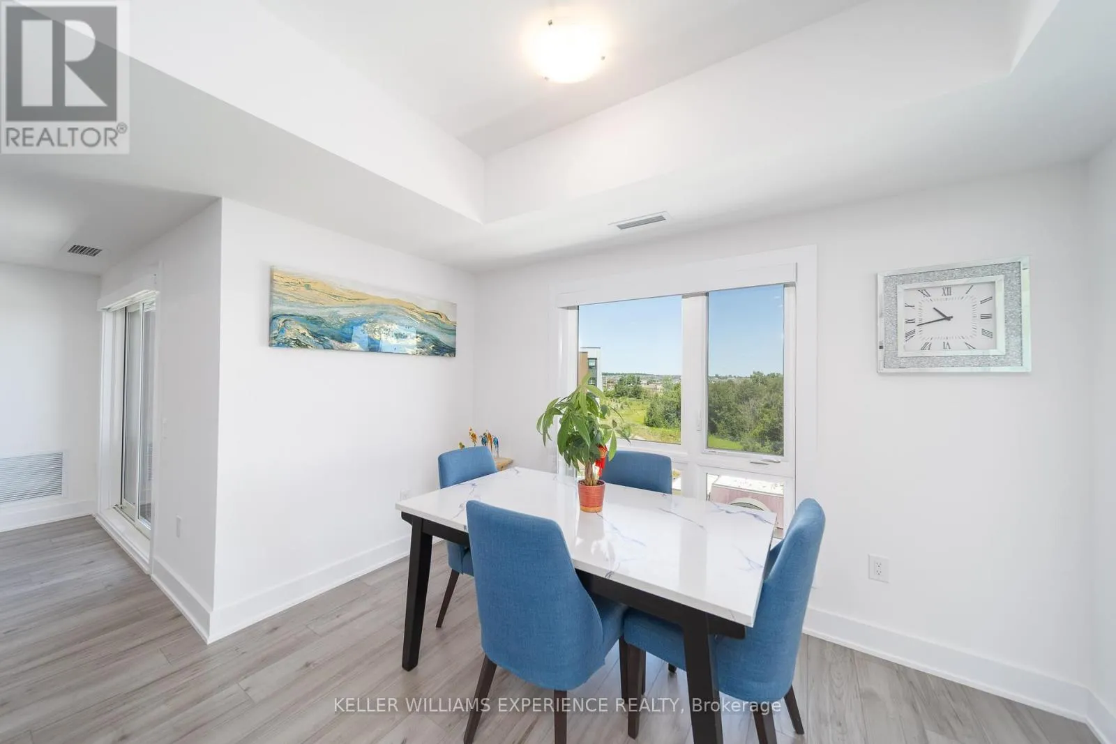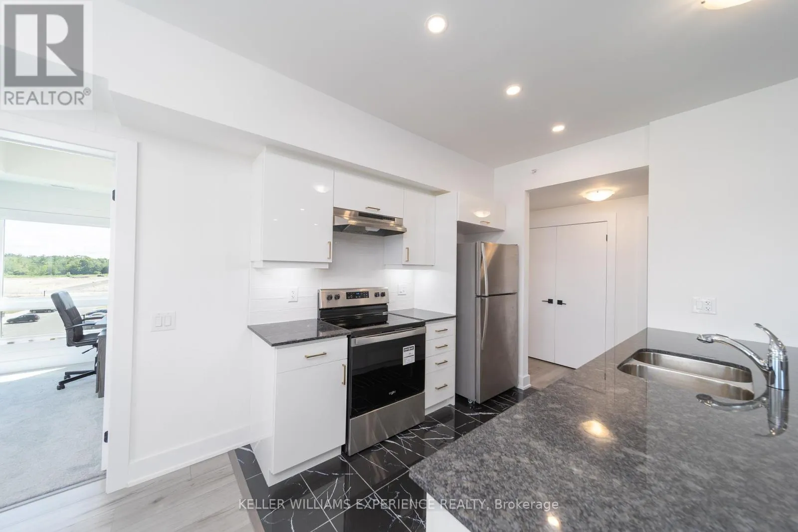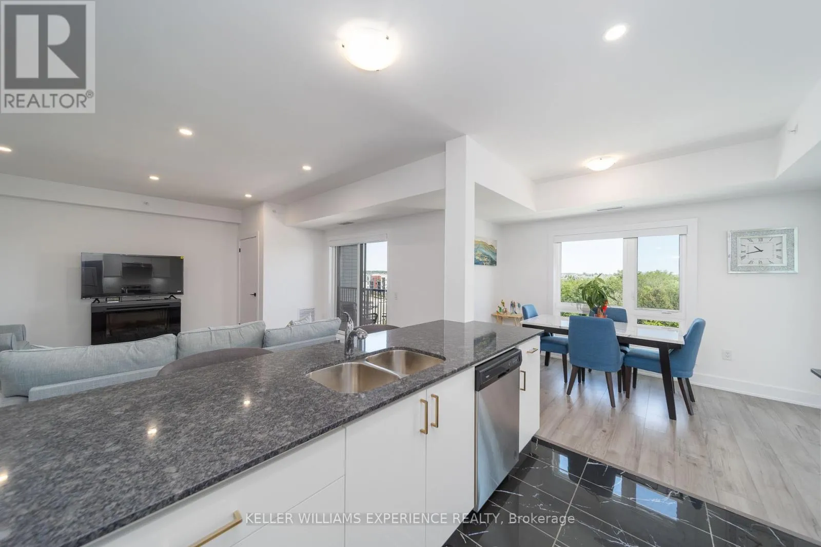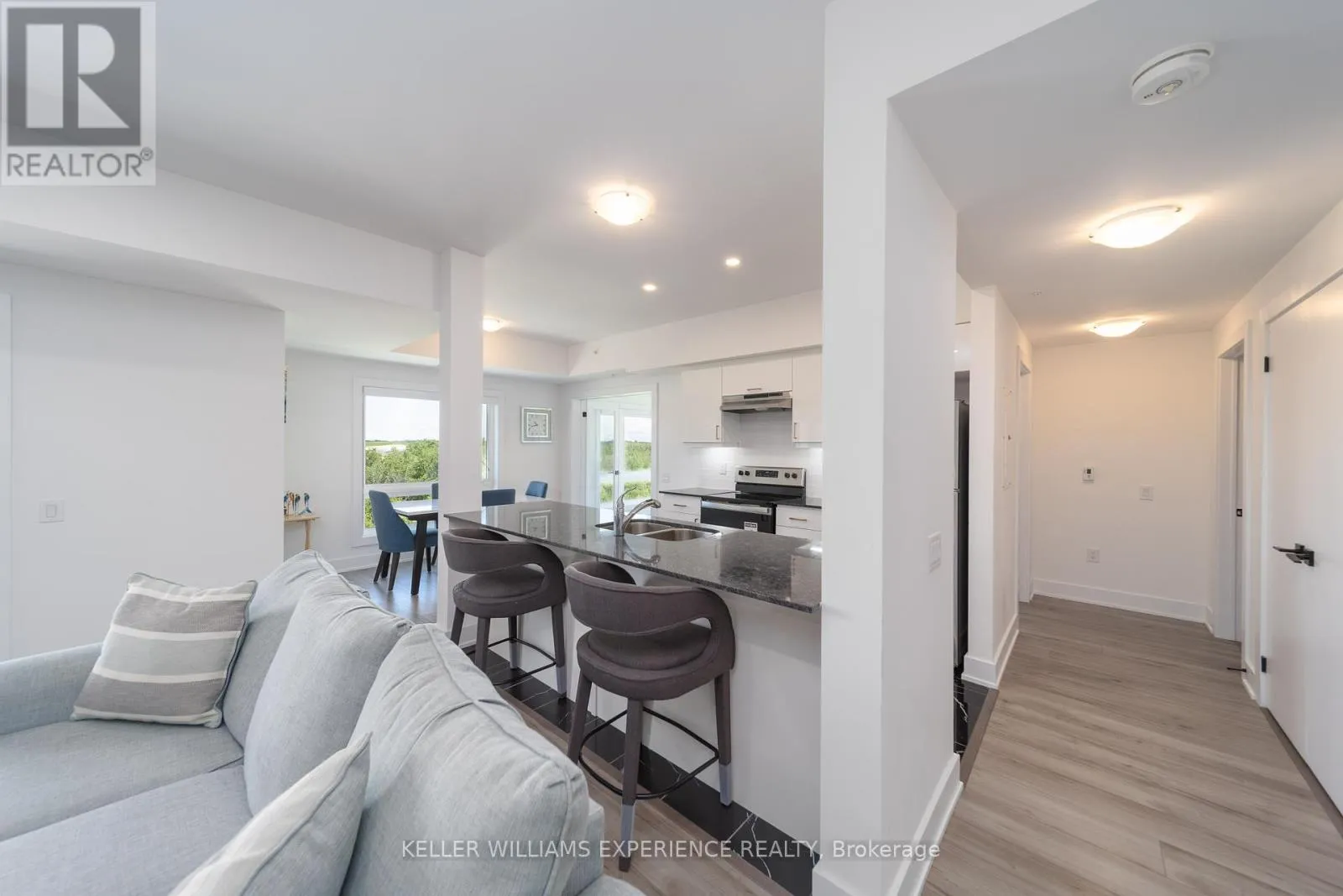 Kneeshaw Dr/Culinary Ln This stunning 3-bedroom, 2-bathroom corner unit offers 1,265 sq. ft. of modern living, with wraparound corner windows and a balcony facing southeast perfect for enjoying breathtaking sunrises every morning. Featuring $33,000 in upgrades, the home showcases an upgraded kitchen with stainless-steel appliances, under-cabinet lighting, pot lights, granite countertops, and a stylish tile backsplash. Porcelain tile flooring flows through the foyer, kitchen, and bathrooms, while the spacious living room opens to a balcony equipped with a gas barbeque hookup and overlooks lush green space. The primary suite boasts a walk-in closet and a private ensuite, complemented by custom blinds throughout. Accessible features, including wider door frames and hallways as well as accessible light switches, add both comfort and convenience. Ideally located just minutes from the South Barrie GO Station, restaurants, shopping, and more, this nearly new condo is still covered under Tarion Warranty (id:27476)