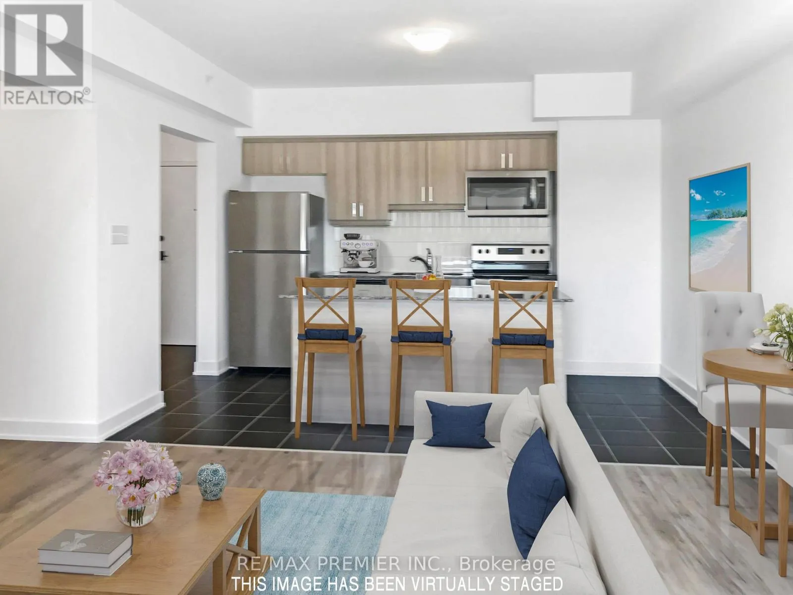 Yonge St and Mapleview Dr Bistro Culinary-Inspired Condo Living in a Desirable Location! Experience stylish urban living in this 742 sq ft penthouse situated within walking distance to the GO Station, transit, and grocery shopping. Just minutes from the waterfront, Hwy 400, Restaurants, and more. This bright and open-concept layout features 9'ceilings, a modern chef-style kitchen with granite countertops, backsplash, and breakfast bar, plus laminate flooring throughout for a seamless flow. Relax in the spacious living area that opens to a private balcony with a gas BBQ hookup and beautiful, unobstructed views of trees and ravine. The sleek bathroom includes a walk-in glass shower, and you'll enjoy the convenience of in-suite laundry. Whether you're a first-time buyer, downsizer, or investor, this unit offers comfort, style, and unbeatable convenience - all in one exceptional location. (id:27476)