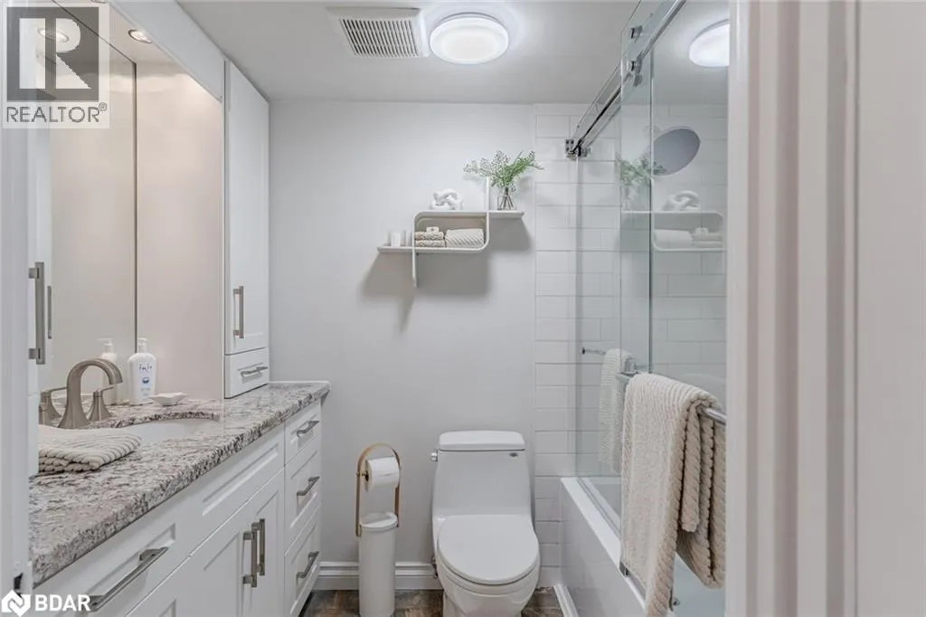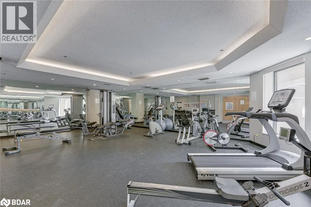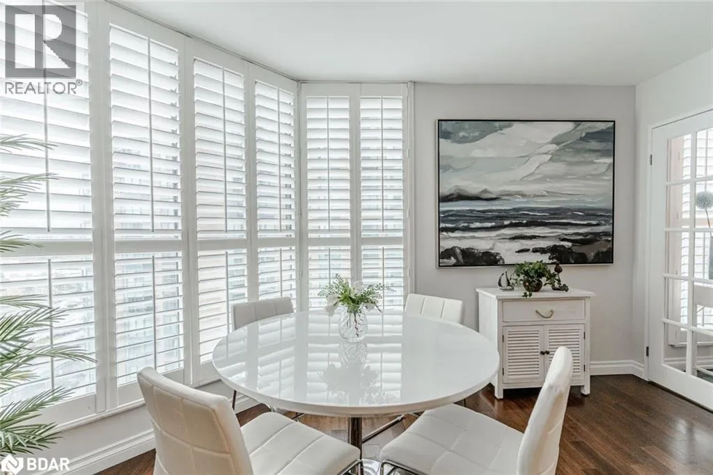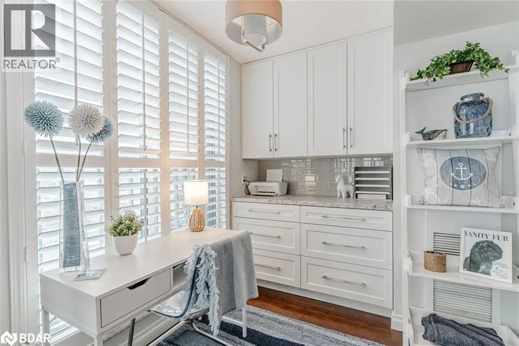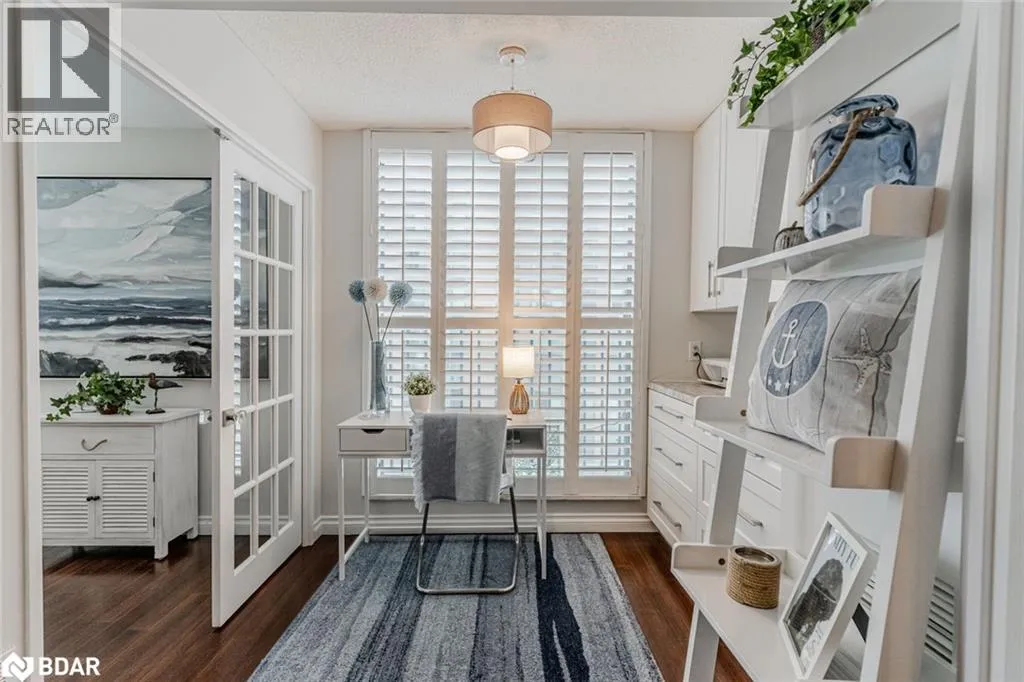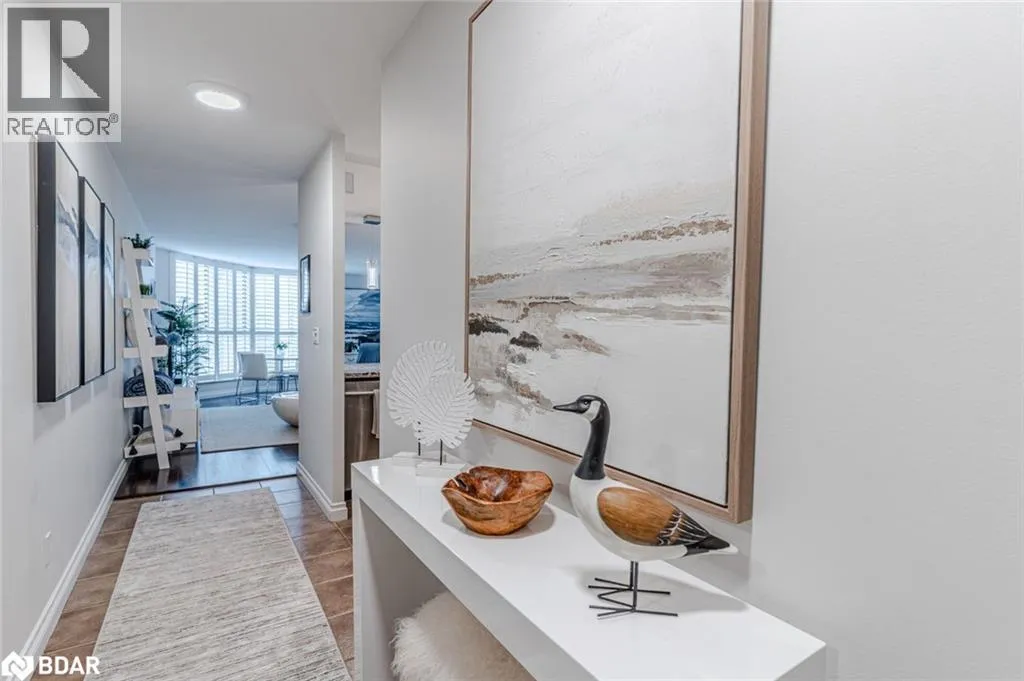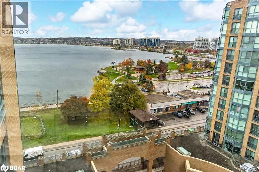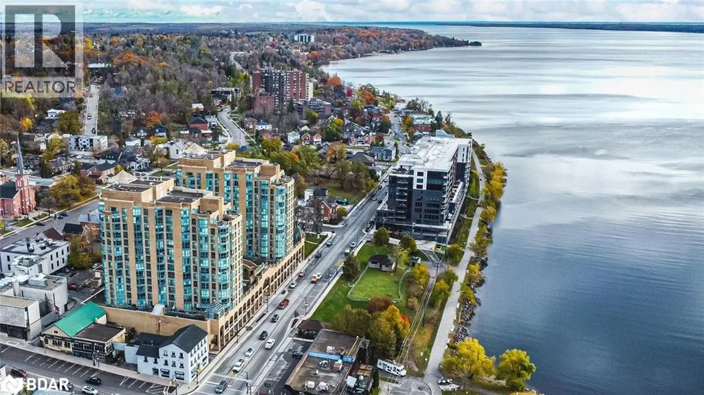 Hwy 400/Dunlop St W/Dunlop St E STYLISHLY RENOVATED 1 BED + DEN CONDO WITH STUNNING VIEWS OF KEMPENFELT BAY, MODERN UPGRADES & PREMIUM AMENITIES! Enjoy breathtaking water views the moment you walk in at this beautifully renovated condo in the renowned Bayshore Landing, where modern comfort meets the serenity of Kempenfelt Bay and the vibrance of downtown Barrie. Natural light pours through oversized corner windows, illuminating a bright open-concept layout designed for both relaxation and entertaining. The contemporary kitchen showcases sleek cabinetry, built-in appliances, and custom pull-outs, opening effortlessly into the spacious living and dining areas where expansive water views set a stunning backdrop. The inviting bedroom features a custom closet by Closets by Design, while the versatile den provides an ideal spot for a home office or reading nook. A stylishly updated 4-piece bathroom boasts refined finishes, premium fixtures, and a Toto toilet, with a convenient laundry room featuring a full-size washer and dryer. Every corner exudes thoughtful design with smooth ceilings, freshly painted walls, upgraded lighting with dimmers, modern doors and hardware, California shutters, and custom built-ins that add function and flair. Step beyond your suite to enjoy resort-style amenities, including concierge and security, an indoor pool, sauna, fitness and games rooms, party and recreation spaces, guest suites, and an on-site car wash. Perfectly positioned in the heart of the City Centre, this residence places you just steps from vibrant restaurants, cafes, boutiques, event spaces, beaches, and lakeside trails - offering the best of city living with the serenity of Kempenfelt Bay right outside your window. With a desirable first-level parking space and a spacious private storage locker, this exceptional #HomeToStay combines everyday luxury with the ease of low-maintenance living near Barrieâs sparkling waterfront. (id:27476)