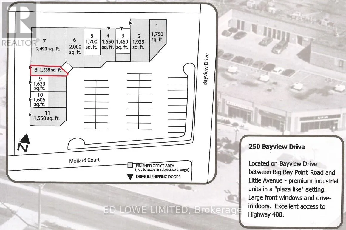 Cross Streets: Big Bay Point To North On Bayv. ** Directions: Big Bay Point To North On Bayview Ave. Well-located 1,538 sq. ft. industrial space with excellent exposure on high-traffic Bayview Drive in Barrie's south end. This unit offers convenient access to Highway 400 and is surrounded by restaurants, shopping, and a nearby recreational centre. Features include one drive-in door, ample on-site parking, and strong street visibility ideal for a variety of industrial or service-oriented uses. Annual rent escalations apply, with tenant responsible for utilities. LA related to LL (id:27476)