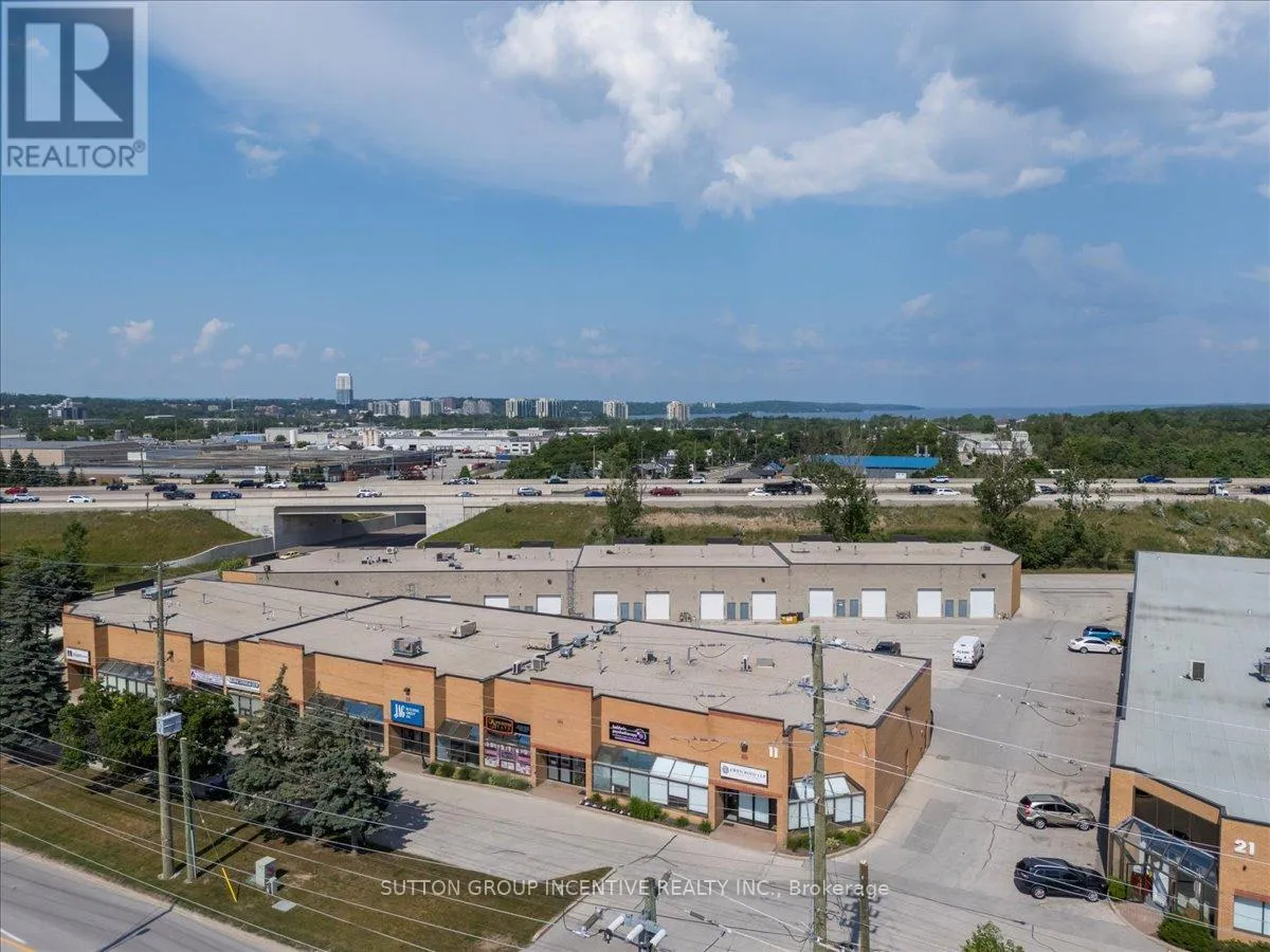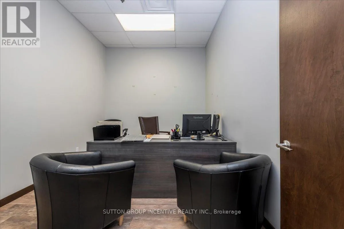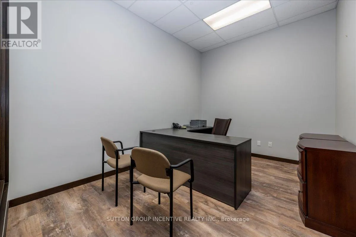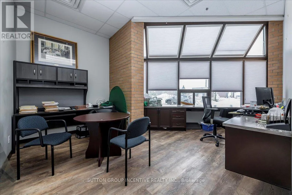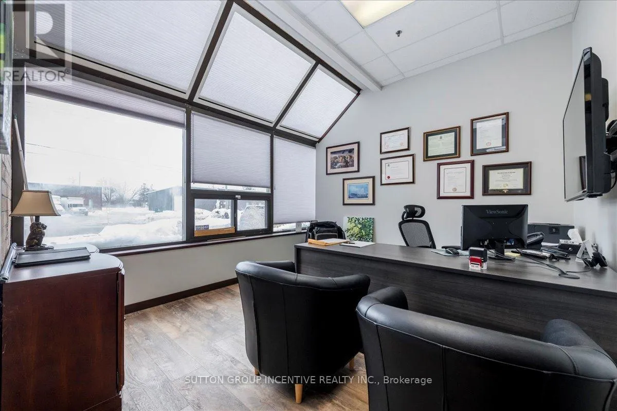 Cross Streets: Tiffin Street & Patterson Road. ** Directions: Located at Corner of Tiffin & Patterson, facing Patterson. Stop paying someone else's mortgage -- own your workspace in the heart of Barrie, just minutes from downtown and Hwy 400. This professionally finished office spans two commercial condo units and was fully renovated in 2019. The front office area features a welcoming reception, waiting area, bright boardroom with custom glass doors, staff/lunch room, four private offices, open work area, and two washrooms -- ideal for a wide range of professional users. At the rear, utilize an approximate 740 SF of warehouse space with a 19' clear height and a 10' x 12' roll-up door, plus an additional 182 SF mezzanine for extra storage. Comfort and efficiency are covered with ductless heat pumps in the front offices for added cooling (2020), updated central air (2020), and a new forced-air natural gas furnace (2023).Included are a built-in custom desk and hutch in the angled office, custom blinds throughout, fridge, dishwasher, microwave, HWT (owned) and boardroom table. Additional furnishings (including copier) may be available, subject to negotiation. Flexible possession. Monthly condo fees of $775.93 include water/sewer, snow removal, landscaping, insurance, management, non-exclusive parking, and building envelope maintenance. (id:27476)