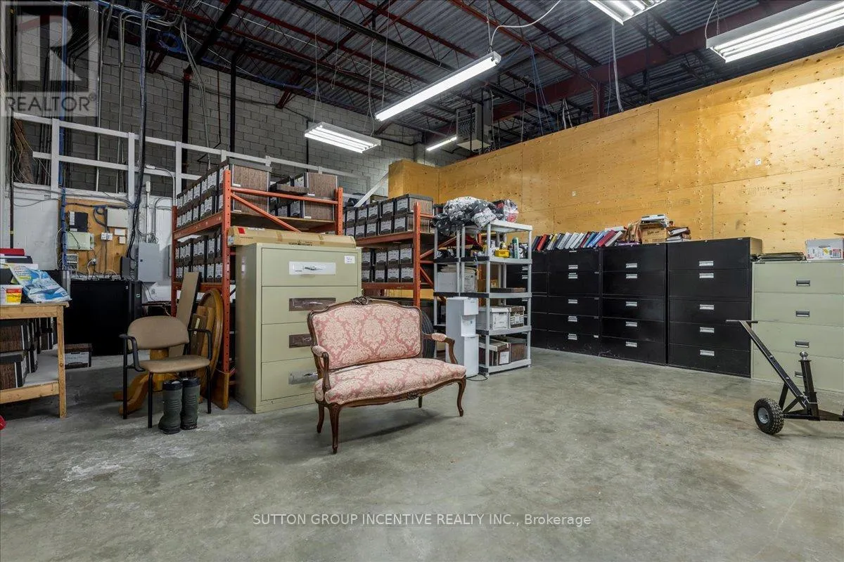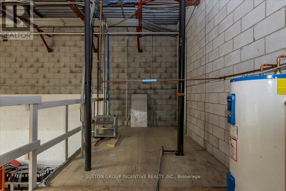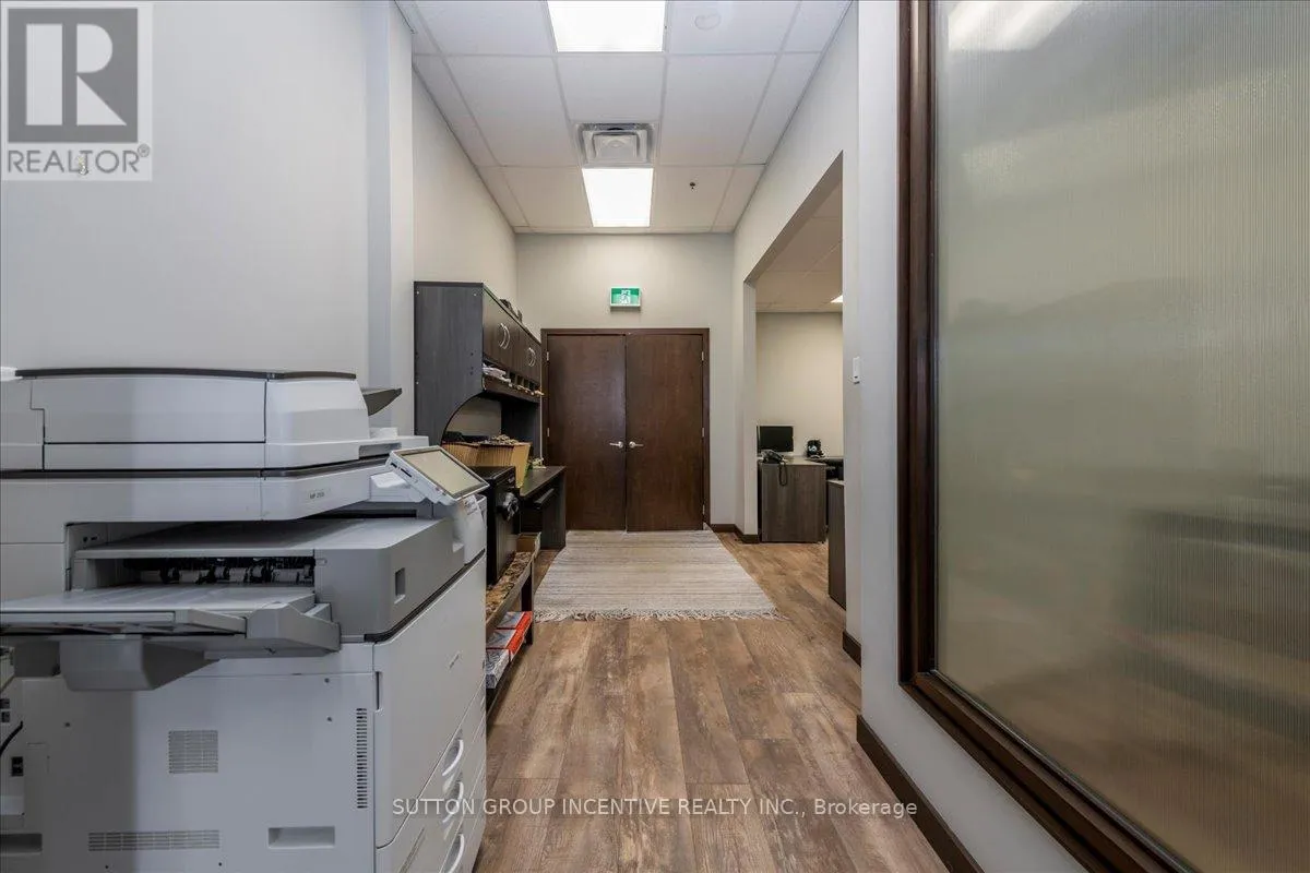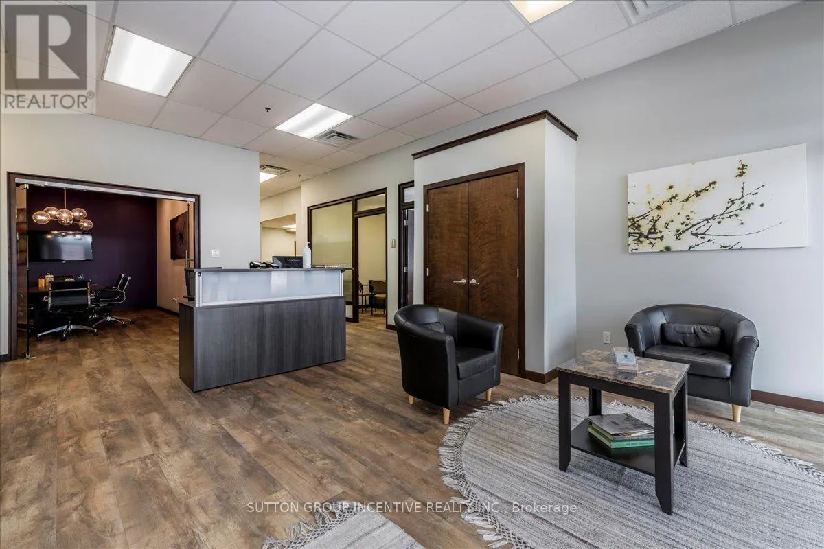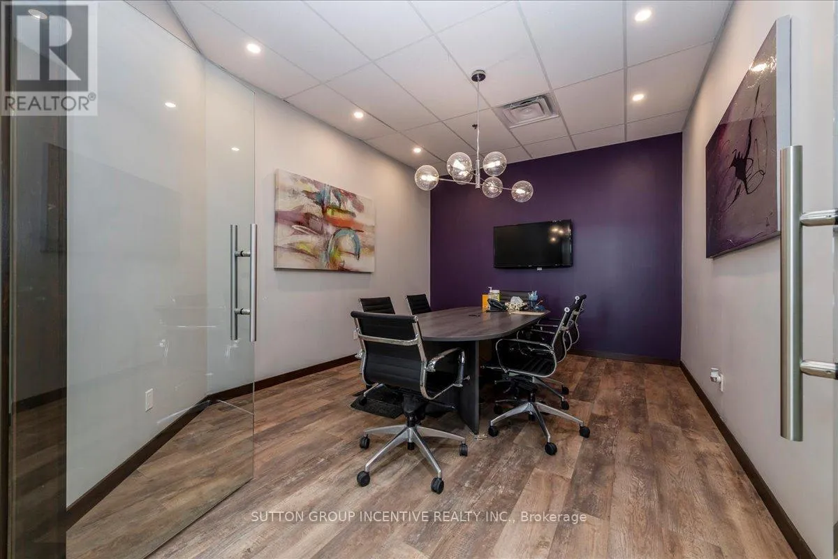 Cross Streets: Tiffin Street & Patterson Road. ** Directions: Located at Corner of Tiffin & Patterson, facing Patterson. Stop paying someone else's mortgage -- own your workspace in the heart of Barrie, just minutes from downtown and Hwy 400. This professionally finished office spans two commercial condo units and was fully renovated in 2019. The front office area features a welcoming reception, waiting area, bright boardroom with custom glass doors, staff/lunch room, four private offices, open work area, and two washrooms -- ideal for a wide range of professional users. At the rear, utilize an approximate 740 SF of warehouse space with a 19' clear height and a 10' x 12' roll-up door, plus an additional 182 SF mezzanine for extra storage. Comfort and efficiency are covered with ductless heat pumps in the front offices for added cooling (2020), updated central air (2020), and a new forced-air natural gas furnace (2023).Included are a built-in custom desk and hutch in the angled office, custom blinds throughout, fridge, dishwasher, microwave, HWT (owned) and boardroom table. Additional furnishings (including copier) may be available, subject to negotiation. Flexible possession. Monthly condo fees of $775.93 include water/sewer, snow removal, landscaping, insurance, management, non-exclusive parking, and building envelope maintenance. (id:27476)