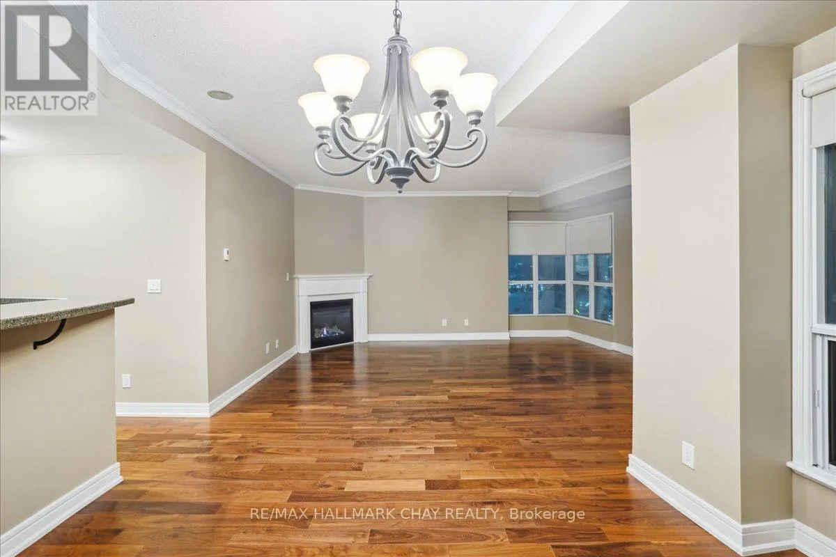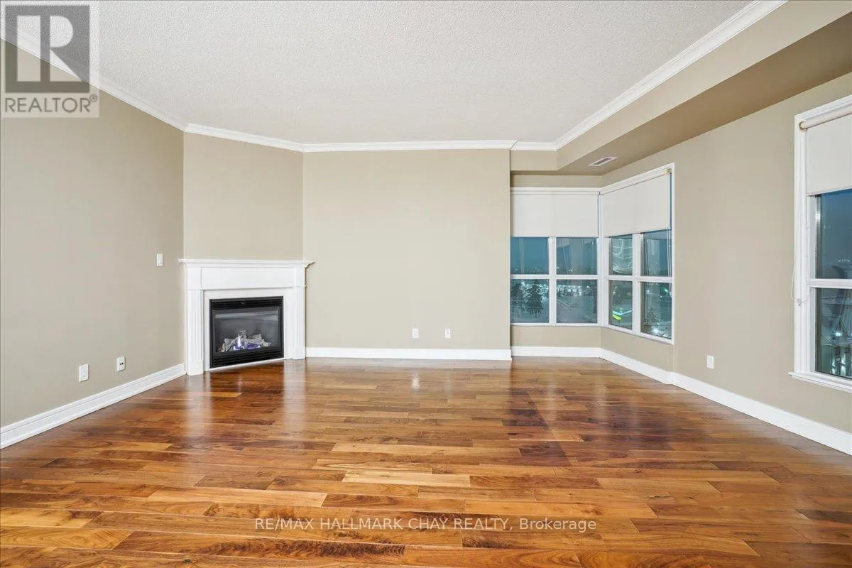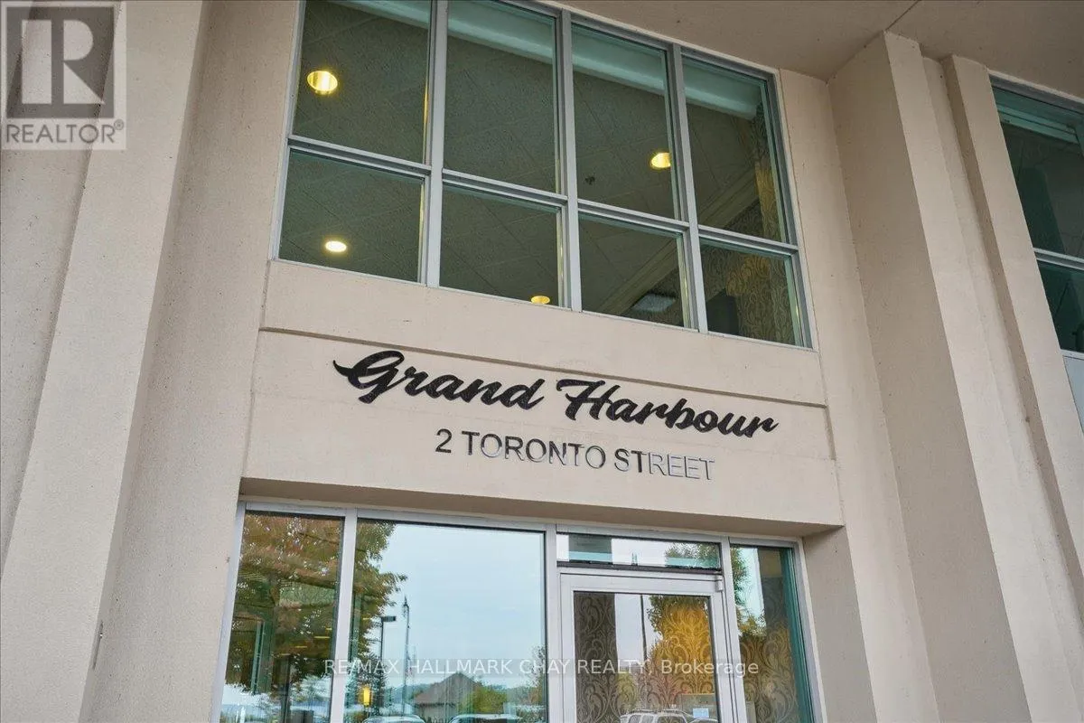 Cross Streets: Simcoe and Toronto. ** Directions: Simcoe St to Toronto St. Wake up every day to breathtaking views of Kempenfelt Bay in this beautifully bright and spacious 2-bedroom, 2-bath suite at the highly sought-after Grand Harbour. Offering approximately 1,340 sq ft of thoughtfully designed living space, this home delivers comfort, style, and an unbeatable waterfront setting.The expansive living room features a cozy gas fireplace, walls of windows, and a walk-out to a balcony where you can soak in panoramic views of the bay, and city skyline. A separate dining room makes entertaining effortless and flows seamlessly into the kitchen, complete with raised granite counters, full-height white cabinetry, stainless steel appliances, under-mount double sink, modern backsplash, pot lighting, and a breakfast bar overlooking the dining area.The primary bedroom is a true retreat with space for a king-size bed, large windows, a walk-in closet, and a private 4-piece ensuite with a separate glass shower. The second bedroom is ideal for guests, a home office, or den and is conveniently located across from the main 4-piece bath.Hardwood floors, tile in the kitchen and baths, crown molding, 9-foot ceilings, roller blinds, and a neutral colour palette add to the home's polished feel. In-suite laundry with stacked washer and dryer, recently updated toilets in both bathrooms, one indoor parking space, and a locker complete the package.Grand Harbour is a well-managed, amenity-rich building offering an indoor pool, gym, sauna, hot tub, party room, games room, guest suites, and an active social community. Walk to the GO Station, stroll to the beach, and enjoy waterfront living at its finest. Rare opportunity to become a part of such a wonderful building. (id:27476)