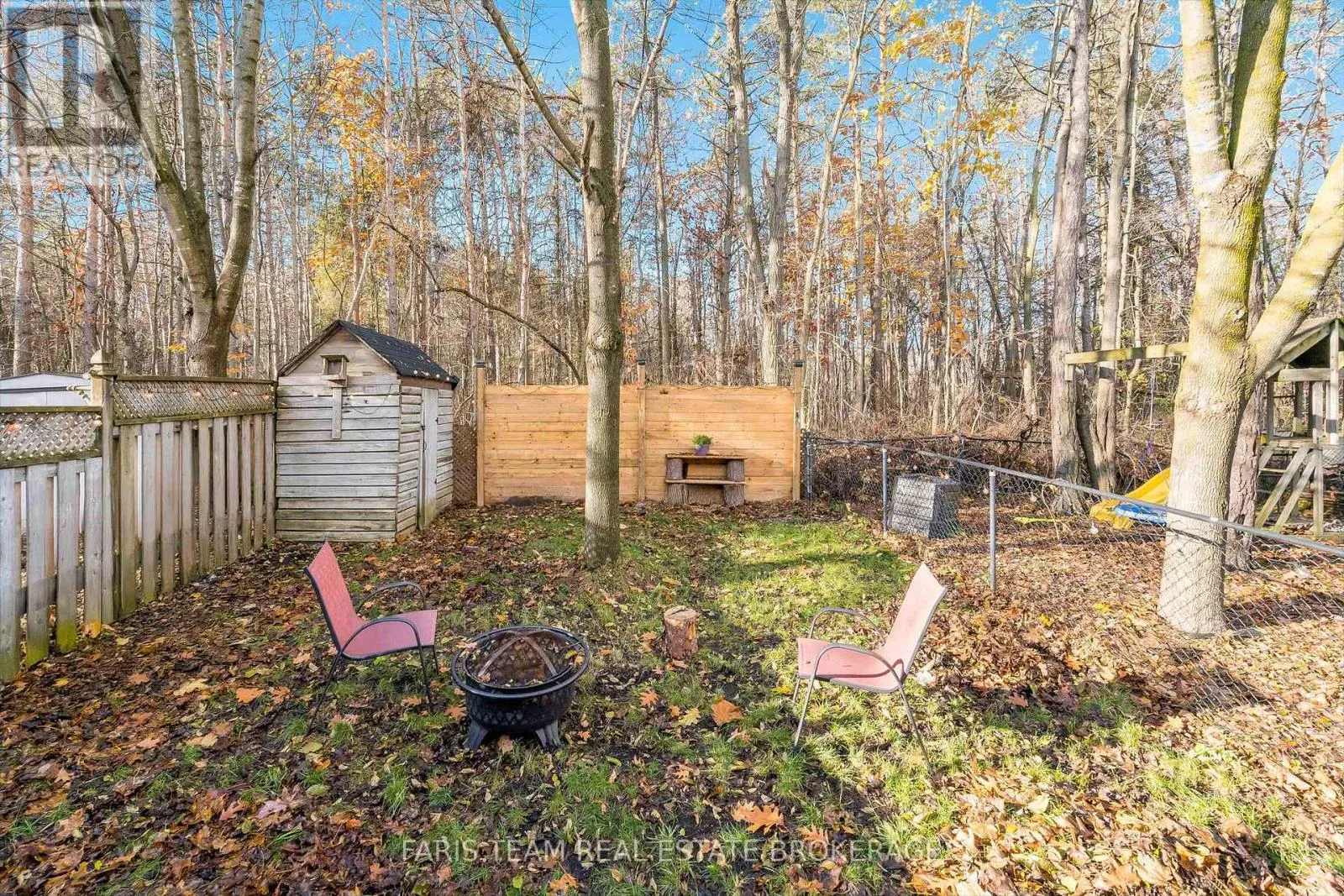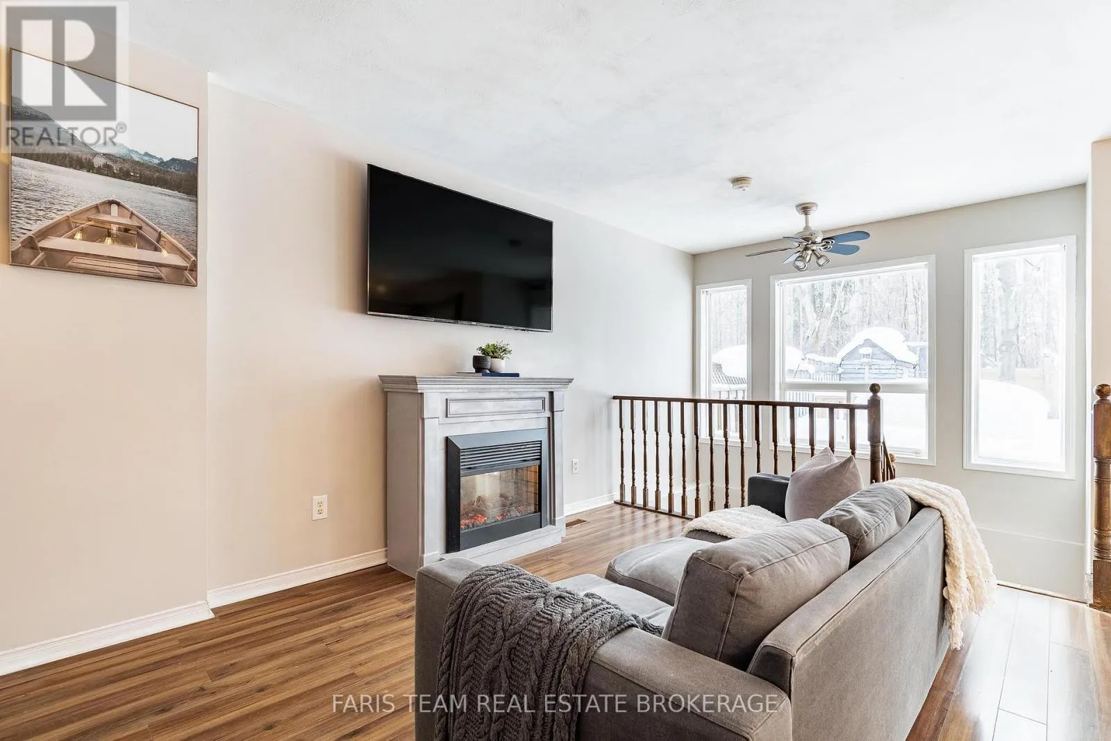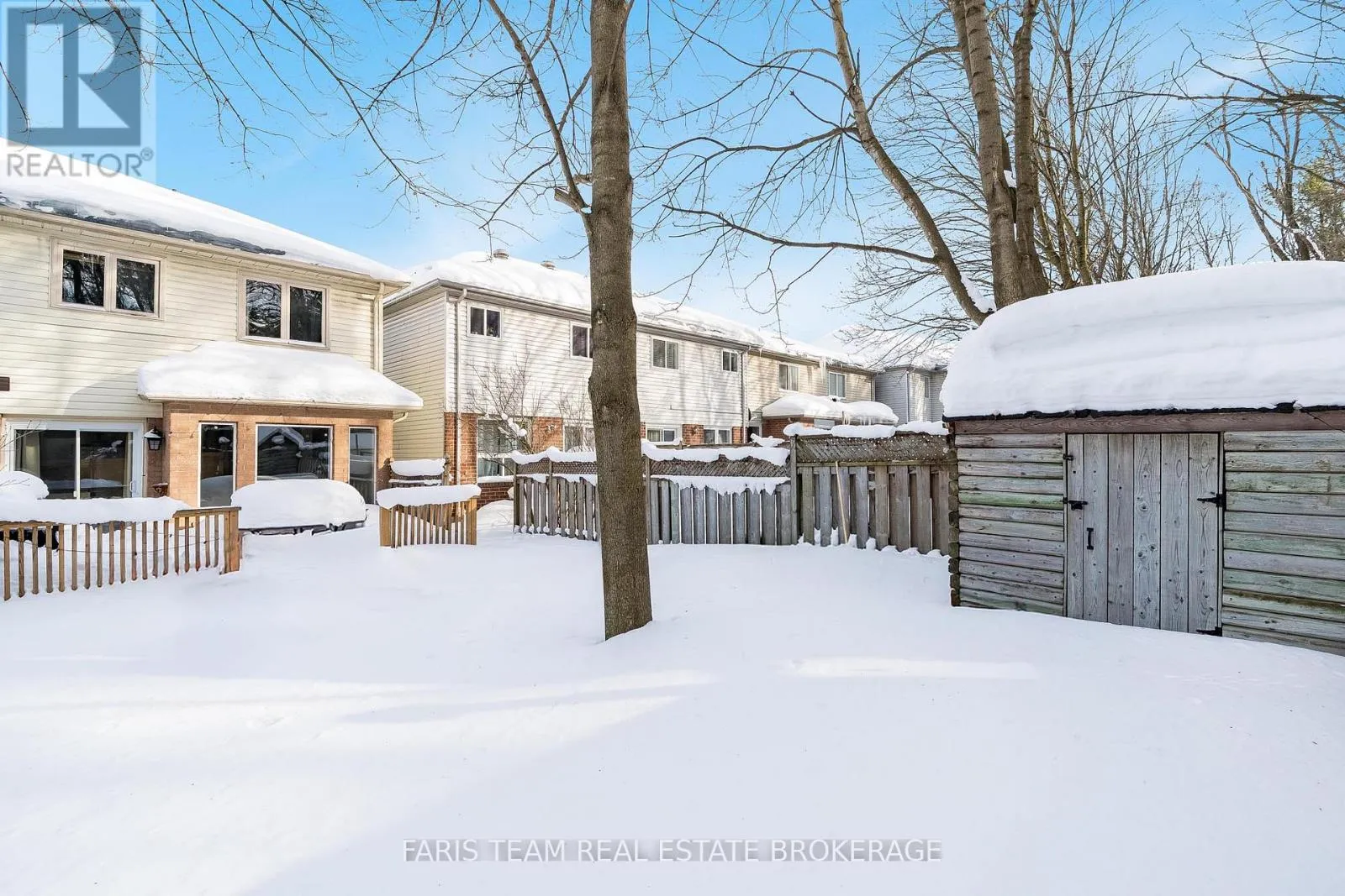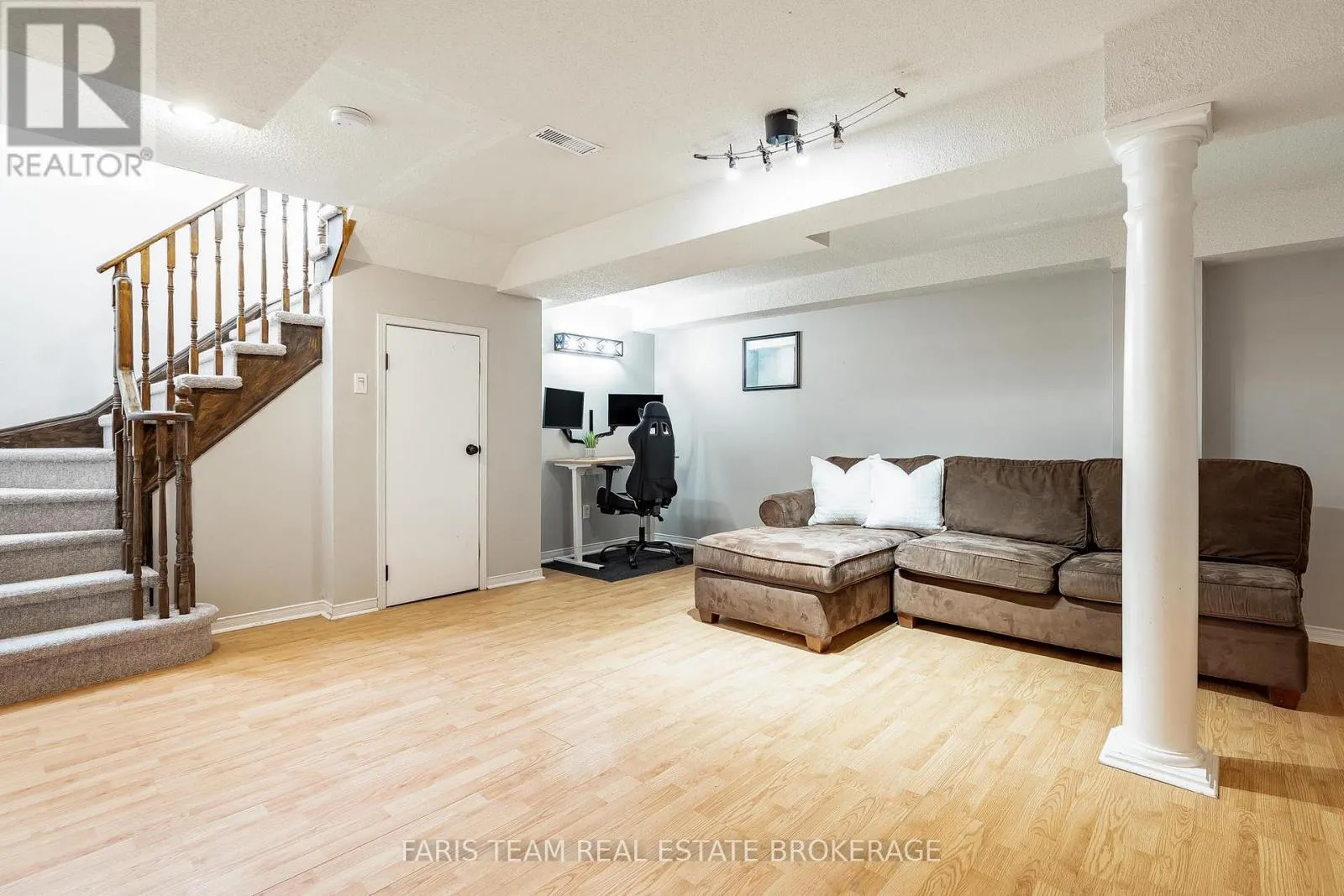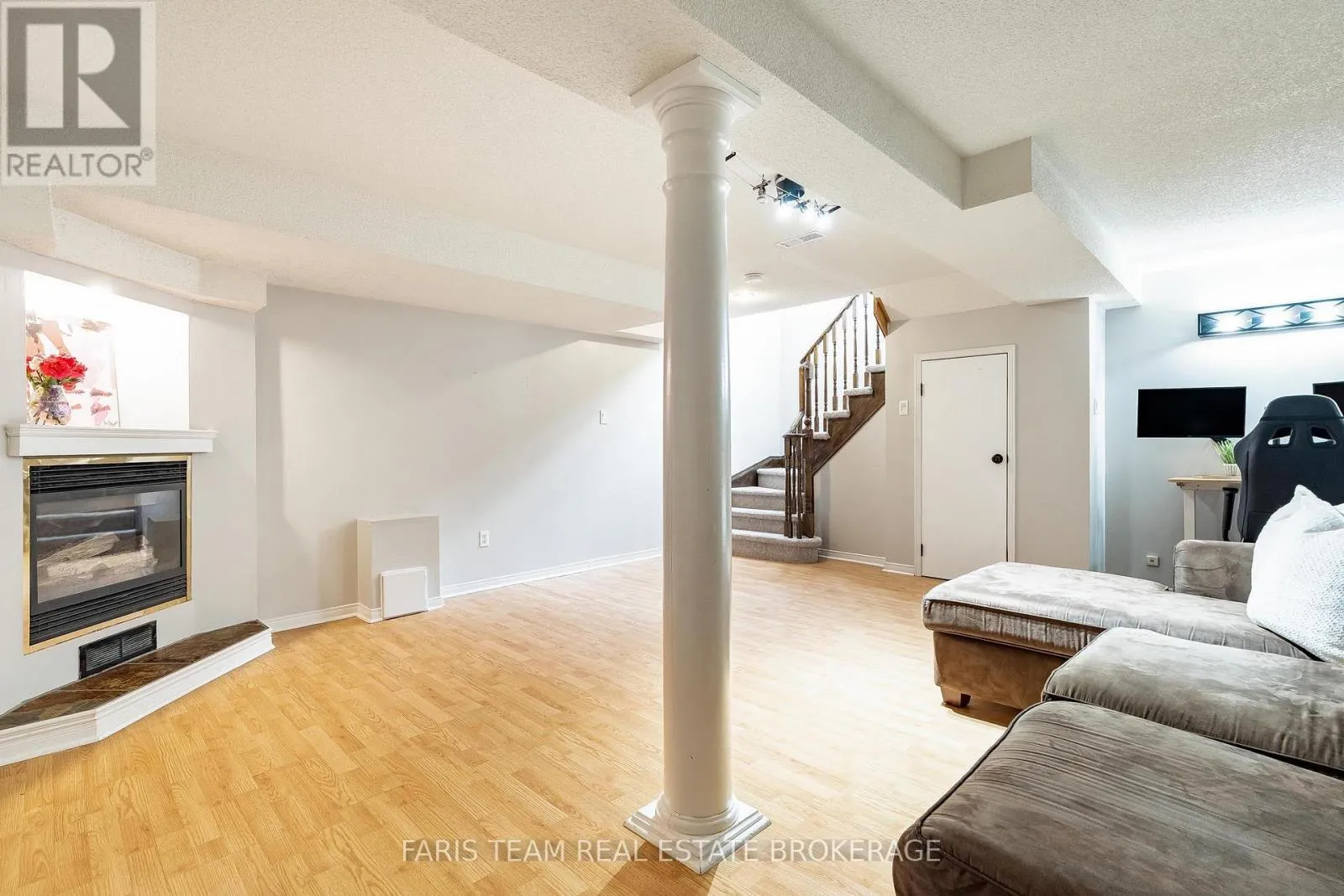 Ardagh Rd/Ferndale Dr S Top 5 Reasons You Will Love This Home: 1) Discover this freehold semi-detached townhome, where you can enjoy privacy with a generous fully fenced backyard featuring a deck, natural gas barbeque hook-up, and serene views of Ardagh Bluff Park with nothing but trees behind you, alongside a convenient side-gate access to the yard 2) Discover a well-planned interior featuring a main level powder room, convenient inside entry from the garage, three spacious bedrooms, and a fully finished recreation room 3) Added peace of mind with numerous updates, including a new roof, front door, back door, and front porch (2020), a back deck (2022), and an owned hot water tank (2025), ensuring comfort, efficiency, and long-term confidence in your home 4) Minutes to Highway 400, with a convenience store, restaurant, and gas station nearby, plus grocery stores, schools, and more just a short drive away 5) Descend to the warm and inviting finished basement, complete with a cozy gas fireplace, perfect for movie nights or relaxed gatherings, along with a convenient storage closet to keep everything neatly organized. 1,450 above grade sq.ft. plus a finished basement. (id:27476)