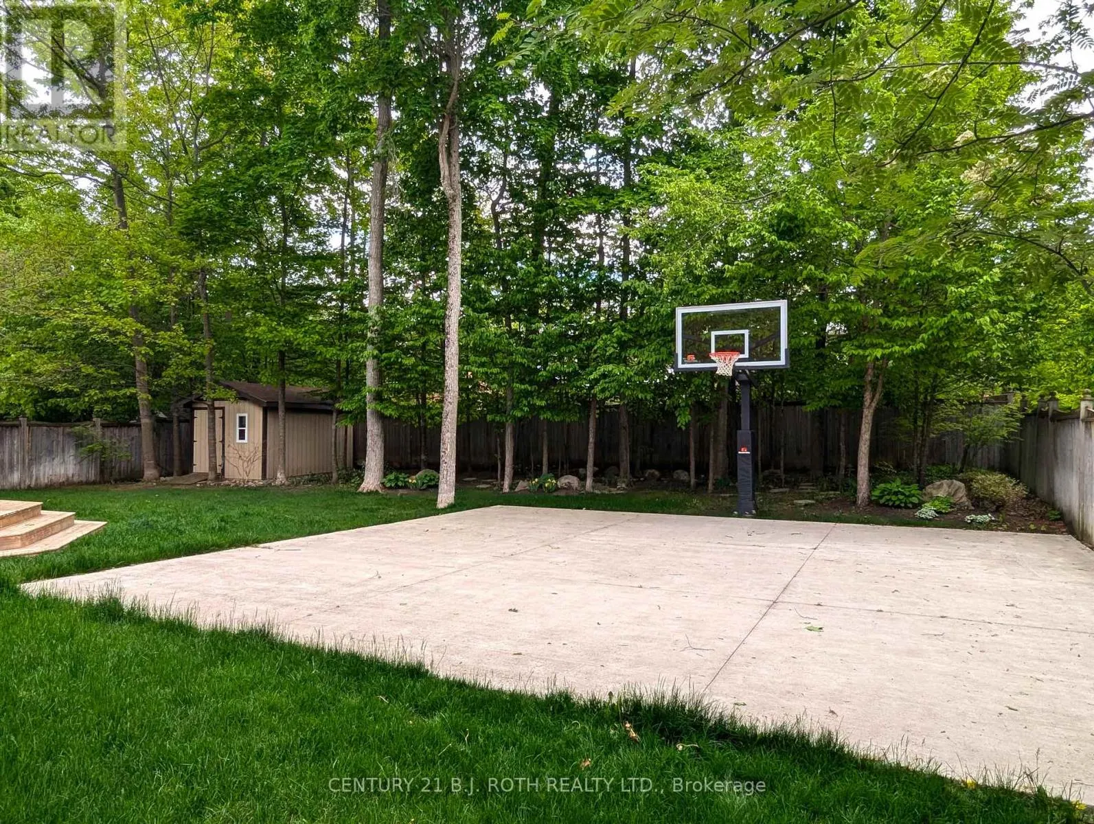 Cross Streets: Big Bay Point x Royal Parkside. ** Directions: Royal Parkside - Prince of Wales - Princess Margaret -. Welcome to refined living in one of South Barrie's most sought-after neighbourhoods, just steps from Wilkins Beach. Set on a private, tree-lined corner lot, this exceptional residence offers nearly 5,000 sq. ft. of finished living space, perfectly blending elegance, comfort, and craftsmanship. Designed for both family living and upscale entertaining, the home features 5 bedrooms and 4 bathrooms, with classic finishes such as rich hardwood floors, crown molding, and impressive vaulted ceilings. The main floor boasts 9-foot ceilings, a private office, formal living and dining rooms and a grand family room with an 18-foot vaulted ceiling and cozy gas fireplace. The chef's kitchen serves as the heart of the home-complete with stainless steel appliances, an oversized island, and a walkout to a spacious deck overlooking the private basketball court with a professional breakaway rim. The landscaped yard is supported by a full irrigation system for easy maintenance. Additional highlights include a tandem triple-car garage with inside entry and a main-floor laundry room. Upstairs, the elegant primary suite offers a spa-inspired 5-piece ensuite and walk-in closet, complemented by three additional spacious bedrooms. The fully finished lower level extends your living space with a home theatre, games room with wet bar and draught tap, open gym area, fifth bedroom, and an additional bathroom (currently 2-piece, roughed in for 3-piece).This rare offering is the perfect opportunity to own a premier home in one of Barrie's most prestigious communities-where luxury meets lifestyle. (id:27476)