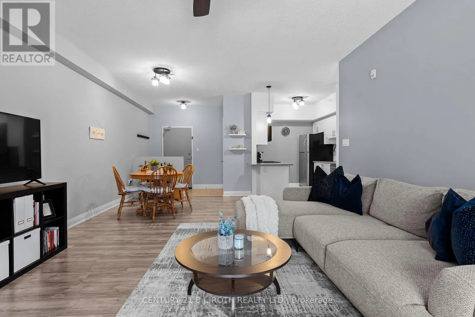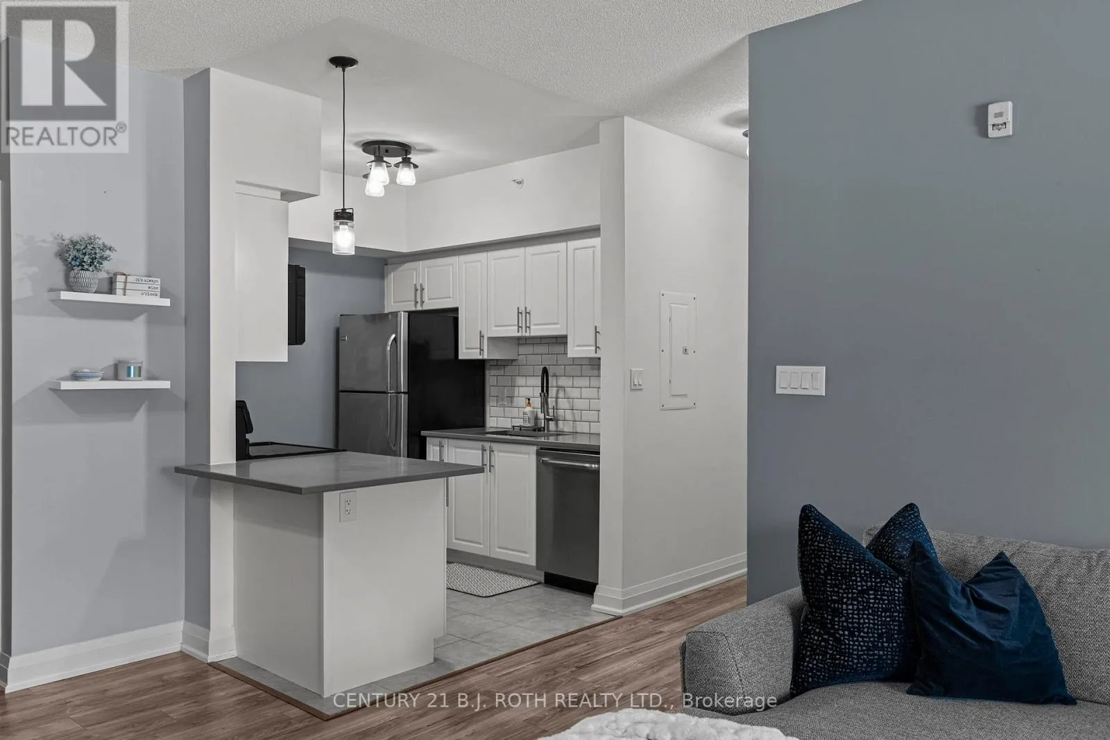 FERNDALE DR S TO GREENWICH ST Presenting 7 Greenwich Street, Suite 108 at Greenwich Village Barrie, a desirable main-floor residence overlooking the Eco-Park that offers a rare sense of calm and privacy. This thoughtfully designed suite features approximately 1,000 sq. ft. of living space with two bedrooms and one bathroom, complemented by one underground parking, one surface parking spot, a storage locker, and a spacious balcony ideal for relaxing or enjoying a barbecued meal. Inside, the home is finished with airy 9-foot ceilings, elegant trim and door casings, high-end laminate flooring throughout, and designer light fixtures. The kitchen showcases white shaker cabinetry, beveled-edge quartz countertops, a tiled backsplash, stainless steel appliances, and a convenient microwave above the range. The bathroom continues the upscale feel with a quartz vanity and a glass-tiled shower. Additional highlights include in-suite laundry and a highly efficient 2-in-1 Napoleon gas furnace and air conditioning system. Residents also enjoy access to a games room, a small parkette, and picnic benches tucked behind the building and surrounded by mature trees. Greenwich Village is proudly maintained and predominantly owner-occupied, making it one of Barrie's most sought-after and well-respected condo communities, a truly exceptional place to call home. (id:27476)
