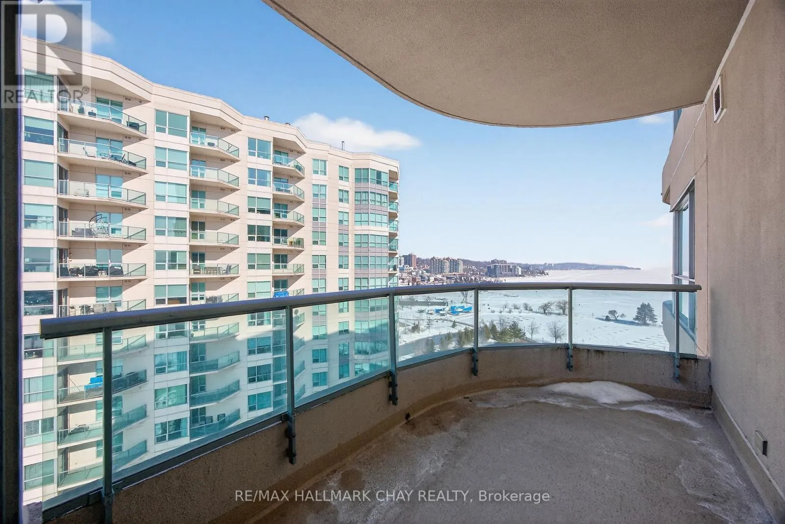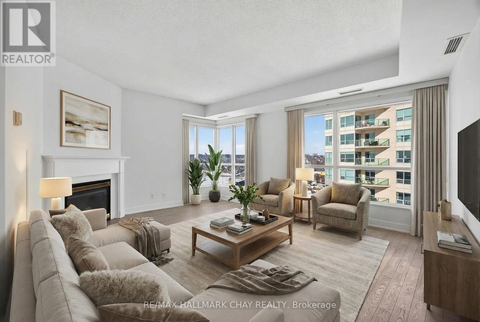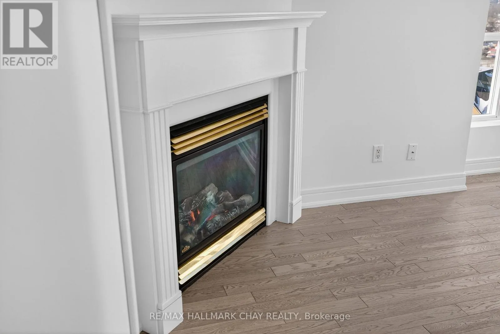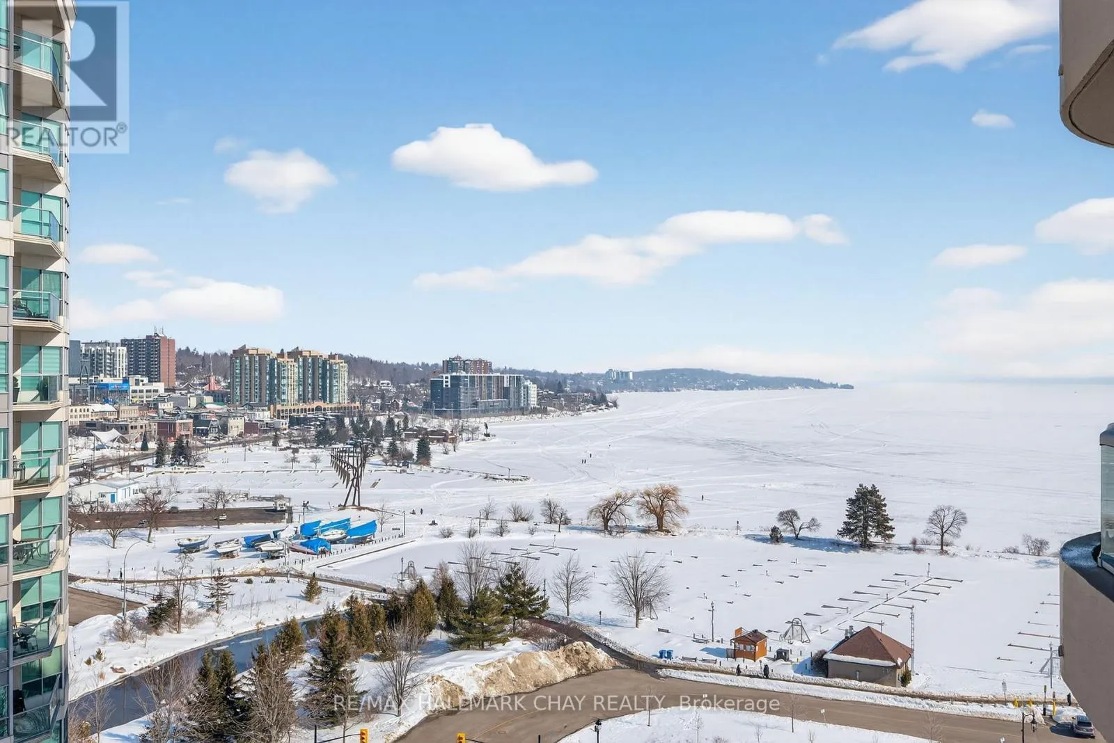 Cross Streets: Simcoe St and Toronto St. ** Directions: Lakeshore Dr to Toronto St. Barrie Condo Corner presents an incredible opportunity at the coveted Grand Harbour Condominiums, right on Barrie's waterfront. This bright and spacious 1342 square foot, 2-bedroom plus den suite is move-in ready and has been thoughtfully upgraded for modern living. The refreshed kitchen features stainless steel appliances, tiled backsplash, new counters, and a deep double sink with a new faucet, setting the tone for style and functionality. A sparkling new dining room chandelier, updated vanities, and engineered hardwood floors add elegance and comfort throughout the home. Sunlight floods the unit, which features wrap-around west, north and east views through the large windows giving it a nice open and airy feel. The rare natural gas fireplace is a beautiful attribute in this unit making it a cozy focal point. Step out onto the private balcony and take in the stunning views of Kempenfelt Bay, Barrie Marina and downtown Barrie. The spacious primary bedroom is a peaceful retreat featuring a walk-in closet with built-in organizers and an ensuite bathroom that features a jetted tub and a separate tiled shower. In-suite laundry, one owned underground parking space, and a storage locker complete this unit. Residents enjoy resort-style amenities including an indoor pool, hot tub, sauna, exercise room, party room, and games room. All of this is just steps from waterfront trails, downtown Barrie, and everything the city has to offer. This is more than a condo. It is a waterfront lifestyle, combining comfort, style, and the best of Barrie living. (id:27476)