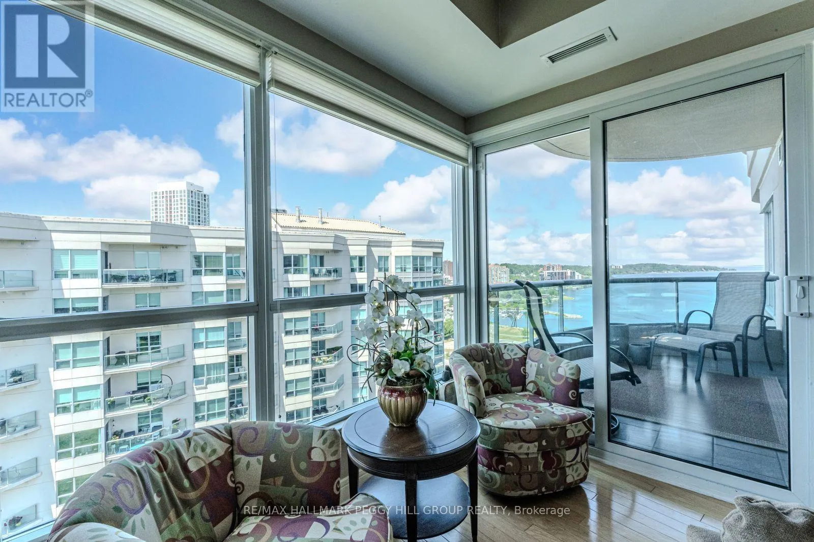 Cross Streets: Simcoe St/Toronto St. ** Directions: Hwy 400/Dunlop St W/Toronto St. CORNER UNIT PENTHOUSE WITH PANORAMIC KEMPENFELT BAY VIEWS! Wake up to the shimmer of the bay and the gentle hum of the marina coming to life across the street. From this top-floor corner suite in Barrie's beloved Lakeshore, life feels lighter and beautifully connected to the water. Set within the sought-after Grand Harbour building, this elevated home captures sweeping views of Kempenfelt Bay, the city skyline, and the boats drifting in and out of the Barrie Marina. Morning walks along the boardwalk, spontaneous beach days at Centennial, intimate patio dinners downtown, and sunset strolls by the water all become part of your everyday routine. Inside, the space is airy and welcoming, with 9-foot ceilings, rich hardwood floors, and a natural gas fireplace that anchors the open-concept living area. The kitchen flows effortlessly into the dining and living spaces, creating the perfect setting for relaxed evenings or hosting friends after a day at the waterfront. Slide open the glass doors and step onto your private balcony, where coffee tastes better at sunrise and evenings are best spent watching the sky melt into the bay. The thoughtful layout offers two spacious bedrooms, including a tranquil primary retreat with a walk-in closet and an ensuite featuring a soaker tub and glass shower. A second full bathroom, in-suite laundry, dedicated parking space, and a storage locker make daily living seamless. Beyond your suite, enjoy resort-style amenities including an indoor pool, fitness centre, games room, and guest suites for visiting family and friends. With quick access to Highway 400, the Allandale GO Station, and nearby transit, commuting is simple while your lifestyle remains effortless. Enjoy lakeside living at its finest, where every day feels like a getaway, and the shoreline is quite literally your front yard. (id:27476)