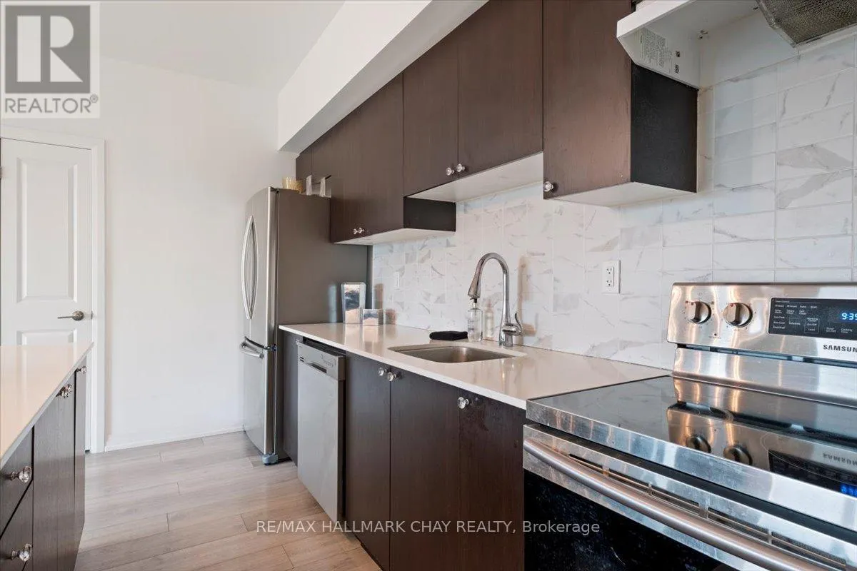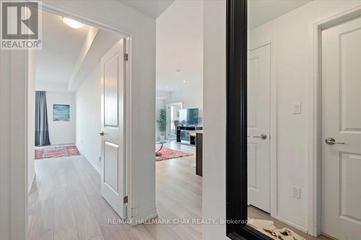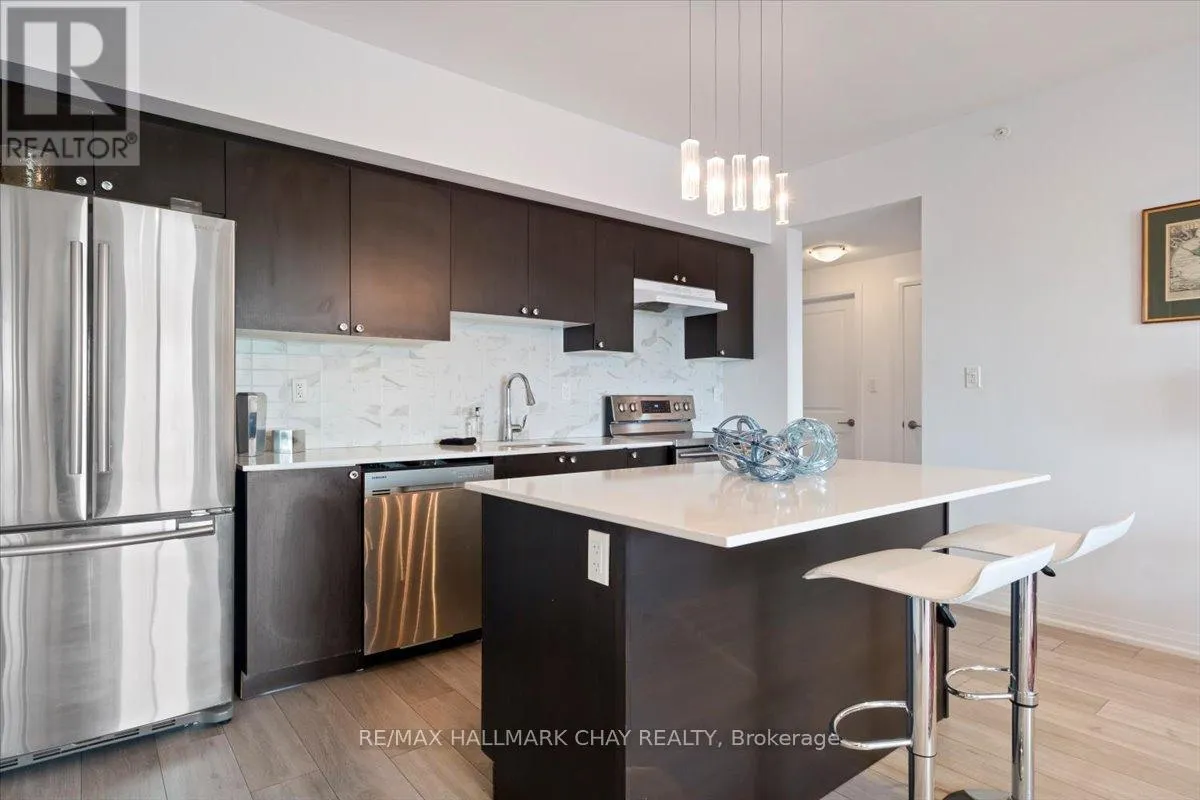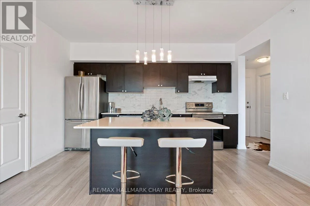 Cross Streets: Livingstone and Cundles Rd E. ** Directions: St Vincent St to Cundles Rd East. Welcome to The Junction in Barrie, where style, space, and convenience come together in this beautifully upgraded corner suite. This spacious 2-bedroom plus den, 2-bathroom condo offers approximately 1,240 sq. ft. of bright, open living space designed for both comfort and entertaining.The gorgeous modern kitchen is the heart of the home, featuring a large centre island with seating, quartz countertops, pot drawers, stainless steel appliances, and pot lights. The open layout flows seamlessly into the generous living room, where large windows fill the space with natural light and a walk-out leads to the covered wrap-around balcony. From this northwest corner vantage point, enjoy quiet skyline views overlooking open fields-truly one of the best locations in the building.The primary bedroom retreat offers plenty of space, complete with a walk-in closet and a private ensuite bath. A versatile den provides the perfect spot for a home office, reading nook, or guest space. Additional features include in-suite laundry with extra storage, quality laminate flooring throughout (carpet-free), 9-foot ceilings, and a water softener.This suite also includes two parking spaces-one underground and one surface-and a storage locker conveniently located with the indoor parking.Ideally situated just steps from the shops and services at North Barrie Crossing, you'll have groceries, restaurants, shopping, theatres, and medical services all within walking distance. Plus, you're just minutes to Highway 400, Royal Victoria Regional Health Centre, Georgian College, and Little Lake, making commuting and daily errands incredibly convenient. (id:27476)
