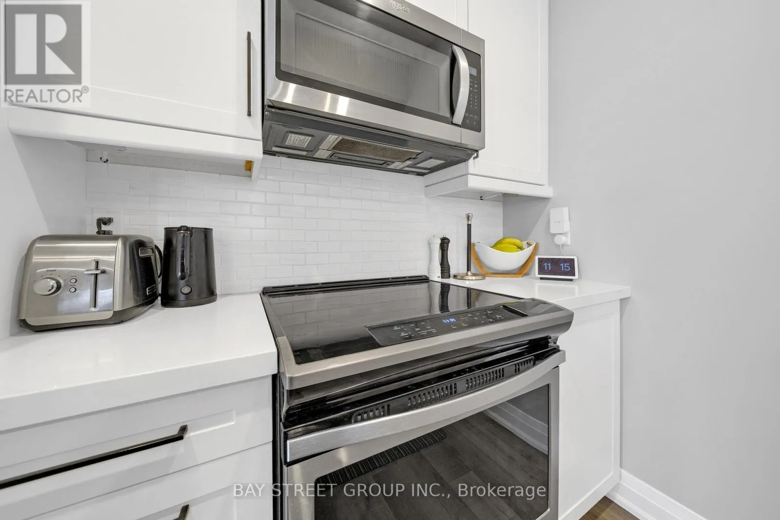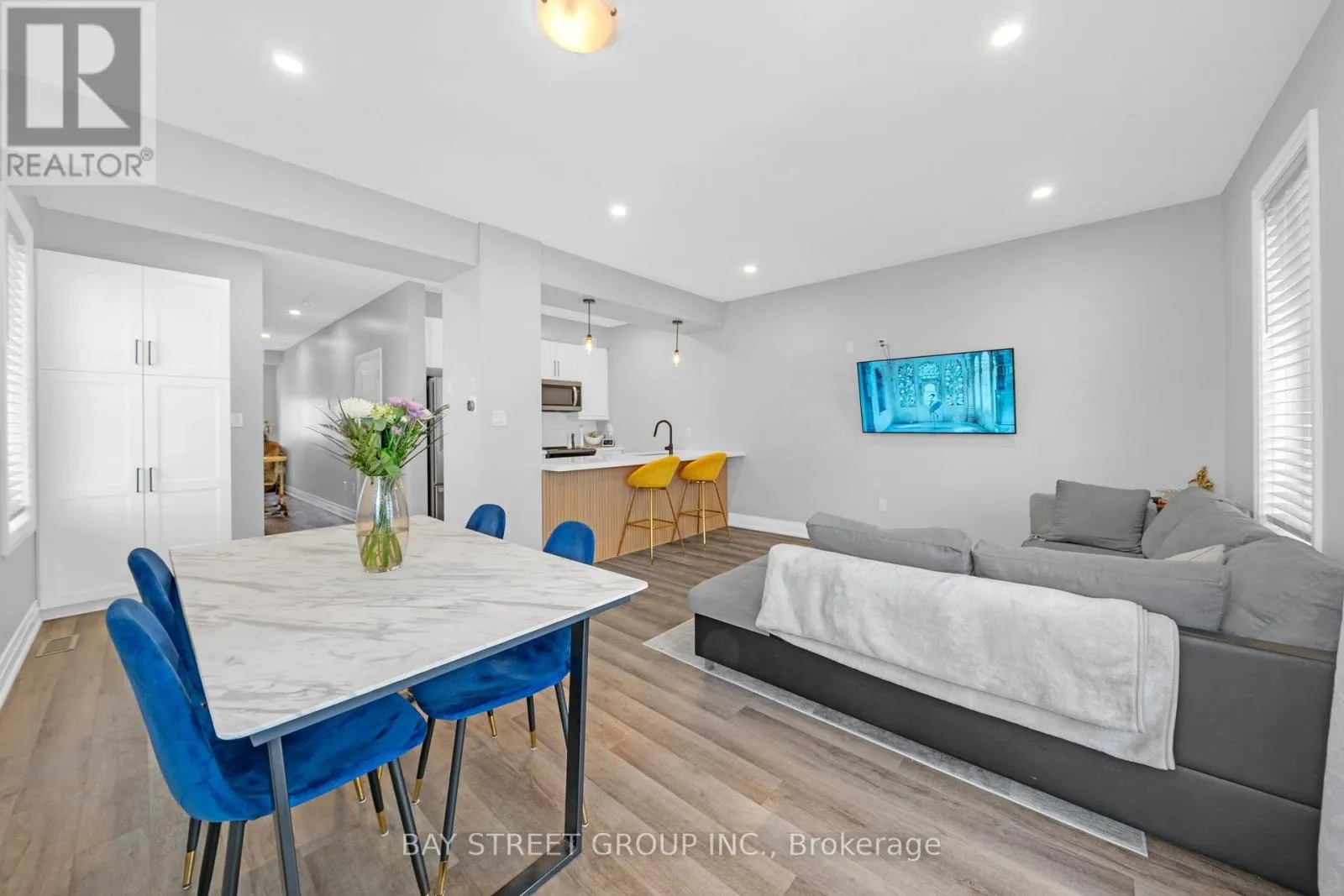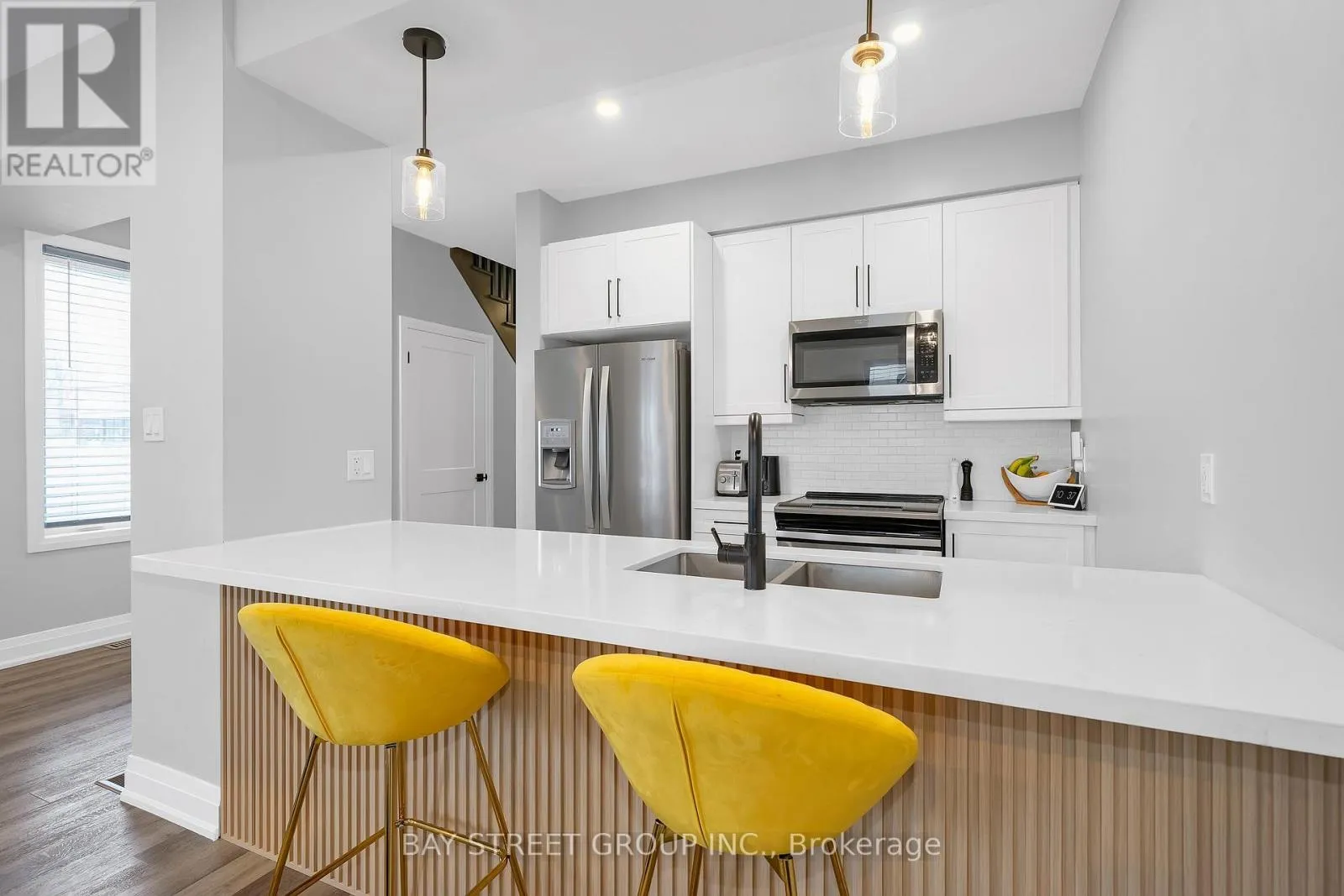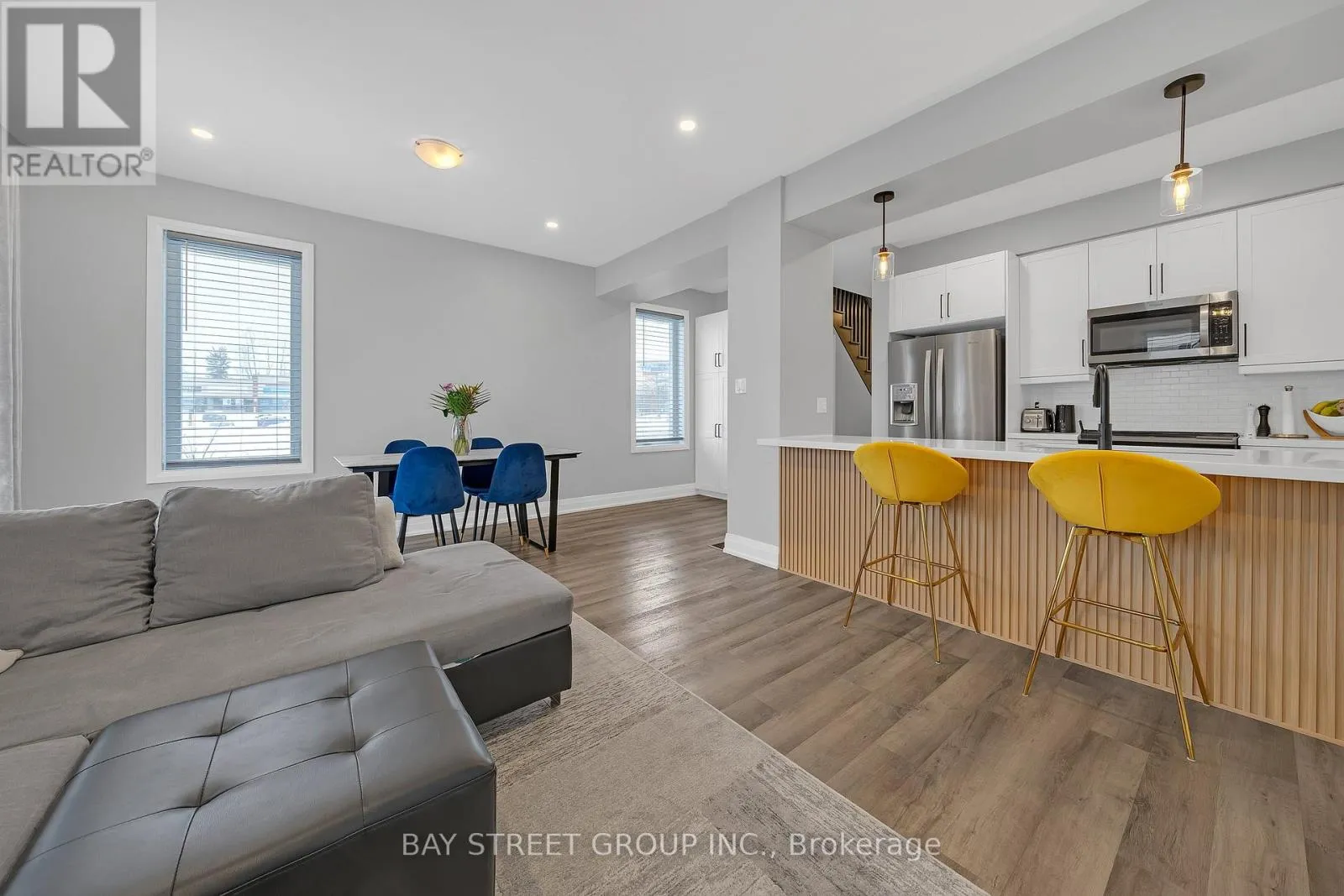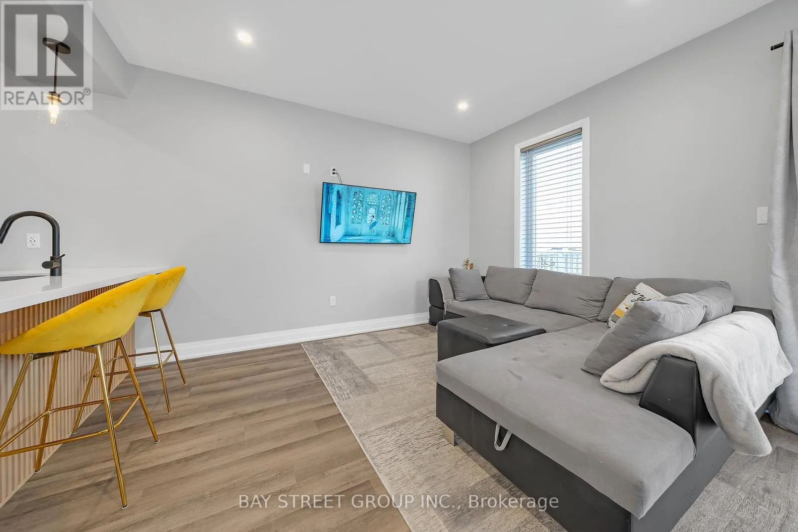 Livingstone and St. Vincent Street 5-year-old executive end-unit townhome with 3 bdrm and 4 baths. Finished basement. Central Barrie location, close to top-rated schools, Georgian Mall, recreation centre, shopping, restaurants, and transit. Quality-built home with open-concept layout and 9-ft ceilings on the main floor. Kitchen features upgraded cabinetry, quartz countertops, backsplash, stainless steel appliances, and large centre island. Walkout to private interlocked backyard. Triple-pane windows, hardwood staircase, and upgraded light fixtures. Second floor offers three bedrooms, two bathrooms, and upper-floor laundry. Primary bedroom with walk-in closet, ensuite, and custom built-in wall unit with desk and storage drawers.Finished basement with a large recreation room and a 3-piece bathroom. Well-maintained home in a family-friendly neighbourhood. Pride of ownership. Shows like new. Move-in ready home in a convenient Barrie location close to schools, parks, shopping, and everyday amenities. Freehold townhome with POTL fee covering snow removal and common elements maintenance. (id:27476)
