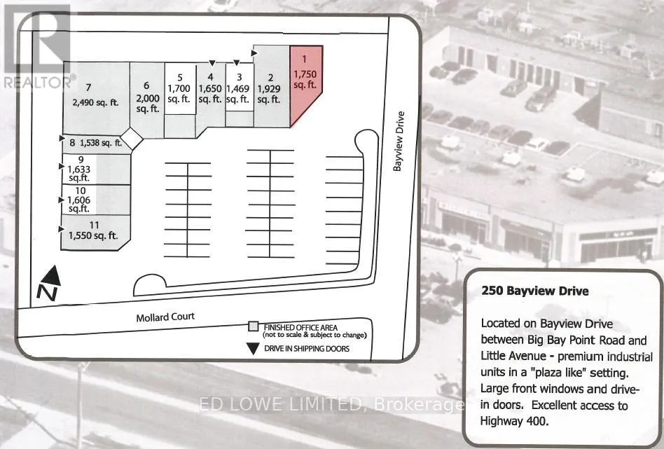 Cross Streets: BAYVIEW DR NORTH AT MOLLARD. ** Directions: Big Bay Point To North On Bayview Ave. 1750 s.f. of finished space, corner unit with great exposure to Bayview Dr in Barrie's south end. Busy Street. Ample Parking. On bus route, close to Highway 400 access, Recreational Centre, shopping and restaurants. Tenant pays utilities. $13.00/s.f./yr & TMI $7.75/s.f./yr + HST, Utilities. (id:27476)