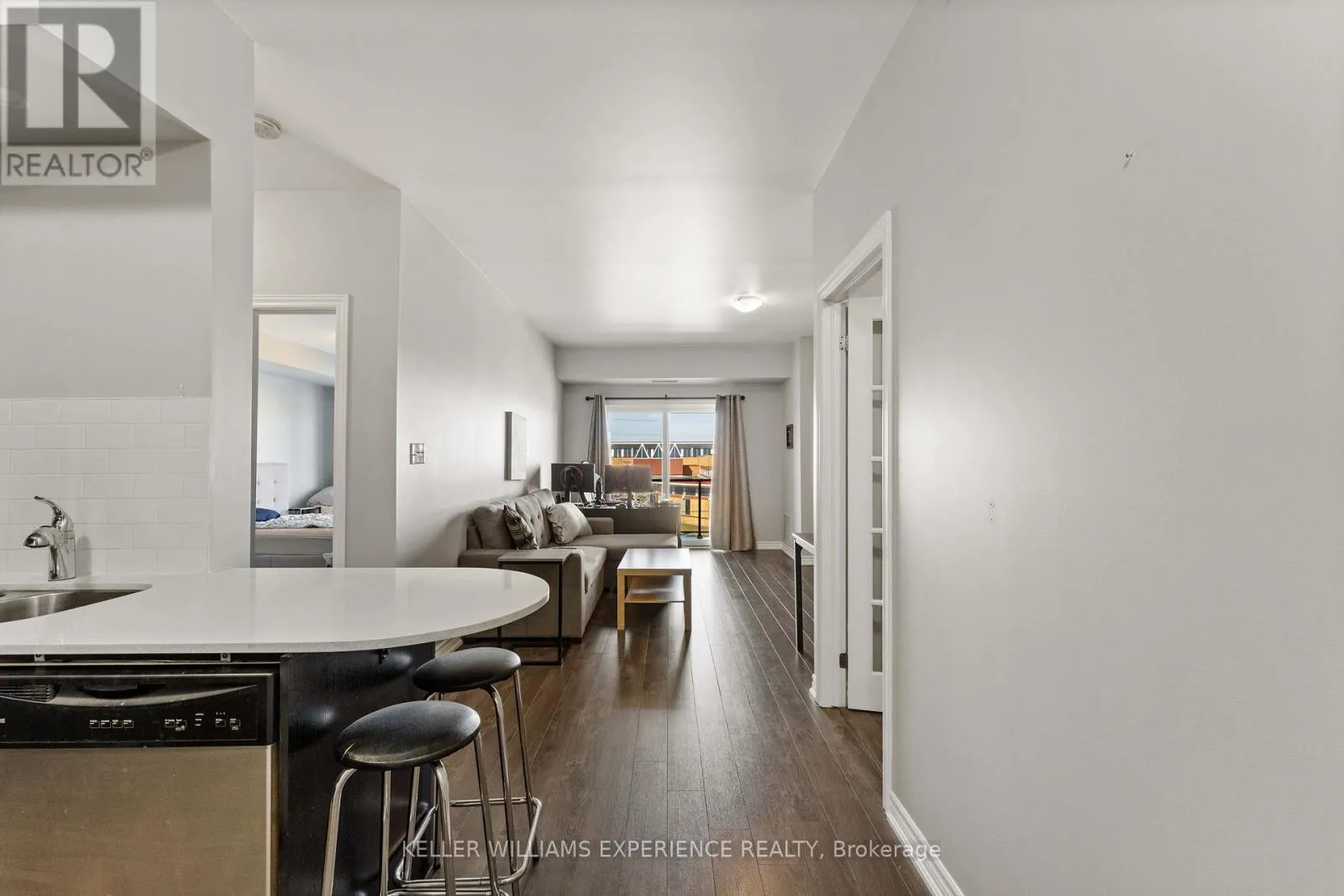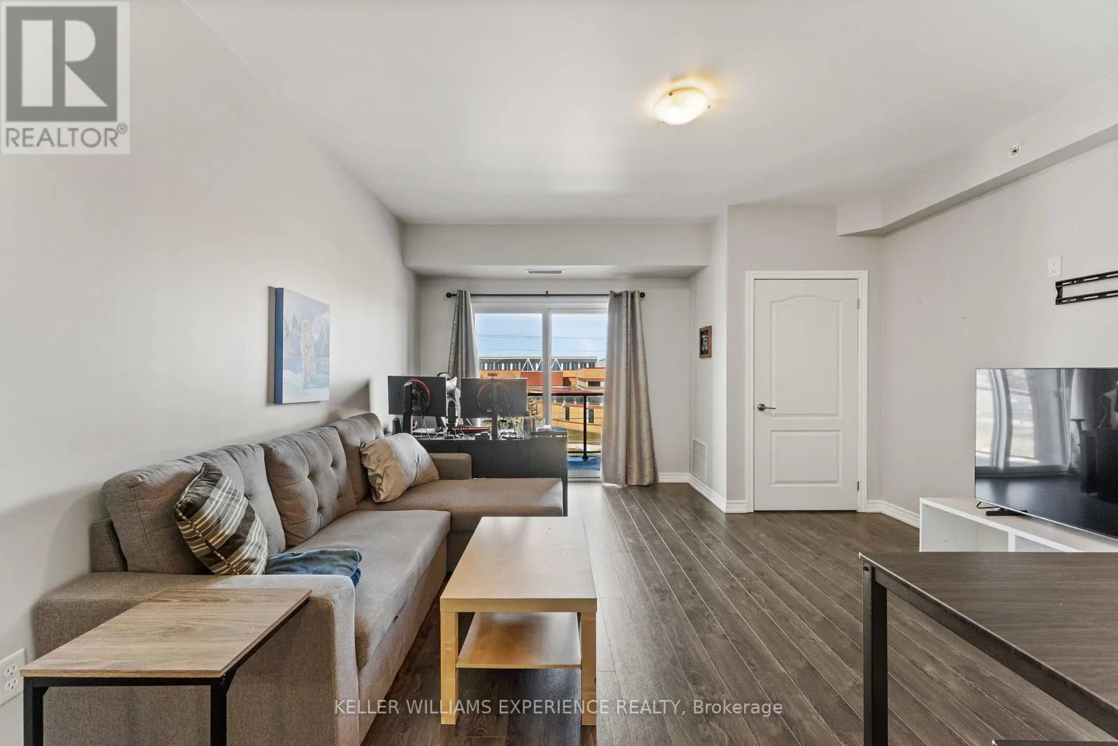 Cross Streets: YONGE/MADELAINE. ** Directions: BIG BAY POINT TO YONGE ST. Welcome to #307-780 Yonge St in Barrie! Beautifully maintained 3rd-floor 1 Bedroom + Den condo in the sought-after Yonge Station community, perfectly located for commuters-steps to the South GO Station, minutes to the highway, and walking distance to schools, parks, shopping, and all amenities. This bright and airy suite features a modern open-concept layout with 9 ft ceilings and tasteful upgrades throughout. The kitchen offers quartz countertops and a breakfast bar, overlooking the spacious living/dining area with walkout to a covered 13.9 x 6.10 ft balcony-ideal for entertaining and BBQs. The large primary bedroom is filled with natural light and comfortably fits a king-sized bed. The versatile den provides the perfect space for a home office or potential second bedroom. Additional features include in-suite laundry, 1 underground parking space, and a storage locker. Enjoy access to a renovated private gym. Impeccably clean, smoke and pet-free, and truly move-in ready. A fantastic opportunity in a prime commuter location-don't miss it! (id:27476)