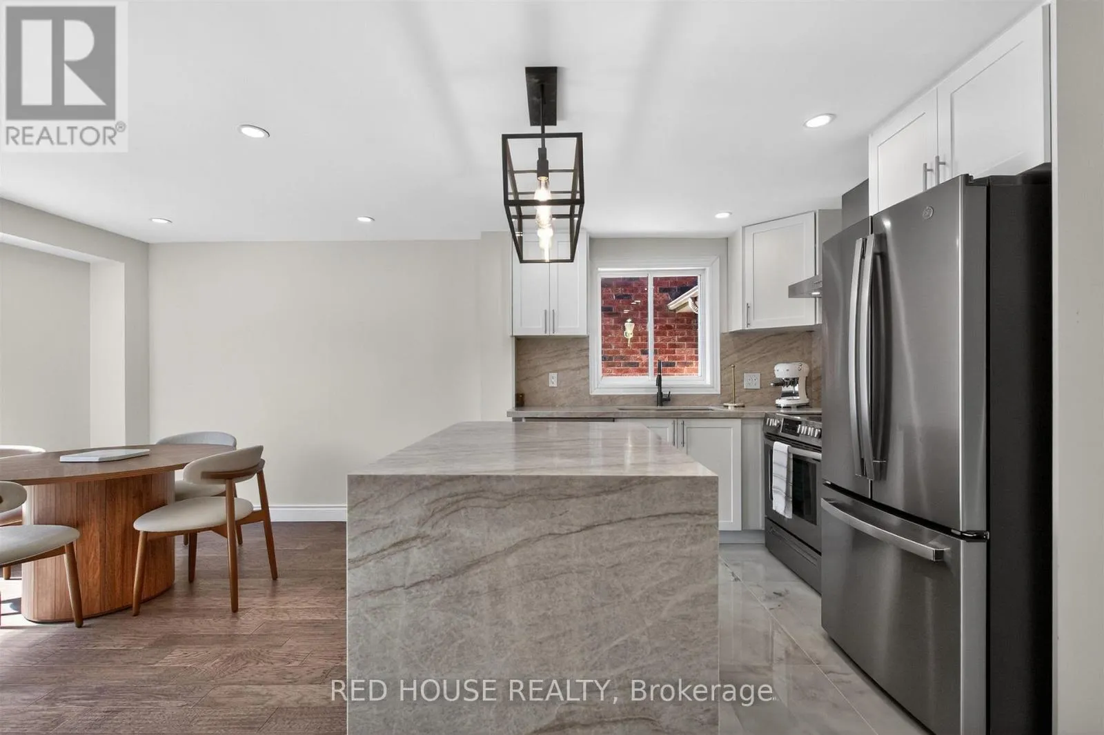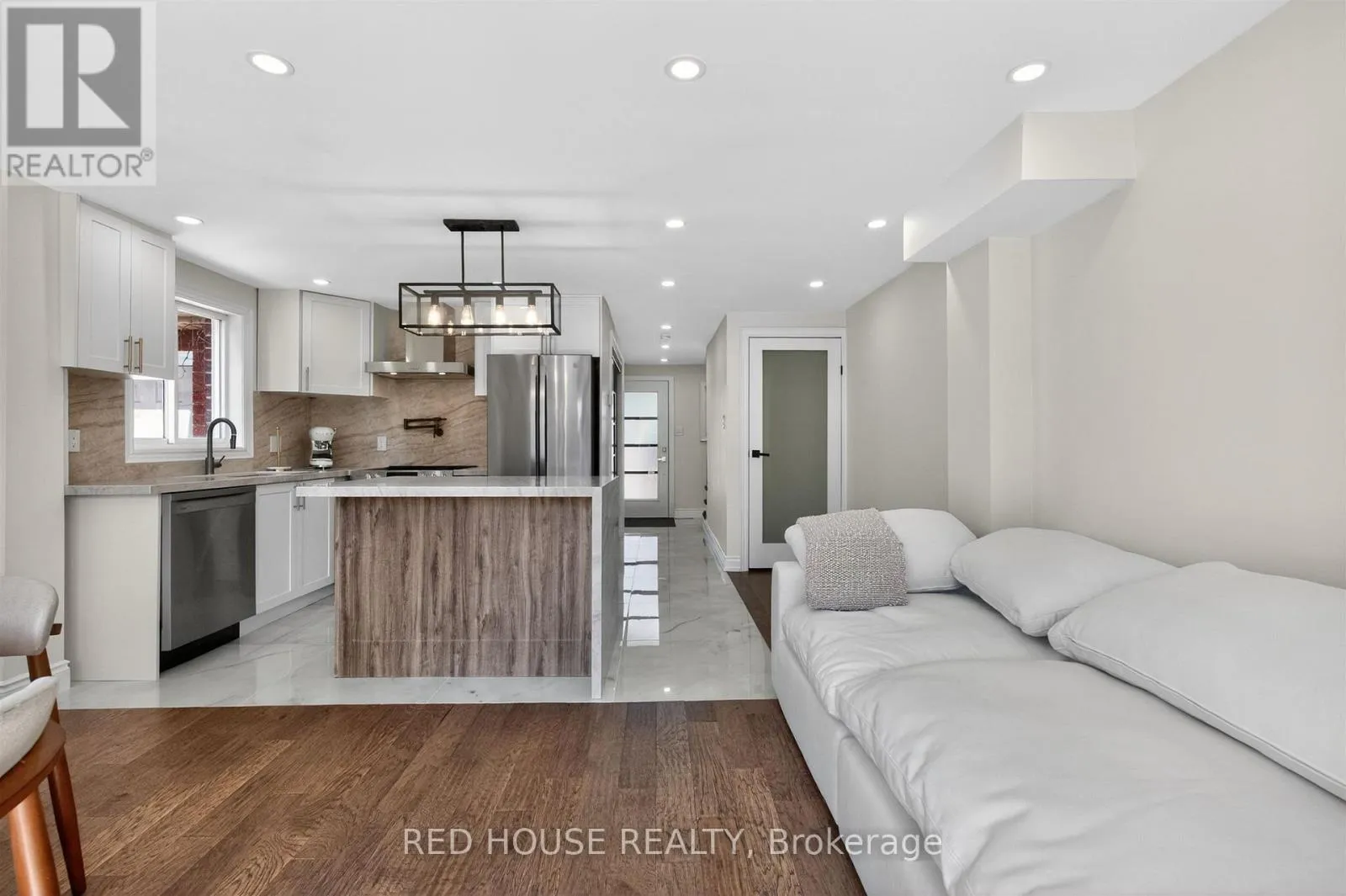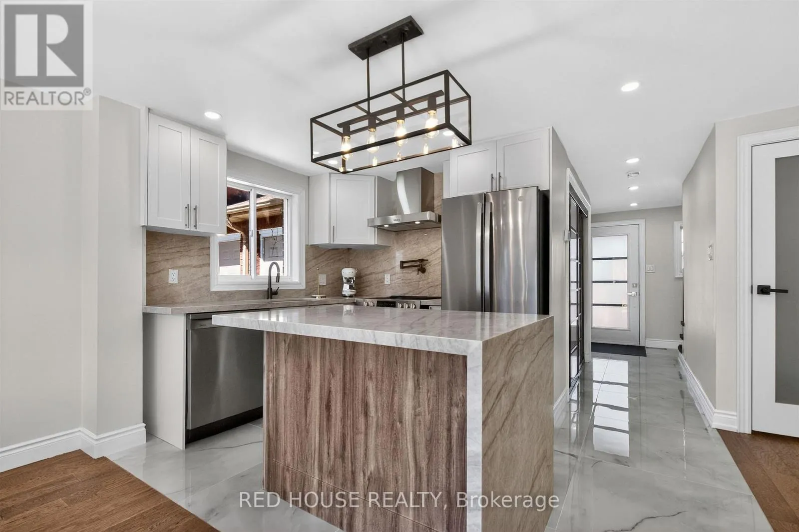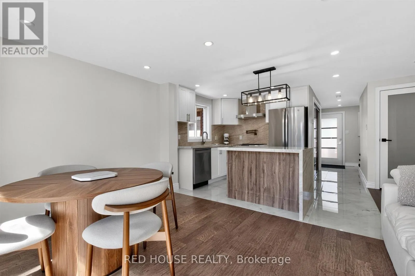 Georgian & Penetanguishene This meticulously upgraded residence where modern design and high-quality finishes come together in a premium offering. From the moment you arrive, the expanded front deck enhances curb appeal and creates a welcoming entry. Inside, the home unfolds with a clean, contemporary aesthetic defined by exceptional design and cohesive materials. Hardwood flooring and large format tile runs throughout the principal living spaces. The open-concept layout is bright and inviting, anchored by a stunning kitchen that has been thoughtfully reimagined. The kitchen features striking quartzite countertops and backsplash with a waterfall-style island, paired seamlessly with beautiful custom cabinetry. Stainless steel appliances, a modern range hood, and a designer light fixture complete the space, while the layout flows effortlessly into the dining and living areas-ideal for both everyday living and entertaining. The main floor is enhanced by pot lights throughout. Large sliding doors at the rear allow for natural light to flood the space. The staircase itself is finished with solid wood treads, glass panel railings, and black accents. The washrooms have been elevated to a spa-like standard. The primary bathroom showcases a frameless glass shower enclosure with black fixtures, and a rainfall shower system. A custom vanity with warm wood tones, and vertical slat paneling adds depth. Additional details throughout the home include upgraded interior doors, black lever hardware, and clean trim work. The lower level offers a fully finished, turn-key space with tiled flooring throughout, extending the living area and providing flexibility for recreation, work, or extended family use. Ideally situated in Barrie's sought-after Georgian Drive community, this home offers exceptional proximity to Highway 400, providing access for commuters, while close to a wide range of amenities. Every element has been carefully considered and executed, resulting in a home that is truly turnkey. (id:27476)