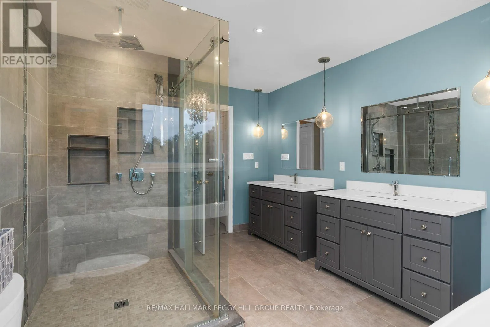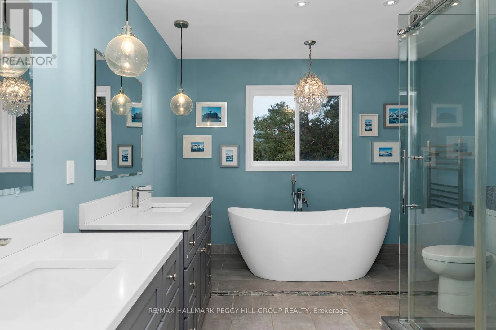Cross Streets: BIG BAY POINT ROAD/SANDRINGHAM DRIVE. ** Directions: BIG BAY POINT ROAD/SANDRINGHAM DRIVE/BIRKHALL PLACE. SOUGHT AFTER NEIGHBORHOOD WITH PRIVATE BACKYARD OASIS, AN IN-GROUND SALTWATER POOL, ON A RAVINE LOT, OVER 3,600 SQ FT OF BEAUTIFULLY FINISHED LIVING SPACE & A WALKOUT BASEMENT! This backyard feels more like a private resort, with an inground saltwater pool, an interlock patio, an oversized deck, EP land and a ravine beyond, no direct neighbours behind, and an interior that follows through with soaring ceilings, an updated chef's kitchen, and 3,650+ finished sq ft of elevated living space. Situated on a well-regarded street in Barrie's highly sought-after Innishore neighbourhood on a landscaped 49 x 174 ft lot, this home makes an inviting introduction with a covered front porch, an attached garage with inside entry, and a front entry framed by sidelights and a transom. Beyond the front door, the interior unfolds with walnut engineered floors, upgraded light fixtures, tasteful finishes, and impressive ceiling height. The kitchen is beautifully appointed with stone counters, two-tone cabinetry with crown moulding, under-cabinet lighting, upgraded stainless steel appliances including a gas cooktop, a B/I double wall oven, and a B/I microwave, plus a peninsula with pendant lights. Clear sightlines lead into the great room, where a soaring 20 ft ceiling, custom built-ins, and a gas fireplace give the space a dramatic sense of scale, while the combined living and dining room adds versatility. A main floor office with a walkout to the deck adds flexibility for working from home or creating an executive-style workspace. The primary suite is introduced through double doors and features a walk-in closet, a second closet, and an updated 5-piece ensuite with dual vanities, a freestanding tub, and a glass-walled shower. The finished walkout basement with in-law capability adds a large rec room, a full bathroom, and a sliding glass door walkout. Innishore places schools, parks, and trails within walking distance, while daily essentials and the waterfront are just minutes away. (id:27476)