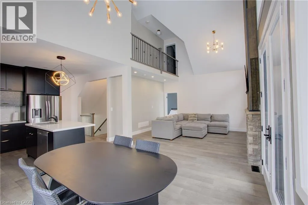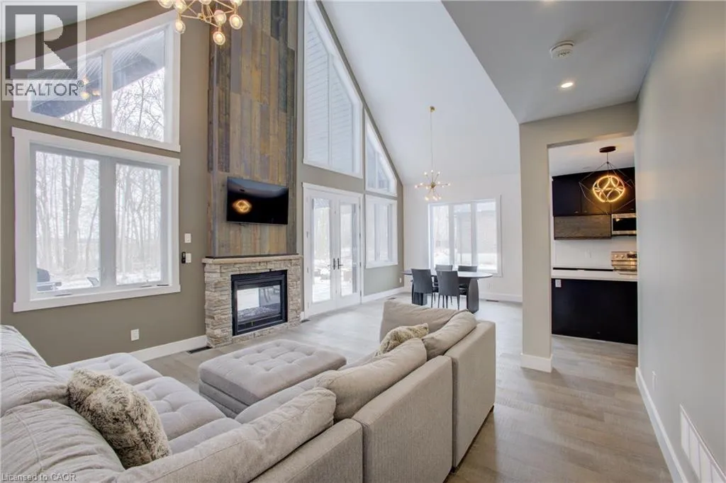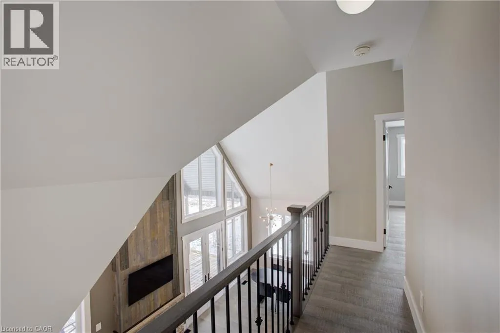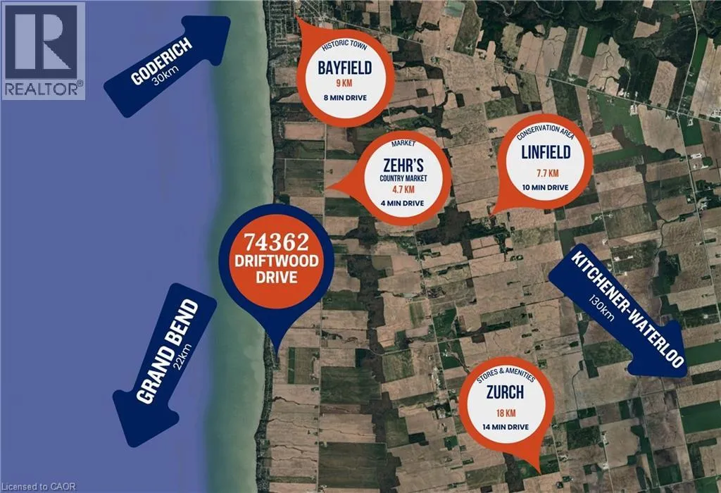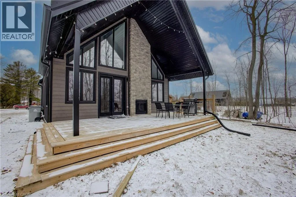 Architecturally striking and set on nearly an acre, with 2,850 sq ft of refined living space, this one-of-a-kind home is just a short walk to the shores of Lake Huron. The space is defined by soaring vaulted ceilings, dramatic full-height windows, and a seamless connection to the surrounding forest. Step inside and the space immediately opens up with natural light pouring in from every angle while treed views become the backdrop to everyday living. The open-plan kitchen, living, and dining area is designed for both comfort and entertaining, anchored by quartz countertops, extensive full-height cabinetry, and dual-aspect windows. A double-sided gas fireplace creates a warm focal point, extending seamlessly to the covered 26â x 12â deck, where a vaulted ceiling enhances the sense of space, perfect for quiet mornings or evenings outdoors. The main floor primary suite is a true retreat, complete with its own walkout to a private deck overlooking the forest and fields, a spacious walk-in closet, and a beautifully appointed ensuite with double vanity and oversized walk-in shower. A convenient powder room completes the level. Upstairs, two generously sized bedrooms with ample closet space are complemented by a 4-piece family bath and an overlook that enhances the homeâs sense of openness. The fully finished basement adds even more versatility, featuring a fourth bedroom, bathroom with shower, laundry, and flexible space ideal for a home office, gym, or recreation area. Outside, the expansive 98 x 356 ft lot offers exceptional privacy, ample parking for 10+ vehicles, and a dedicated firepit area with built-in seating, perfect for gathering under the stars. Located just minutes from the charming village of Bayfield, this property offers an exceptional lifestyle. Bayfield is known for its historic Main Street, boutique shops, dining, marina, and beautiful beaches, making it a sought-after destination for both full-time living and weekend escapes. (id:27476)