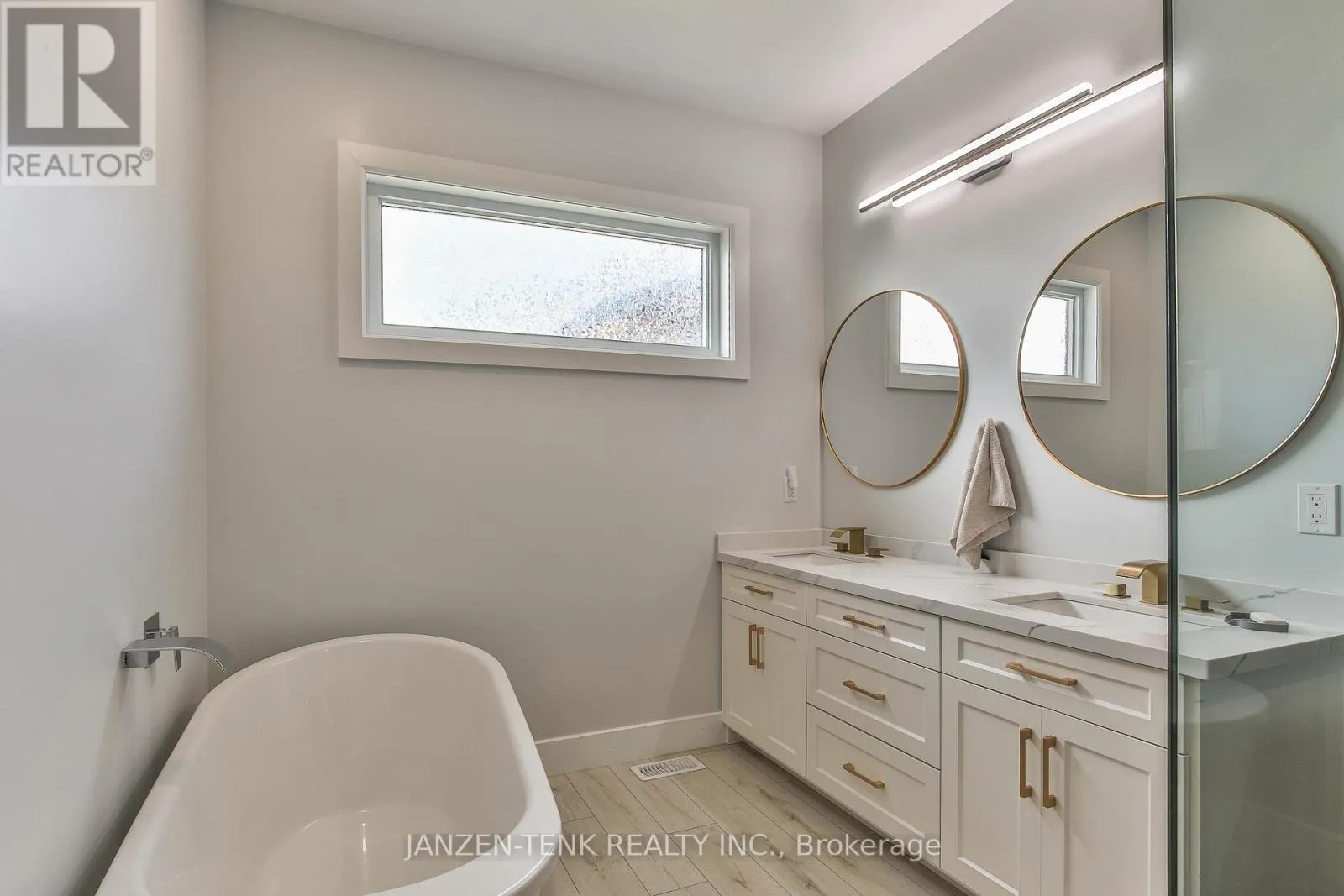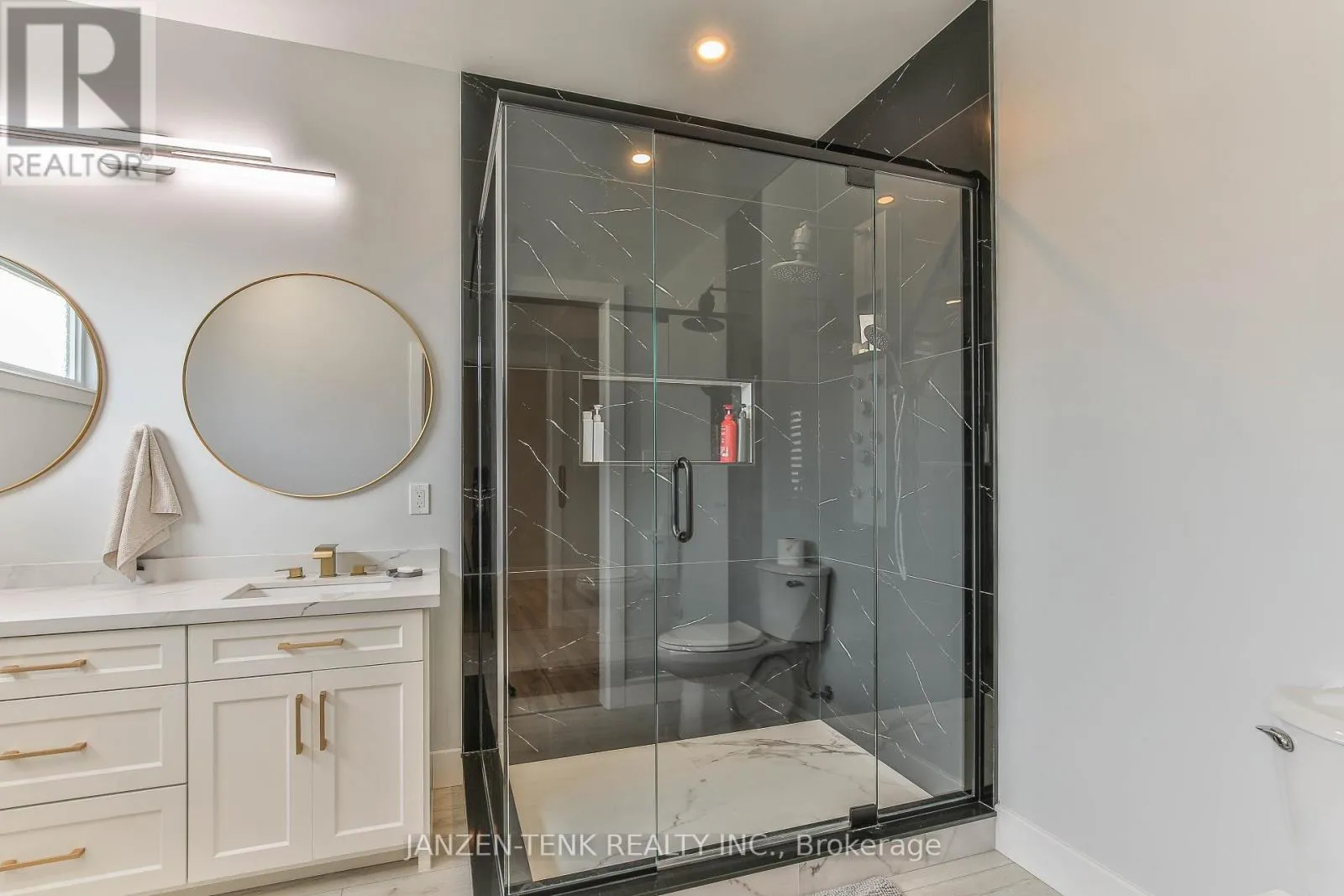 Cross Streets: Charles Court/Elizabeth St. ** Directions: From Elizabeth St, East On Charles Court, Property on South Side. Stunning 1-year-old 4-bedroom, 3-bath bungalow offering over 3,000 sq. ft. of finished living space. Exterior finished in Hardie board and stone. Features 9 ft ceilings throughout, large open-concept living area with electric fireplace, and walk-out to a private rear deck. Chef's kitchen includes quartz countertops, large island, walk-in pantry, and quality finishes.Primary bedroom features a 5 pc ensuite with glass shower, soaker tub, and walk-in closet. Main floor laundry and attached garage with double-wide concrete driveway for added convenience. Home is equipped with rough-ins for future hot tub and Generac generator. Spacious, modern, and move-in ready. Located within a short walking distance to a large public beach, restaurants, grocery store, gas bar and convenience, as well as a marina for your boat launch. Book your showing today! (id:27476)